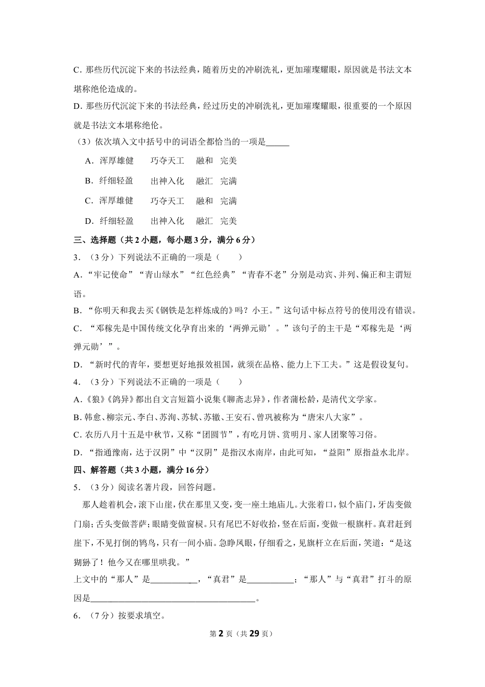 2019年湖南省益阳市中考语文试卷一、积累与运用(34分)1.(3分)下列词语中,加点字的注音或书写全都正确的一项是()A.襟怀(jīn)龟裂(jūn)云霄心不在焉B.附和(hè)喟叹(kuì)气概光采夺目C.侥幸(jiǎo)折腾(zhē)体贴别无二至D.誊写(téng)黄晕(yūn)陶冶不屑置辩二、解答题(共1小题,满分9分)2.(9分)阅读下面的语段,完成下列各题。_______._______._______,______.那些历史沉淀下来的书法经典,随着历史的冲刷洗礼,更加璀璨耀眼,很重要的一个原因就是书法文本堪称绝伦造成的。被誉为“天下第一行书”的《兰亭集序》,笔画(),潇洒流利,直观呈现了行书独特的字体风貌,展示出王羲之()的书法技艺,其文本内容()儒、道两家思想,描绘了兰亭的景致和聚会的乐趣,抒发了作者对盛事不常、“修短随化,终期于尽”的感叹。字体、技法和文本内容()结合,深刻体现出书者对所处时代文化精神的精准把握。(1)将下面的句子重新排列,填入文段开头空缺处最恰当的一项是①书法文本是书家精神品格和情感表达最直接的载体②任何艺术作品都是内容与形式的统一③受到历代书家的高度重视④作为书法,其内容就是书法文本A.①③④②B.②①④③C.②④①③D.④③①②(2)文中画横线的句子有语病,下列修改最恰当的一项是A.那些历代沉淀下来的书法经典,经过时间的冲刷洗礼,更加璀璨耀眼,很重要的一个原因就是书法文本堪称绝伦造成的。B.那些历代沉淀下来的书法经典,随着历史的冲刷洗礼,更加璀璨耀眼,很重要的一个原因就是书法文本堪称绝伦。第1页(共29页)C.那些历代沉淀下来的书法经典,随着历史的冲刷洗礼,更加璀璨耀眼,原因就是书法文本堪称绝伦造成的。D.那些历代沉淀下来的书法经典,经过历史的冲刷洗礼,更加璀璨耀眼,很重要的一个原因就是书法文本堪称绝伦。(3)依次填入文中括号中的词语全都恰当的一项是A.浑厚雄健巧夺天工融和完美B.纤细轻盈出神入化融汇完满C.浑厚雄健巧夺天工融和完满D.纤细轻盈出神入化融汇完美三、选择题(共2小题,每小题3分,满分6分)3.(3分)下列说法不正确的一项是()A.“牢记使命”“青山绿水”“红色经典”“青春不老”分别是动宾、并列、偏正和主谓短语。B.“你明天和我去买《钢铁是怎样炼成的》吗?小王。”这句话中标点符号的使用没有错误。C.“邓稼先是中国传统文化孕育出来的‘两弹元勋’。”该句子的主干是“邓稼先是‘两弹元勋’”。D.“新时代的青年,要想更好地报效祖国,就须在品格、能力上下工夫。”这是假设复句。4.(3分)下列说法不正确的一项是()A.《狼》《鸽异》都出自文言短篇小说集《聊斋志异》,作者蒲松龄,是清代文学家。B.韩愈、柳宗元、李白、苏洵、苏轼、苏辙、王安石、曾巩被称为“唐宋八大家”。C.农历八月十五是中秋节,又称“团圆节”,有吃月饼、赏明月、家人团聚等习俗。D.“指通豫南,达于汉阴”中“汉阴”是指汉水南岸,由此可知,“益阳”原指益水北岸。四、解答题(共3小题,满分16分)5.(3分)阅读名著片段,回答问题。那人趁着机会,滚下山崖,伏在那里又变,变一座土地庙儿。大张着口,似个庙门,牙齿变做门扇;舌头变做菩萨;眼睛变做窗棂。只有尾巴不好收拾,竖在后面,变做一根旗杆。真君赶到崖下,不见打倒的鸨鸟,只有一间小庙。急睁凤眼,仔细看之,见旗杆立在后面,笑道:“是这猢狲了!他今又在哪里哄我。”上文中的“那人”是,“真君”是;“那人”与“真君”打斗的原因是。6.(7分)按要求填空。第2页(共29页)(1)蒹葭苍苍,白露为霜。所谓伊人,。(《诗经•蒹葭》)(2)莫笑农家腊酒浑,。山重水复疑无路,。(陆游《游山西村》)(3)吾日三省吾身:??传不习乎?(《论语•学而》)(4)杜甫《望岳》中既表现诗人的凌云壮志又蕴含人生哲理的诗句是,。7.(6分)近年来,青少年沉迷网络短视频的问题越来越严重,调查显示,20%的青少年“几乎总是”在看短视频。为此,学校准备举行“防沉迷”综合性学习活动,请你完成以下任务。(1)国家网信办要求短视频平台研发防沉迷系统“青少年模式”,下面两幅图画的就是这...