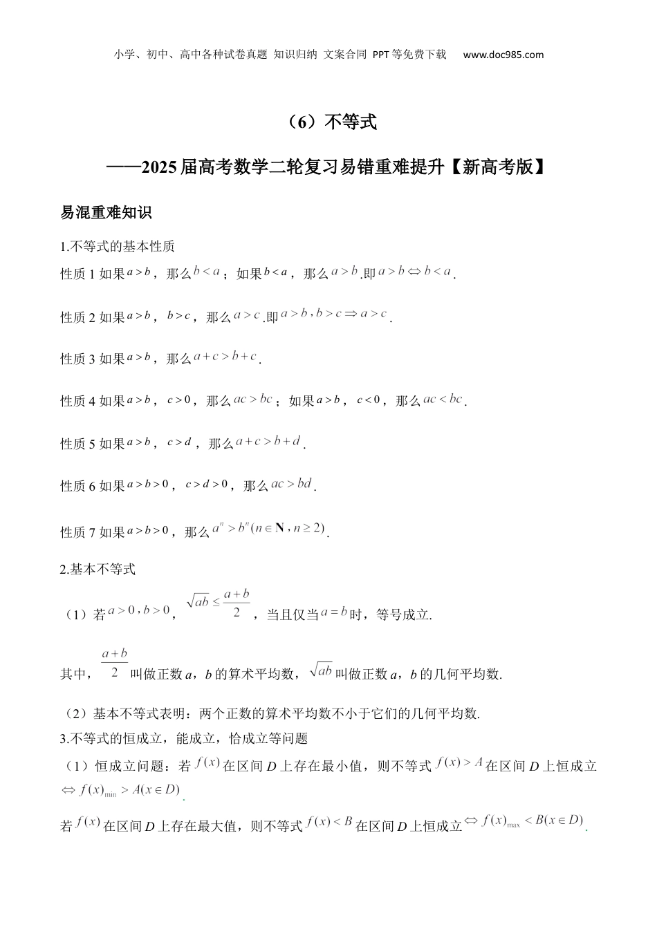 小学、初中、高中各种试卷真题知识归纳文案合同PPT等免费下载www.doc985.com(6)不等式——2025届高考数学二轮复习易错重难提升【新高考版】易混重难知识1.不等式的基本性质性质1如果ab,那么;如果ba,那么.即.性质2如果ab,bc,那么.即.性质3如果ab,那么.性质4如果ab,0c,那么;如果ab,0c,那么.性质5如果ab,cd,那么.性质6如果0ab,0cd,那么.性质7如果0ab,那么.2.基本不等式(1)若,,当且仅当时,等号成立.其中,叫做正数a,b的算术平均数,叫做正数a,b的几何平均数.(2)基本不等式表明:两个正数的算术平均数不小于它们的几何平均数.3.不等式的恒成立,能成立,恰成立等问题(1)恒成立问题:若在区间D上存在最小值,则不等式在区间D上恒成立.若在区间D上存在最大值,则不等式在区间D上恒成立.小学、初中、高中各种试卷真题知识归纳文案合同PPT等免费下载www.doc985.com(2)能成立问题:若在区间D上存在最大值,则在区间D上存在实数x使不等式成立.若在区间D上存在最小值,则在区间D上存在实数x使不等式成立.(3)恰成立问题:不等式恰在区间D上成立,的解集为D,不等式恰在区间D上成立,的解集为D.易错试题提升1.已知集合,,则()A.B.C.D.2.设,则下列不等式中成立的是()A.B.C.D.3.若对于任意的,不等式恒成立,则实数a的取值范围为()A.B.C.D.4.已知,,则的最小值为()A.6B.5C.4D.35.如果,那么下列不等式中正确的是()A.B.C.D.6.某批救灾物资随41辆汽车从某市以的速度匀速直达灾区,已知两地公路线长小学、初中、高中各种试卷真题知识归纳文案合同PPT等免费下载www.doc985.com,为安全起见,两辆汽车的间距不得小于(车长忽略不计),要使这批物资尽快全部到达灾区,则()A.70B.80C.90D.1007.若,则下列不等式一定成立的是()A.B.C.D.8.设实数x满足,函数的最小值为()A.B.C.D.69.(多选)下列说法正确的是()A.若,则B.若,则C.若,则D.若,,则10.(多选)若正实数a,b满足,则下列选项中正确的是()A.ab有最大值B.有最小值C.的最小值是10D.11.已知,,且满足,则的最小值为______________.小学、初中、高中各种试卷真题知识归纳文案合同PPT等免费下载www.doc985.com12.已知,,且,若恒成立,则实数m的取值范围__________.13.如图,在半径为4(单位:)的半圆形(O为圆心)铁皮上截取一块矩形材料ABCD,其顶点A,B在直径上,顶点C,D在圆周上,则矩形ABCD面积的最大值为__________(单位:).14.已知实数x,y,满足,,则的取值范围是_______.15.若实数x,y,m满足,则称x比y远离m.(1)若x比远离1,求实数x的取值范围;(2)若,,试问:x与哪一个更远离m,并说明理由.小学、初中、高中各种试卷真题知识归纳文案合同PPT等免费下载www.doc985.com答案以及解析1.答案:B解析:由,得,或,所以或.所以,由,得,所以.故选:B.2.答案:D解析:对A:若,则由,有,故错误;对B:若,则有,故错误;对C:若,则有,故错误;对D:由,则,,故,故正确.故选:D.3.答案:C解析:不等式可化为,,令,由题意可得,,当且仅当,即时等号成立,,所以实数a的取值范围为.故选:C.4.答案:D小学、初中、高中各种试卷真题知识归纳文案合同PPT等免费下载www.doc985.com解析:由于,,所以,由,(当且仅当时取等号),可得的最小值为3,故选:D.5.答案:D解析:当,时,对于A,,故A错误;对于B,,故B错误;对于C,,故C错误;对于D,,所以,即,则,故D正确.故选:D.6.答案:C解析:第一辆汽车到达灾区所用的时间为,由题意,知最短每隔到达一辆,则最后一辆汽车到达灾区所用的时间为,要使这批物资尽快全部到达灾区,小学、初中、高中各种试卷真题知识归纳文案合同PPT等免费下载www.doc985.com即要求最后一辆汽车到达灾区所用的时间最短,又,当且仅当,即时等号成立.故选C.7.答案:C解析:对于A,因为,故,即,故A错误;对于B,,无法判断,故B错误;对于C,因为,,故C正确;对于D,因为,故,即,故D错误.故选:C.8.答案:A解析:因为,所以,所以,当且仅当,即时,等号成立,所以函数的最小值为.故选:A.9.答案:BCD小学、初中、高中各...