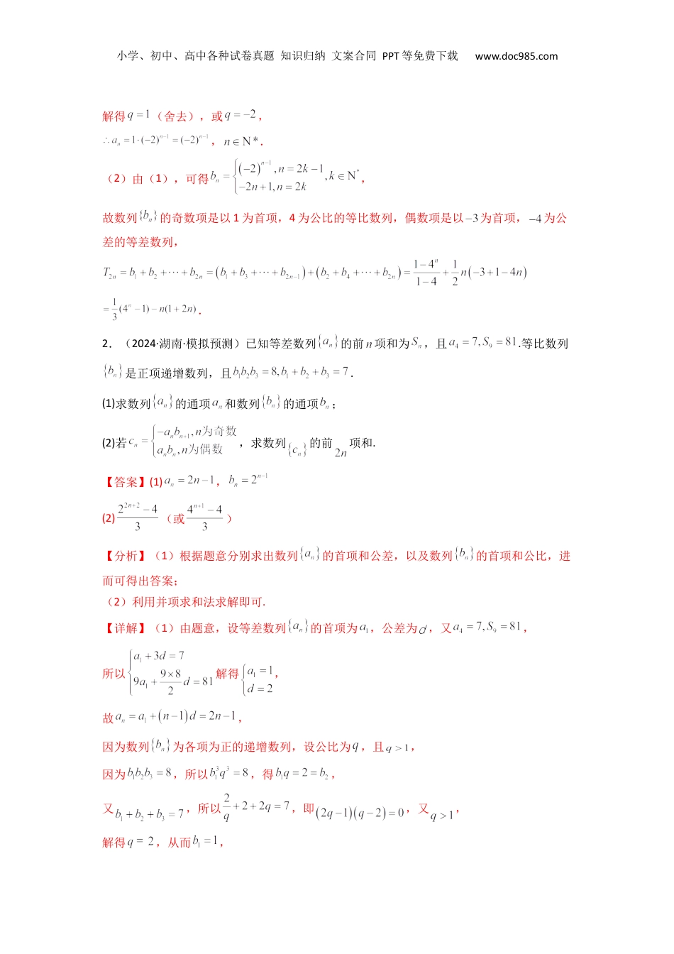 小学、初中、高中各种试卷真题知识归纳文案合同PPT等免费下载www.doc985.com专题08数列求和(奇偶项讨论求和)(典型题型归类训练)目录一、必备秘籍..............................................1二、典型题型..............................................2题型一:求的前项和...................2题型二:求的前项和....................7题型三:通项含有的类型;例如:...........13题型四:已知条件明确的奇偶项或含有三角函数问题........17三、专题08数列求和(奇偶项讨论求和)专项训练...........21一、必备秘籍有关数列奇偶项的问题是高考中经常涉及的问题,解决此类问题的难点在于搞清数列奇数项和偶数项的首项、项数、公差(比)等.本专题主要研究与数列奇偶项有关的问题,并在解决问题中让学生感悟分类讨论等思想在解题中的有效运用.因此,在数列综合问题中有许多可通过构造函数来解决.类型一:通项公式分奇、偶项有不同表达式;例如:角度1:求的前项和角度2:求的前项和小学、初中、高中各种试卷真题知识归纳文案合同PPT等免费下载www.doc985.com类型二:通项含有的类型;例如:类型三:已知条件明确的奇偶项或含有三角函数问题二、典型题型题型一:求的前项和1.(23-24高三上·江西·期末)已知等比数列的首项,公比为,的项和为且,,成等差数列.(1)求的通项:(2)若,,求的前项和.【答案】(1)(2)【分析】(1)根据题意,先验证不符合要求,然后再由列出方程,即可求得,从而得到通项公式;(2)根据题意,可得,其奇数次项依次构成一个首项为1,公比为4的等比数列,而偶数次项依次构成一个首项为,公差为的等差数列,然后结合数列求和的公式,代入计算即可得到结果.【详解】(1)由题意,若,由首项,可知,,此时,不符合题意,故,则由,可得化简整理,得,小学、初中、高中各种试卷真题知识归纳文案合同PPT等免费下载www.doc985.com解得(舍去),或,,.(2)由(1),可得,故数列的奇数项是以1为首项,4为公比的等比数列,偶数项是以为首项,为公差的等差数列,.2.(2024·湖南·模拟预测)已知等差数列的前项和为,且.等比数列是正项递增数列,且.(1)求数列的通项和数列的通项;(2)若,求数列的前项和.【答案】(1),(2)(或)【分析】(1)根据题意分别求出数列的首项和公差,以及数列的首项和公比,进而可得出答案;(2)利用并项求和法求解即可.【详解】(1)由题意,设等差数列的首项为,公差为,又,所以解得,故,因为数列为各项为正的递增数列,设公比为,且,因为,所以,得,又,所以,即,又,解得,从而,小学、初中、高中各种试卷真题知识归纳文案合同PPT等免费下载www.doc985.com所以;(2)由(1)得,所以,所以数列的前项和为(或).3.(2024·江西上饶·一模)设为正项数列的前项和,若,,成等差数列.(1)求数列的通项公式;(2)设,求数列的前2024项和.【答案】(1)()(2)【分析】(1)利用,得,两式作差,整理得是等差数列即可求解;(2)利用裂项相消和分组求和求解.【详解】(1)由已知得:,当时,,.当时,得.,数列是以2为首项2为公差的等差数列()小学、初中、高中各种试卷真题知识归纳文案合同PPT等免费下载www.doc985.com(2)由已知得:..4.(23-24高三上·河北·期末)在数列中,,且.(1)求的通项公式;(2)若,数列的前项和为,求【答案】(1)(2)【分析】(1)当时,,当时,得到,从而得到从第2项起成等比数列,即可得到答案.(2)根据(1)得到,当为大于1的奇数时,,当为偶数时,.再利用分组求和、错位相减求和即可得到答案.【详解】(1)小学、初中、高中各种试卷真题知识归纳文案合同PPT等免费下载www.doc985.com当时,,则.当时,由,得,则,则.因为,所以从第2项起成等比数列,.(2),当为大于1的奇数时,,当为偶数时,..,则,则,,则,则.5.(23-24高二上·浙江杭州·期末)已知正项数列的前项和为,且满足.(1)求数列的通项公式;(2)若,的前项和为,求.小学、初中、高中各种试卷真题知识归纳文案合同PPT等免费下载www.doc985.com【答案】(1)(2)【分析】(1)根据与的关系化简求解即可;(2...