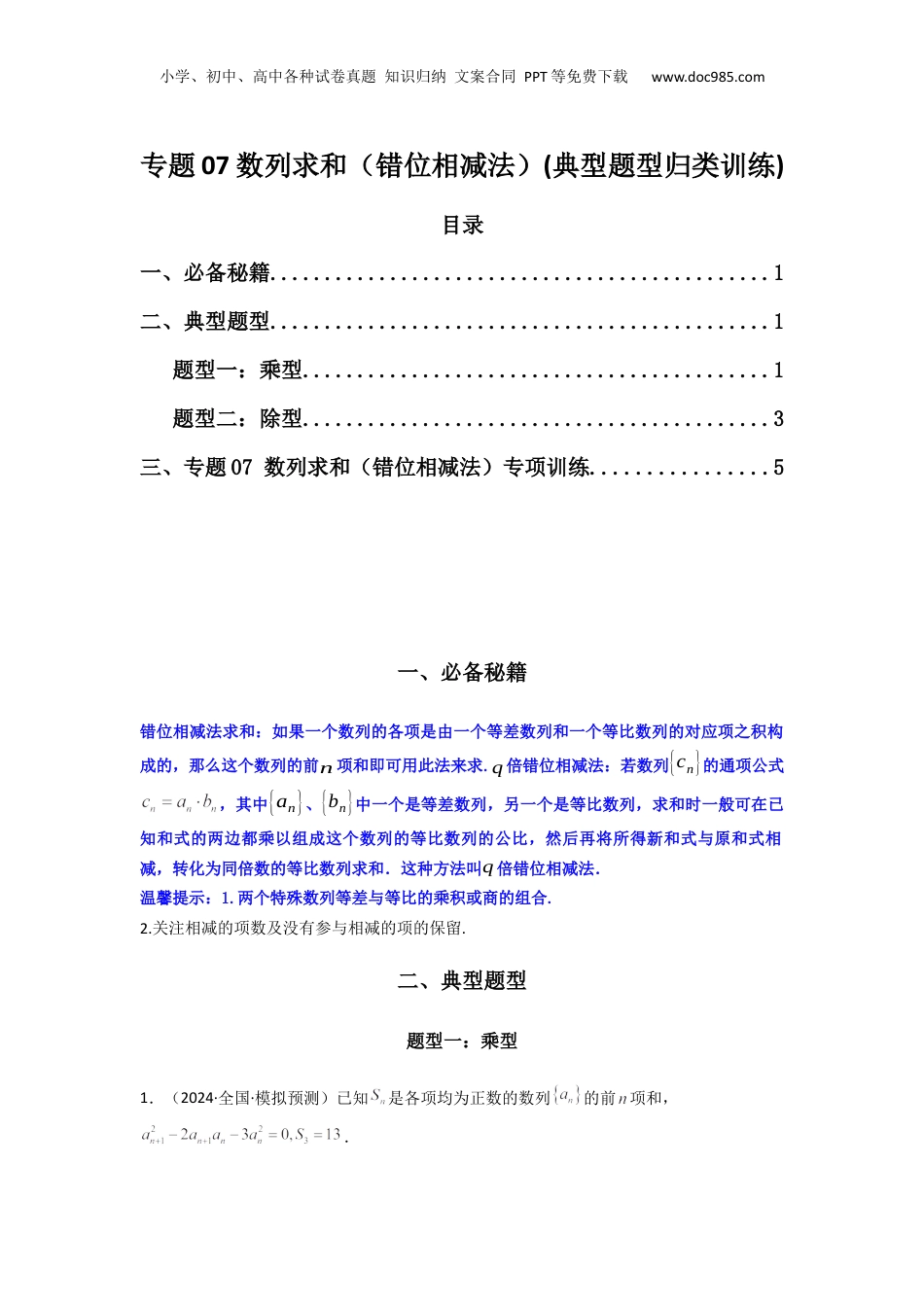 小学、初中、高中各种试卷真题知识归纳文案合同PPT等免费下载www.doc985.com专题07数列求和(错位相减法)(典型题型归类训练)目录一、必备秘籍..............................................1二、典型题型..............................................1题型一:乘型...........................................1题型二:除型...........................................3三、专题07数列求和(错位相减法)专项训练................5一、必备秘籍错位相减法求和:如果一个数列的各项是由一个等差数列和一个等比数列的对应项之积构成的,那么这个数列的前n项和即可用此法来求.q倍错位相减法:若数列{cn}的通项公式,其中{an}、{bn}中一个是等差数列,另一个是等比数列,求和时一般可在已知和式的两边都乘以组成这个数列的等比数列的公比,然后再将所得新和式与原和式相减,转化为同倍数的等比数列求和.这种方法叫q倍错位相减法.温馨提示:1.两个特殊数列等差与等比的乘积或商的组合.2.关注相减的项数及没有参与相减的项的保留.二、典型题型题型一:乘型1.(2024·全国·模拟预测)已知是各项均为正数的数列的前项和,.小学、初中、高中各种试卷真题知识归纳文案合同PPT等免费下载www.doc985.com(1)求数列的通项公式;(2)若,求数列的前项和.2.(23-24高二下·广东广州·阶段练习)已等差数列的前项和为,且.(1)求数列的通项公式及;(2)若,令,求数列的前项和.3.(2024·浙江宁波·二模)已知等差数列的公差为2,记数列的前项和为且满足.(1)证明:数列是等比数列;(2)求数列的前项和.4.(2024·四川成都·模拟预测)已知为数列的前项和,且.(1)求数列的通项公式;(2)设,求.小学、初中、高中各种试卷真题知识归纳文案合同PPT等免费下载www.doc985.com5.(23-24高三下·河南漯河·阶段练习)已知等差数列的前项和为,且,数列满足,设.(1)求的通项公式,并证明:;(2)设,求数列的前项和.题型二:除型1.(23-24高二下·辽宁沈阳·阶段练习)设数列满足,,且.(1)求证:数列为等差数列;(2)求数列的通项公式;(3)求数列的前项和.2.(23-24高二下·广东佛山·阶段练习)已知数列满足.小学、初中、高中各种试卷真题知识归纳文案合同PPT等免费下载www.doc985.com(1)求的通项公式;(2)求数列的前项和.3.(23-24高二下·云南昆明·阶段练习)已知等差数列的前项和为,且,.(1)求数列的通项公式;(2)证明:4.(23-24高二下·江西·阶段练习)已知等差数列满足,.单调递增的等比数列满足,且,,成等差数列.(1)求和的通项公式;(2)求数列的前n项和.5.(2024·全国·模拟预测)已知数列的前项和为,满足.小学、初中、高中各种试卷真题知识归纳文案合同PPT等免费下载www.doc985.com(1)求证:数列为等比数列;(2)设的前项和为,求.三、专题07数列求和(错位相减法)专项训练1.(23-24高二下·河南南阳·阶段练习)已知数列的前项和为,.(1)求数列的通项公式;(2)求数列的前项和.2.(23-24高二下·广东佛山·阶段练习)设数列的前n项和为,已知.(1)求数列的通项公式;(2)令,求数列的前n项和.小学、初中、高中各种试卷真题知识归纳文案合同PPT等免费下载www.doc985.com3.(23-24高二下·湖南长沙·阶段练习)已知等差数列的前n项和为,且,.(1)求数列的通项公式;(2)设,求数列的前n项和.4.(23-24高二下·河北石家庄·阶段练习)已知数列满足.(1)求数列的通项公式;(2)求数列的前项和.5.(23-24高二下·云南昆明·阶段练习)给出以下三个条件:①;②成等比数列;③.请从这三个条件中任选一个,补充到下面问题中,并完成作答.若选择多个条件分别作答,以第一个作答计分.已知公差不为0的等差数列的前项和为,_______.(1)求数列的通项公式;小学、初中、高中各种试卷真题知识归纳文案合同PPT等免费下载www.doc985.com(2)若,令,求数列的前项和.6.(23-24高一下·四川成都·开学考试)已知数列的首项为,且满足,数列满足.(1)求的通项公式;(2)设数列的前项和为,求.7.(2024·广东佛山·模拟预测)已知数列满足,且.(1)求数列的通项公式;小...