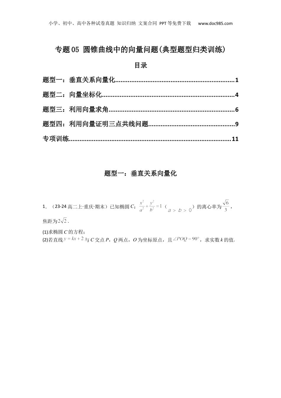小学、初中、高中各种试卷真题知识归纳文案合同PPT等免费下载www.doc985.com专题05圆锥曲线中的向量问题(典型题型归类训练)目录题型一:垂直关系向量化...................................................................1题型二:向量坐标化...........................................................................4题型三:利用向量求角.......................................................................6题型四:利用向量证明三点共线问题.................................................9专项训练............................................................................................11题型一:垂直关系向量化1.(23-24高二上·重庆·期末)已知椭圆C:()的离心率为,焦距为.(1)求椭圆C的方程;(2)若直线与C交点P,Q两点,O为坐标原点,且,求实数k的值.小学、初中、高中各种试卷真题知识归纳文案合同PPT等免费下载www.doc985.com2.(23-24高二上·云南大理·期中)已知椭圆的短轴长为2,点在椭圆上,与两焦点围成的三角形面积的最大值为.(1)求椭圆的标准方程;(2)当为椭圆的右顶点时,直线与椭圆相交于两点(异于点),且.试判断直线是否过定点?如果过定点,求出该定点的坐标;如果不过定点,请说明理由.3.(23-24高三上·山东临沂·期末)已知圆:的圆心为,圆:的圆心为,一动圆与圆内切,与圆外切,动圆的圆心的轨迹为曲线.(1)求曲线的方程:(2)已知点,直线不过点并与曲线交于两点,且,直线是否过定点?若过定点,求出定点坐标:若不过定点,请说明理由,小学、初中、高中各种试卷真题知识归纳文案合同PPT等免费下载www.doc985.com4.(23-24高二下·上海黄浦·期中)如图:双曲线的左、右焦点分别为,,过作直线l交y轴于点Q.(1)当直线l平行于的一条渐近线时,求点到直线l的距离;(2)当直线l的斜率为1时,在的右支上是否存在点P,满足?若存在,求出P点的坐标;若不存在,说明理由.5.(23-24高二上·浙江·阶段练习)已知抛物线,.(1)Q是抛物线上一个动点,求的最小值;(2)过点A作直线与该抛物线交于M、N两点,求的值.小学、初中、高中各种试卷真题知识归纳文案合同PPT等免费下载www.doc985.com题型二:向量坐标化1.(2024·安徽淮北·二模)如图,已知椭圆的左右焦点为,短轴长为为上一点,为的重心.(1)求椭圆的方程;(2)椭圆上不同三点,满足,且成等差数列,线段中垂线交轴于点,求点纵坐标的取值范围;(3)直线与交于点,交轴于点,若,求实数的取值范围.2.(2024高三·全国·专题练习)设直线l:与椭圆相交于A、B两个不同的点,与x轴相交于点F.(1)证明:;(2)若F是椭圆的一个焦点,且,求椭圆的方程.小学、初中、高中各种试卷真题知识归纳文案合同PPT等免费下载www.doc985.com3.(2024·湖北襄阳·模拟预测)设双曲线的左、右顶点分别为,,左、右焦点分别为,,,且的渐近线方程为,直线交双曲线于,两点.(1)求双曲线的方程;(2)当直线过点时,求的取值范围.4.(2024·全国·模拟预测)已知双曲线C的中心为坐标原点,对称轴为坐标轴,点在C上,点P与C的上、下焦点连线所在直线的斜率之积为.(1)求双曲线C的标准方程;(2)经过点的直线与双曲线C交于E,F两点(异于点P),过点F作平行于x轴的直线,直线PE与交于点D,且求直线AB的斜率.小学、初中、高中各种试卷真题知识归纳文案合同PPT等免费下载www.doc985.com5.(23-24高二上·江苏常州·期末)如图,已知抛物线的方程为,焦点为,过抛物线内一点作抛物线准线的垂线,垂足为,与抛物线交于点,已知,,.(1)求的值;(2)斜率为的直线过点,且与曲线交于不同的两点,,若存在,使得,求实数的取值范围.小学、初中、高中各种试卷真题知识归纳文案合同PPT等免费下载www.doc985.com题型三:利用向量求角1.(23-24高二上·贵州贵阳·阶段练习)已知椭圆:过点,,分别为椭圆的左、右焦点,且离心率.(1)求椭圆的方程;(2)过点且斜率为的直线与椭圆交于,两点,若为钝角,求的取值范围.2.(2024·重庆·三模)已知椭圆的上、下顶点分别为,左顶点为,是面积为的正三角形.(1...