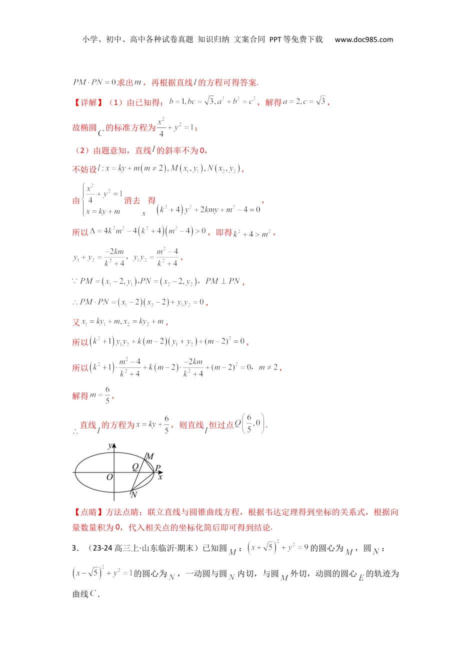 小学、初中、高中各种试卷真题知识归纳文案合同PPT等免费下载www.doc985.com专题05圆锥曲线中的向量问题(典型题型归类训练)目录题型一:垂直关系向量化...................................................................1题型二:向量坐标化...........................................................................7题型三:利用向量求角.....................................................................16题型四:利用向量证明三点共线问题...............................................23专项训练............................................................................................28题型一:垂直关系向量化1.(23-24高二上·重庆·期末)已知椭圆C:()的离心率为,焦距为.(1)求椭圆C的方程;(2)若直线与C交点P,Q两点,O为坐标原点,且,求实数k的值.【答案】(1)(2)【分析】(1)由焦距及离心率求出椭圆的方程;(2)联立直线和椭圆的方程,得,,由得,求得k的值.【详解】(1)由题,,所以,,小学、初中、高中各种试卷真题知识归纳文案合同PPT等免费下载www.doc985.com椭圆的方程为.(2)设,,联立方程组,得,则,即,,,因为,所以,即,得,满足,合题意.所以.2.(23-24高二上·云南大理·期中)已知椭圆的短轴长为2,点在椭圆上,与两焦点围成的三角形面积的最大值为.(1)求椭圆的标准方程;(2)当为椭圆的右顶点时,直线与椭圆相交于两点(异于点),且.试判断直线是否过定点?如果过定点,求出该定点的坐标;如果不过定点,请说明理由.【答案】(1)(2)过定点【分析】(1)由已知可推得,即可得到椭圆标准方程;(2)设,与椭圆方程联立,利用韦达定理代入小学、初中、高中各种试卷真题知识归纳文案合同PPT等免费下载www.doc985.com求出,再根据直线的方程可得答案.【详解】(1)由已知得:,解得,故椭圆的标准方程为;(2)由题意知,直线的斜率不为0,不妨设,由消去得,所以,即得,,,,又,所以,所以,解得,直线的方程为,则直线恒过点.【点睛】方法点睛:联立直线与圆锥曲线方程,根据韦达定理得到坐标的关系式,根据向量数量积为0,代入相关点的坐标化简后即可得到结论.3.(23-24高三上·山东临沂·期末)已知圆:的圆心为,圆:的圆心为,一动圆与圆内切,与圆外切,动圆的圆心的轨迹为曲线.小学、初中、高中各种试卷真题知识归纳文案合同PPT等免费下载www.doc985.com(1)求曲线的方程:(2)已知点,直线不过点并与曲线交于两点,且,直线是否过定点?若过定点,求出定点坐标:若不过定点,请说明理由,【答案】(1),;(2)直线恒过点,,理由见解答.【分析】(1)由题意,,,,,结合双曲线的定义求解即可得结论;(2)设直线的方程为,联立直线和双曲线的方程消元后,应用韦达定理,结合条件,可得,化简整理即可求解.【详解】(1)如图,设圆的圆心为,半径为,由题可得圆半径为3,圆半径为1,则,,所以,由双曲线定义可知,的轨迹是以,为焦点、实轴长为4的双曲线的右支,又,,,,所以动圆的圆心的轨迹方程为,,即曲线的方程为,.(2)设直线的方程为,联立,消去得,由题意直线与曲线有两个交点,则,设,,,,其中,,由韦达定理得:,,小学、初中、高中各种试卷真题知识归纳文案合同PPT等免费下载www.doc985.com又点,所以,,,,因为,所以,则,即,解得舍去),当,直线的方程为,,故直线恒过点,.【点睛】圆锥曲线中定点问题的两种解法(1)引进参数法:先引进动点的坐标或动线中系数为参数表示变化量,再研究变化的量与参数何时没有关系,找到定点.(2)特殊到一般法:先根据动点或动线的特殊情况探索出定点,再证明该定点与变量无关.技巧:若直线方程为,则直线过定点;若直线方程为(为定值),则直线过定点4.(23-24高二下·上海黄浦·期中)如图:双曲线的左、右焦点分别为,,过作直线l交y轴于点Q.(1)当直线l平行于的一条渐近线时,求点到直线l的距离;(2)当直线l的斜率为1时,在的右支上是否存在点P,满足?若存在,求出P点的坐标;若不存在,说明理由.【答案】(1)2(2)不存在,理由见解析【分析】(1...