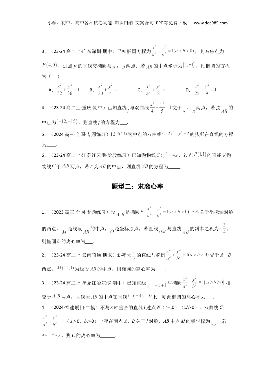 小学、初中、高中各种试卷真题知识归纳文案合同PPT等免费下载www.doc985.com专题02圆锥曲线中的中点弦问题(点差法+联立法)目录一、必备秘籍......................................................................................1二、典型题型......................................................................................2题型一:求直线方程.....................................................................2题型二:求离心率.........................................................................3题型三:求弦中点的轨迹方程......................................................4题型四:求曲线方程.....................................................................6题型五:处理存在性问题..............................................................7题型六:确定参数的取值范围......................................................9题型七:定值问题.......................................................................11三、专项训练....................................................................................13一、必备秘籍1、相交弦中点(点差法)直线与曲线相交,涉及到交线中点的题型,多数用点差法。按下面方法整理出式子,然后根据实际情况处理该式子。主要有以下几种问题:(1)求中点坐标;(2)求中点轨迹方程;(3)求直线方程;(4)求曲线;中点M(x0,y0),x0=x1+x22,y0=y1+y222、点差法设直线和曲线的两个交点A(x1,y1),B(x2,y2),代入椭圆方程,得x12a2+y12b2=1;小学、初中、高中各种试卷真题知识归纳文案合同PPT等免费下载www.doc985.comx22a2+y22b2=1;将两式相减,可得x12−x22a2+y12−y22b2=0;(x1+x2)(x1−x2)a2=−(y1+y2)(y1−y2)b2;最后整理得:1=−a2(y1+y2)(y1−y2)b2(x1+x2)(x1−x2)⇒1=−k⋅a2b2⋅y0x0同理,双曲线用点差法,式子可以整理成:1=a2(y1+y2)(y1−y2)b2(x1+x2)(x1−x2)⇒1=k⋅a2b2⋅y0x0设直线和曲线的两个交点A(x1,y1),B(x2,y2),代入抛物线方程,得y12=2px1;y22=2px2;将两式相减,可得(y1−y2)(y1+y2)=2p(x1−x2);整理得:y1−y2x1−x2=2py1+y2二、典型题型题型一:求直线方程1.(2024·全国·模拟预测)已知斜率为的直线与椭圆交于,两点,为坐标原点,以,为邻边作平行四边形,点恰好在上.若线段的中点在直线上,则直线的方程为()A.B.C.D.2.(23-24高二上·山东·期中)已知中心在原点,半焦距为4的椭圆(,,)被直线方程截得的弦的中点横坐标为,则椭圆的标准方程为()A.B.C.或D.或小学、初中、高中各种试卷真题知识归纳文案合同PPT等免费下载www.doc985.com3.(23-24高二上·广东深圳·期中)已知椭圆方程为,其右焦点为,过点的直线交椭圆与,两点.若的中点坐标为,则椭圆的方程为()A.B.C.D.4.(23-24高二上·重庆·期中)已知直线与双曲线交于、两点,若弦的中点为,则直线的方程为.5.(2024高三·全国·专题练习)以为中点的双曲线的弦所在直线的方程为.6.(23-24高二上·江苏连云港·阶段练习)已知抛物线,过点的直线交抛物线于两点,若为的中点,则直线的方程为.题型二:求离心率1.(2023高三·全国·专题练习)设是椭圆上不关于坐标轴对称的两点,是线段的中点,是坐标原点,若直线与直线的斜率之积为,则椭圆的离心率为.2.(23-24高二上·云南昭通·期末)斜率为的直线与椭圆交于A,B两点,为线段的中点,则椭圆的离心率为.3.(23-24高二上·黑龙江哈尔滨·期中)已知直线与椭圆相交于两点,且线段的中点在直线上,则此椭圆的离心率为.4.(2024·福建厦门·二模)不与x轴重合的直线l过点N(,0)(xN≠0),双曲线C:(a>0,b>0)上存在两点A、B关于l对称,AB中点M的横坐标为.若,则C的离心率为.小学、初中、高中各种试卷真题知识归纳文案合同PPT等免费下载www.doc985.com5.(23-24高三·重庆渝中·阶段练习)已知双曲线的左、右焦点分别为,,过作直线l与双曲线的左、右两支分别交于A,B两点,设P...