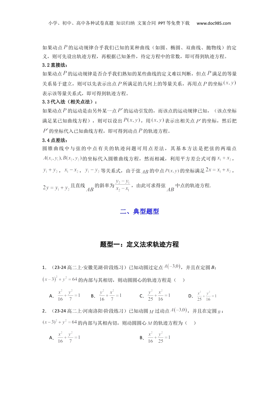 小学、初中、高中各种试卷真题知识归纳文案合同PPT等免费下载www.doc985.com专题01圆锥曲线中的轨迹方程问题(典型题型归类训练)目录一、必备秘籍......................................................................................1二、典型题型......................................................................................2题型一:定义法求轨迹方程..........................................................2题型二:直接法.............................................................................3题型三:代入法(相关点法)......................................................4题型四:点差法.............................................................................5三、专项训练......................................................................................6一、必备秘籍1、曲线方程的定义一般地,如果曲线与方程之间有以下两个关系:①曲线上的点的坐标都是方程的解;②以方程的解为坐标的点都是曲线上的点.此时,把方程叫做曲线的方程,曲线叫做方程的曲线.2、求曲线方程的一般步骤:(1)建立适当的直角坐标系(如果已给出,本步骤省略);(2)设曲线上任意一点的坐标为;(3)根据曲线上点所适合的条件写出等式;(4)用坐标yx、表示这个等式,并化简;(5)确定化简后的式子中点的范围.上述五个步骤可简记为:求轨迹方程的步骤:建系、设点、列式、化简、确定点的范围.3、求轨迹方程的方法:3.1定义法:小学、初中、高中各种试卷真题知识归纳文案合同PPT等免费下载www.doc985.com如果动点的运动规律合乎我们已知的某种曲线(如圆、椭圆、双曲线、抛物线)的定义,则可先设出轨迹方程,再根据已知条件,待定方程中的常数,即可得到轨迹方程。3.2直接法:如果动点的运动规律是否合乎我们熟知的某些曲线的定义难以判断,但点满足的等量关系易于建立,则可以先表示出点所满足的几何上的等量关系,再用点的坐标表示该等量关系式,即可得到轨迹方程。3.3代入法(相关点法):如果动点的运动是由另外某一点的运动引发的,而该点的运动规律已知,(该点坐标满足某已知曲线方程),则可以设出,用表示出相关点的坐标,然后把的坐标代入已知曲线方程,即可得到动点的轨迹方程。3.4点差法:圆锥曲线中与弦的中点有关的轨迹问题可用点差法,其基本方法是把弦的两端点的坐标代入圆锥曲线方程,然而相减,利用平方差公式可得,,,等关系式,由于弦的中点的坐标满足,且直线的斜率为,由此可求得弦中点的轨迹方程.二、典型题型题型一:定义法求轨迹方程1.(23-24高二上·安徽芜湖·阶段练习)已知动圆过定点,并且在定圆B:的内部与其相切,则动圆圆心的轨迹方程是()A.B.C.D.2.(23-24高二上·河南洛阳·阶段练习)已知动圆过动点,并且在定圆:的内部与其相内切,则动圆圆心的轨迹方程为()A.B.小学、初中、高中各种试卷真题知识归纳文案合同PPT等免费下载www.doc985.comC.D.3.(24-25高二上·上海·课堂例题)已知动圆P与圆M:,圆N:均外切,记圆心P的运动轨迹为曲线C,则C的方程为()A.B.C.D.4.(23-24高二上·新疆乌鲁木齐·期末)一动圆过定点,且与已知圆:相切,则动圆圆心P的轨迹方程是()A.B.C.D.5.(23-24高二上·宁夏石嘴山·阶段练习)一个动圆与定圆:相内切,且与定直线相切,则此动圆的圆心M的轨迹方程是()A.B.C.D.6.(23-24高二上·全国·课前预习)已知动圆M与直线y=2相切,且与定圆外切,则动圆圆心M的轨迹方程为()A.B.C.D.题型二:直接法1.(23-24高二上·广东深圳·期末)已知,若动点P满足直线与直线的斜率之积为,则动点P的轨迹方程为()A.B.C.D.2.(23-24高一上·安徽六安·期末)已知点的坐标分别为,直线相交于点,且直线的斜率与直线的斜率的差是1,则点的轨迹方程为()小学、初中、高中各种试卷真题知识归纳文案合同PPT等免费下载www.doc985.comA.B.C.D.3.(23-24高二上·河北邯郸·期末)在平面直角坐标系中,已知定点,,直线与直...