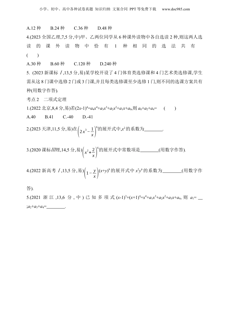 小学、初中、高中各种试卷真题知识归纳文案合同PPT等免费下载www.doc985.com2025版新教材高考数学第二轮复习专题九计数原理、概率与统计9.1计数原理五年高考高考新风向1.(2024全国甲理,13,5分,中)(13+x)10的展开式中,各项系数中的最大值为.2.(创新考法)(2024新课标Ⅰ,14,5分,难)甲、乙两人各有四张卡片,每张卡片上标有一个数字,甲的卡片上分别标有数字1,3,5,7,乙的卡片上分别标有数字2,4,6,8,两人进行四轮比赛,在每轮比赛中,两人各自从自己持有的卡片中随机选一张,并比较所选卡片上数字的大小,数字大的人得1分,数字小的人得0分,然后各自弃置此轮所选的卡片(弃置的卡片在此后的轮次中不能使用).则四轮比赛后,甲的总得分不小于2的概率为.3.(创新考法)(2024新课标Ⅱ,14,5分,难)在右图的4×4的方格表中选4个方格,要求每行和每列均恰有一个方格被选中,则共有种选法.在所有符合上述要求的选法中,选中方格中的4个数之和的最大值是.考点1计数原理、排列与组合1.(2023新课标Ⅱ,3,5分,易)某学校为了解学生参加体育运动的情况,用比例分配的分层随机抽样方法作抽样调查,拟从初中部和高中部两层共抽取60名学生,已知该校初中部和高中部分别有400名和200名学生,则不同的抽样结果共有()A.C40045·C20015种B.C40020·C20040种C.C40030·C20030种D.C40040·C20020种2.(2020新高考Ⅰ,3,5分,易)6名同学到甲、乙、丙三个场馆做志愿者,每名同学只去1个场馆,甲场馆安排1名,乙场馆安排2名,丙场馆安排3名,则不同的安排方法共有()A.120种B.90种C.60种D.30种3.(2022新高考Ⅱ,5,5分,易)甲、乙、丙、丁、戊5名同学站成一排参加文艺汇演,若甲不站在两端,丙和丁相邻,则不同的排列方式共有()小学、初中、高中各种试卷真题知识归纳文案合同PPT等免费下载www.doc985.comA.12种B.24种C.36种D.48种4.(2023全国乙理,7,5分,中)甲、乙两位同学从6种课外读物中各自选读2种,则这两人选读的课外读物中恰有1种相同的选法共有()A.30种B.60种C.120种D.240种5.(2023新课标Ⅰ,13,5分,易)某学校开设了4门体育类选修课和4门艺术类选修课,学生需从这8门课中选修2门或3门课,并且每类选修课至少选修1门,则不同的选课方案共有种(用数字作答).考点2二项式定理1.(2022北京,8,4分,易)若(2x-1)4=a4x4+a3x3+a2x2+a1x+a0,则a0+a2+a4=()A.40B.41C.-40D.-412.(2023天津,11,5分,易)在(2x3−1x)6的展开式中,x2的系数为.3.(2020课标Ⅲ理,14,5分,易)(x2+2x)6的展开式中常数项是(用数字作答).4.(2022新高考Ⅰ,13,5分,易)(1−yx)(x+y)8的展开式中x2y6的系数为(用数字作答).5.(2021浙江,13,6分,中)已知多项式(x-1)3+(x+1)4=x4+a1x3+a2x2+a3x+a4,则a1=;a2+a3+a4=.小学、初中、高中各种试卷真题知识归纳文案合同PPT等免费下载www.doc985.com三年模拟练速度1.(2024东北三省三校第二次联考,3)按分层抽样的方法,从15个相同的红球和10个相同的黑球中抽出10个球排成一排,则不同的排列方法为()A.C2510A1010B.C156C104A1010C.C104D.A66A442.(2024河北邯郸第三次调研,4)在(x3−2x)6的展开式中,1x2的系数为()A.-192B.-6C.6D.1923.(2024江西4月教学质量检测,3)已知(x+2x)n的展开式中只有第3项的二项式系数最大,则展开式的常数项为()A.24B.18C.12D.64.(2024浙江杭州二模,6)将5名志愿者分配到三个社区协助开展活动,每个社区至少1名,则不同的分配方法数是()A.300B.240C.150D.505.(2024福建厦门毕业班第四次质检,6)某校5名同学到A、B、C三家公司实习,每名同学只能去1家公司,每家公司至多接收2名同学.若同学甲去A公司,则不同的安排方法共有()A.18种B.30种C.42种D.60种6.(2024重庆二诊,6)有男、女教师各1人,男、女学生各2人,从中选派3人参加一项活动,要求其中至少有1名女性,并且至少有1名教师,则不同的选派方案有()A.10种B.12种C.15种D.20种7.(2024安徽江淮十校联考,3)学校食堂的一个窗口共卖5种菜,甲、乙2名同学每人从中选一种或两种,且两人之间不会互相影响,则不同的选法种数为()A.20B.25C.225D.4508.(2024山东淄博一模,5)小明设置六位数字的手机密码时,计划将自然对数的底数e=2.71828…的前6位数字2,7,1,8,2,8进行某种排列得到密码.若排列时要求相同数字不相邻,且相同数...