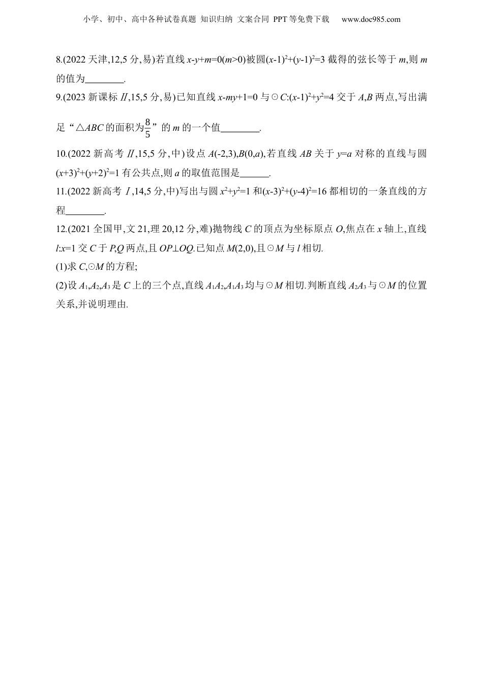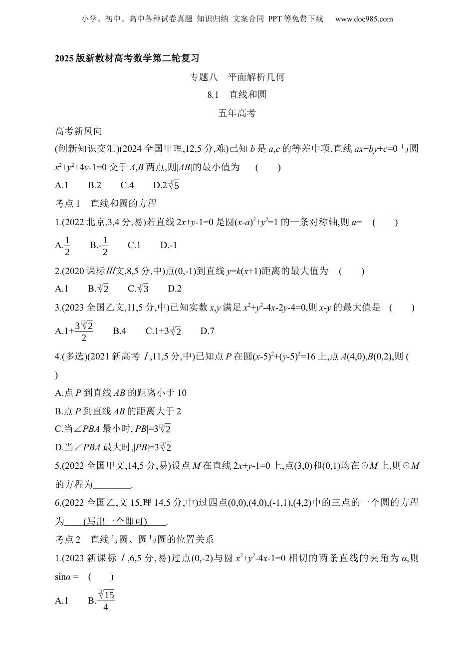小学、初中、高中各种试卷真题知识归纳文案合同PPT等免费下载www.doc985.com2025版新教材高考数学第二轮复习专题八平面解析几何8.1直线和圆五年高考高考新风向(创新知识交汇)(2024全国甲理,12,5分,难)已知b是a,c的等差中项,直线ax+by+c=0与圆x2+y2+4y-1=0交于A,B两点,则|AB|的最小值为()A.1B.2C.4D.2❑√5考点1直线和圆的方程1.(2022北京,3,4分,易)若直线2x+y-1=0是圆(x-a)2+y2=1的一条对称轴,则a=()A.12B.-12C.1D.-12.(2020课标Ⅲ文,8,5分,中)点(0,-1)到直线y=k(x+1)距离的最大值为()A.1B.❑√2C.❑√3D.23.(2023全国乙文,11,5分,中)已知实数x,y满足x2+y2-4x-2y-4=0,则x-y的最大值是()A.1+3❑√22B.4C.1+3❑√2D.74.(多选)(2021新高考Ⅰ,11,5分,中)已知点P在圆(x-5)2+(y-5)2=16上,点A(4,0),B(0,2),则()A.点P到直线AB的距离小于10B.点P到直线AB的距离大于2C.当∠PBA最小时,|PB|=3❑√2D.当∠PBA最大时,|PB|=3❑√25.(2022全国甲文,14,5分,易)设点M在直线2x+y-1=0上,点(3,0)和(0,1)均在☉M上,则☉M的方程为.6.(2022全国乙,文15,理14,5分,中)过四点(0,0),(4,0),(-1,1),(4,2)中的三点的一个圆的方程为(写出一个即可).考点2直线与圆、圆与圆的位置关系1.(2023新课标Ⅰ,6,5分,易)过点(0,-2)与圆x2+y2-4x-1=0相切的两条直线的夹角为α,则sinα=()A.1B.❑√154小学、初中、高中各种试卷真题知识归纳文案合同PPT等免费下载www.doc985.comC.❑√104D.❑√642.(2020课标Ⅰ文,6,5分,中)已知圆x2+y2-6x=0,过点(1,2)的直线被该圆所截得的弦的长度的最小值为()A.1B.2C.3D.43.(2023全国甲,文9,理8,5分,中)已知双曲线C:x2a2-y2b2=1(a>0,b>0)的离心率为❑√5,C的一条渐近线与圆(x-2)2+(y-3)2=1交于A,B两点,则|AB|=()A.❑√55B.2❑√55C.3❑√55D.4❑√554.(2020课标Ⅲ理,10,5分,中)若直线l与曲线y=❑√x和圆x2+y2=15都相切,则l的方程为()A.y=2x+1B.y=2x+12C.y=12x+1D.y=12x+125.(2020课标Ⅰ理,11,5分,中)已知☉M:x2+y2-2x-2y-2=0,直线l:2x+y+2=0,P为l上的动点.过点P作☉M的切线PA,PB,切点为A,B,当|PM|·|AB|最小时,直线AB的方程为()A.2x-y-1=0B.2x+y-1=0C.2x-y+1=0D.2x+y+1=06.(2023全国乙理,12,5分,难)已知☉O的半径为1,直线PA与☉O相切于点A,直线PB与☉O交于B,C两点,D为BC的中点.若|PO|=❑√2,则⃗PA·⃗PD的最大值为()A.12+❑√22B.12+❑√2C.1+❑√2D.2+❑√27.(多选)(2021新高考Ⅱ,11,5分,中)已知直线l:ax+by-r2=0与圆C:x2+y2=r2,点A(a,b),则下列说法正确的是()A.若点A在圆C上,则直线l与圆C相切B.若点A在圆C内,则直线l与圆C相离C.若点A在圆C外,则直线l与圆C相离D.若点A在直线l上,则直线l与圆C相切小学、初中、高中各种试卷真题知识归纳文案合同PPT等免费下载www.doc985.com8.(2022天津,12,5分,易)若直线x-y+m=0(m>0)被圆(x-1)2+(y-1)2=3截得的弦长等于m,则m的值为.9.(2023新课标Ⅱ,15,5分,易)已知直线x-my+1=0与☉C:(x-1)2+y2=4交于A,B两点,写出满足“△ABC的面积为85”的m的一个值.10.(2022新高考Ⅱ,15,5分,中)设点A(-2,3),B(0,a),若直线AB关于y=a对称的直线与圆(x+3)2+(y+2)2=1有公共点,则a的取值范围是.11.(2022新高考Ⅰ,14,5分,中)写出与圆x2+y2=1和(x-3)2+(y-4)2=16都相切的一条直线的方程.12.(2021全国甲,文21,理20,12分,难)抛物线C的顶点为坐标原点O,焦点在x轴上,直线l:x=1交C于P,Q两点,且OP⊥OQ.已知点M(2,0),且☉M与l相切.(1)求C,☉M的方程;(2)设A1,A2,A3是C上的三个点,直线A1A2,A1A3均与☉M相切.判断直线A2A3与☉M的位置关系,并说明理由.小学、初中、高中各种试卷真题知识归纳文案合同PPT等免费下载www.doc985.com三年模拟练速度1.(2024辽宁大连三校一模,4)过点(-1,1)和(1,3),且圆心在x轴上的圆的方程为()A.x2+y2=4B.(x-2)2+y2=8C.(x-1)2+y2=5D.(x-2)2+y2=102.(2024山东泰安一轮检测,3)在平面内,M,N是两个定点,P是动点,若⃗MP·⃗NP=4,则点P的轨迹为(D)A.椭圆B.抛物线C.直线D.圆3.(2024广东一模,4)过A(-1,0),B(0,3),C(9,0)三点的圆与y轴交于M,N两点,则|MN|=()A.3B.4C.8D.64.(2024广东广州天河二模,6)若直线ax+by=1与圆O:x2+y2=1相切,则圆(x-a)2+(y-b)2=14与圆O()A.外切B.相交C.内切D....