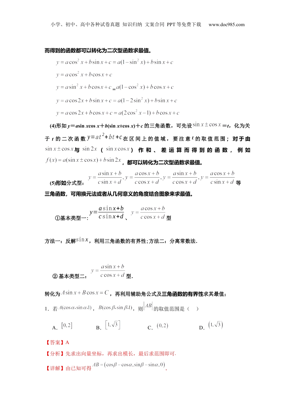 小学、初中、高中各种试卷真题知识归纳文案合同PPT等免费下载www.doc985.com考点巩固卷08三角函数的图象及性质(六大考点)考点01:三角函数的定义域与值域1、三角函数定义域的求法求三角函数定义域实际上是构造简单的三角不等式(组),常借助三角函数线或三角函数图象来求解.注:解三角不等式时要注意周期,且k∈Z不可以忽略.(1)分式:分母不能为零;(2)根式:偶次根式中根号内的式子大于等于0,(如,只要求)对奇次根式中的被开方数的正负没有要求;(若偶次根式单独作为分母,只要偶次根式根号内的式子小学、初中、高中各种试卷真题知识归纳文案合同PPT等免费下载www.doc985.com大于0即可,如,只要求)(3)零次幂:中底数;(4)对数函数:对数函数中真数大于零,底数为大于0且不等于;(5)三角函数:正弦函数的定义域为,余弦函数的定义域为,正切函数的定义域为若,则2、求解三角函数的值域(最值)常见的题目类型(1)形如或的三角函数,可利用三角函数的有界性求值域(2)形如y=asinωx+bcosωx+k的三角函数,可设sinϕ=b√a2+b2,cosϕ=a√a2+b2逆用和角公式得到y=Asin(ωx+φ)+k,化为一次函数y=kx+b型,再求值域(最值);对于由两类函数作和、差、乘运算而得到的函数;例如①(特别的可先用和差角公式展开化为y=asinωx+bcosωx+k的形式;②即逆用倍角公式化为y=asinωx+bcosωx+k的形式;进一步都可以转化为y=Asin(ωx+φ)+k的形式,然后结合一次函数求最值。总结:逆用两角和与差的正弦(或余弦)公式、倍角公式转化为一次函数y=kx+b型,再由三角函数的有界性得解.(其中x为正弦或余弦函数,k,b为常数)(3)形如y=asin2x+bsinx+c的三角函数,可先设sinx=t,化为关于t的二次函数y=at2+bt+c求值域(最值),小心定义域对值域的限制;对于由与,由与作和、差运算小学、初中、高中各种试卷真题知识归纳文案合同PPT等免费下载www.doc985.com而得到的函数都可以转化为二次型函数求最值。=(4)形如y=asinxcosx+b(sinx±cosx)+c的三角函数,可先设=t,化为关于t的二次函数y=at2+bt+c在区间上的值域,要注意t的取值范围;对于由与()作和、差运算而得到的函数,例如,都可以转化为二次型函数求最值。(5)形如分式型:等三角函数,可用换元法或者从几何意义的角度结合图象来求最值。①基本类型一:y=asinx+bcsinx+d、型方法一:反解sinx,利用三角函数的有界性;方法二:分离常数法.②基本类型二:型.转化为,再利用辅助角公式及三角函数的有界性求其最值;1.若,,则的取值范围是()A.B.C.D.【答案】A【分析】先求出向量坐标,再求出模长,最后求范围即可.【详解】由已知可得,小学、初中、高中各种试卷真题知识归纳文案合同PPT等免费下载www.doc985.com则,,所以,所以.故选:A.2.下列函数中最小值为4的是()A.B.C.D.【答案】CD【分析】根据基本不等式成立的条件“一正二定三相等”,逐一验证可得选项.【详解】对于A:当时,,故A错误;对于B:令,则,,当且仅当时取等号,故B错误;对于C:,当且仅当时取等号,故C正确;对于D:由题意得,故,当且仅当时取等号,故D正确.故选:CD.小学、初中、高中各种试卷真题知识归纳文案合同PPT等免费下载www.doc985.com3.对于函数,下列结论正确的是()A.函数的图象关于点对称;B.函数的对称轴是,;C.若函数是偶函数,则的最小值为;D.函数在的值域为,【答案】ABD【分析】利用三角恒等变换公式将函数化简得,计算可判断A;求出函数的对称轴方程可判断B;根据为偶函数求出可判断C;根据的范围求出最大值可判断D.【详解】对于A,因为,因为,所以函数的图象关于点对称,故A正确;对于B,令,解得,所以函数的对称轴是,,故B正确;小学、初中、高中各种试卷真题知识归纳文案合同PPT等免费下载www.doc985.com对于C,因为为偶函数,所以,解得,所以的最小值为,故C正确;对于D,当,则,当,即时,,,故D错误.故选:ABD4.函数,,,则下列说法正确的是()A.,使得为单调函数B.,使得有三个零点C.,使得有最大值D.,使得的值域为【答案】AC【分析】根据题意得,区间长度为.对于,采用赋值法验证即可;对于...