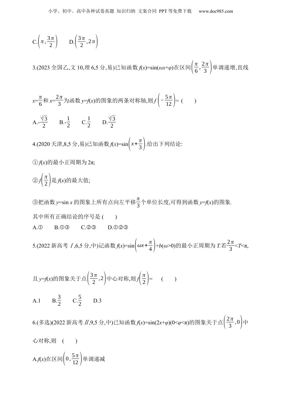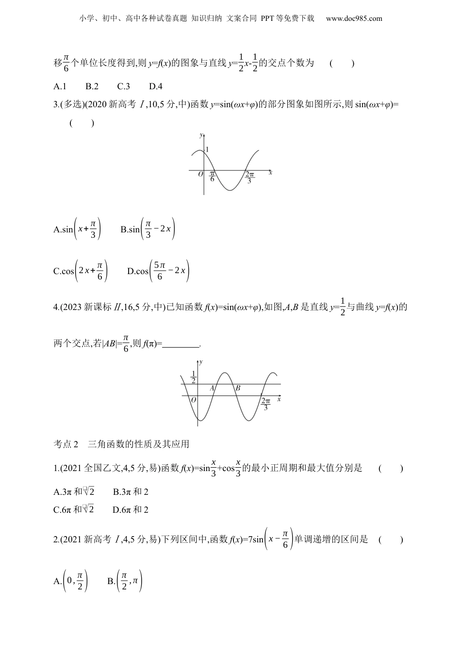 小学、初中、高中各种试卷真题知识归纳文案合同PPT等免费下载www.doc985.com2025版新教材高考数学第二轮复习4.2三角函数的图象与性质五年高考高考新风向1.(多想少算、回归教材)(2024新课标Ⅰ,7,5分,中)当x[0,2∈π]时,曲线y=sinx与y=2sin(3x−π6)的交点个数为()A.3B.4C.6D.82.(多想少算)(多选)(2024新课标Ⅱ,9,6分,易)对于函数f(x)=sin2x和g(x)=sin(2x−π4),下列说法中正确的有()A.f(x)与g(x)有相同的零点B.f(x)与g(x)有相同的最大值C.f(x)与g(x)有相同的最小正周期D.f(x)与g(x)的图象有相同的对称轴考点1三角函数的图象及其变换1.(2021全国乙理,7,5分,中)把函数y=f(x)图象上所有点的横坐标缩短到原来的12倍,纵坐标不变,再把所得曲线向右平移π3个单位长度,得到函数y=sin(x−π4)的图象,则f(x)=()A.sin(x2−7π12)B.sin(x2+π12)C.sin(2x−7π12)D.sin(2x+π12)2.(2023全国甲,文12,理10,5分,中)函数y=f(x)的图象由函数y=cos(2x+π6)的图象向左平小学、初中、高中各种试卷真题知识归纳文案合同PPT等免费下载www.doc985.com移π6个单位长度得到,则y=f(x)的图象与直线y=12x-12的交点个数为()A.1B.2C.3D.43.(多选)(2020新高考Ⅰ,10,5分,中)函数y=sin(ωx+φ)的部分图象如图所示,则sin(ωx+φ)=()A.sin(x+π3)B.sin(π3−2x)C.cos(2x+π6)D.cos(5π6−2x)4.(2023新课标Ⅱ,16,5分,中)已知函数f(x)=sin(ωx+φ),如图,A,B是直线y=12与曲线y=f(x)的两个交点,若|AB|=π6,则f(π)=.考点2三角函数的性质及其应用1.(2021全国乙文,4,5分,易)函数f(x)=sinx3+cosx3的最小正周期和最大值分别是()A.3π和❑√2B.3π和2C.6π和❑√2D.6π和22.(2021新高考Ⅰ,4,5分,易)下列区间中,函数f(x)=7sin(x−π6)单调递增的区间是()A.(0,π2)B.(π2,π)小学、初中、高中各种试卷真题知识归纳文案合同PPT等免费下载www.doc985.comC.(π,3π2)D.(3π2,2π)3.(2023全国乙,文10,理6,5分,易)已知函数f(x)=sin(ωx+φ)在区间(π6,2π3)单调递增,直线x=π6和x=2π3为函数y=f(x)的图象的两条对称轴,则f(−5π12)=()A.-❑√32B.-12C.12D.❑√324.(2020天津,8,5分,易)已知函数f(x)=sin(x+π3).给出下列结论:①f(x)的最小正周期为2π;②f(π2)是f(x)的最大值;③把函数y=sinx的图象上所有点向左平移π3个单位长度,可得到函数y=f(x)的图象.其中所有正确结论的序号是()A.①B.①③C.②③D.①②③5.(2022新高考Ⅰ,6,5分,中)记函数f(x)=sin(ωx+π4)+b(ω>0)的最小正周期为T.若2π3<T<π,且y=f(x)的图象关于点(3π2,2)中心对称,则f(π2)=()A.1B.32C.52D.36.(多选)(2022新高考Ⅱ,9,5分,中)已知函数f(x)=sin(2x+φ)(0<φ<π)的图象关于点(2π3,0)中心对称,则()A.f(x)在区间(0,5π12)单调递减小学、初中、高中各种试卷真题知识归纳文案合同PPT等免费下载www.doc985.comB.f(x)在区间(−π12,11π12)有两个极值点C.直线x=7π6是曲线y=f(x)的对称轴D.直线y=❑√32-x是曲线y=f(x)的切线7.(2020江苏,10,5分,中)将函数y=3sin(2x+π4)的图象向右平移π6个单位长度,则平移后的图象中与y轴最近的对称轴的方程是.8.(2023新课标Ⅰ,15,5分,中)已知函数f(x)=cosωx-1(ω>0)在区间[0,2π]有且仅有3个零点,则ω的取值范围是.9.(2022全国乙理,15,5分,中)记函数f(x)=cos(ωx+φ)(ω>0,0<φ<π)的最小正周期为T.若f(T)=❑√32,x=π9为f(x)的零点,则ω的最小值为.10.(2021全国甲理,16,5分,难)已知函数f(x)=2cos(ωx+φ)的部分图象如图所示,则满足条件f(x)-f-7π4f(x)-f4π3>0的最小正整数x为.11.(2020课标Ⅲ理,16,5分,难)关于函数f(x)=sinx+1sinx有如下四个命题:①f(x)的图象关于y轴对称.②f(x)的图象关于原点对称.③f(x)的图象关于直线x=π2对称.④f(x)的最小值为2.其中所有真命题的序号是.小学、初中、高中各种试卷真题知识归纳文案合同PPT等免费下载www.doc985.com三年模拟练速度1.(2024广东揭阳二模,4)把函数f(x)=3sin3x的图象向左平移14个最小正周期后,所得图象对应的函数为()A.y=3sin(3x+34)B.y=3sin(3x−34)C.y=3cos3xD.y=-3cos3x2.(2024辽宁八市八校第二次联考,3)已知函数f(x)=sin(ωx+π4)(ω>0)图象相邻两条对称轴之间的距离为2π,若f(x)在(-...