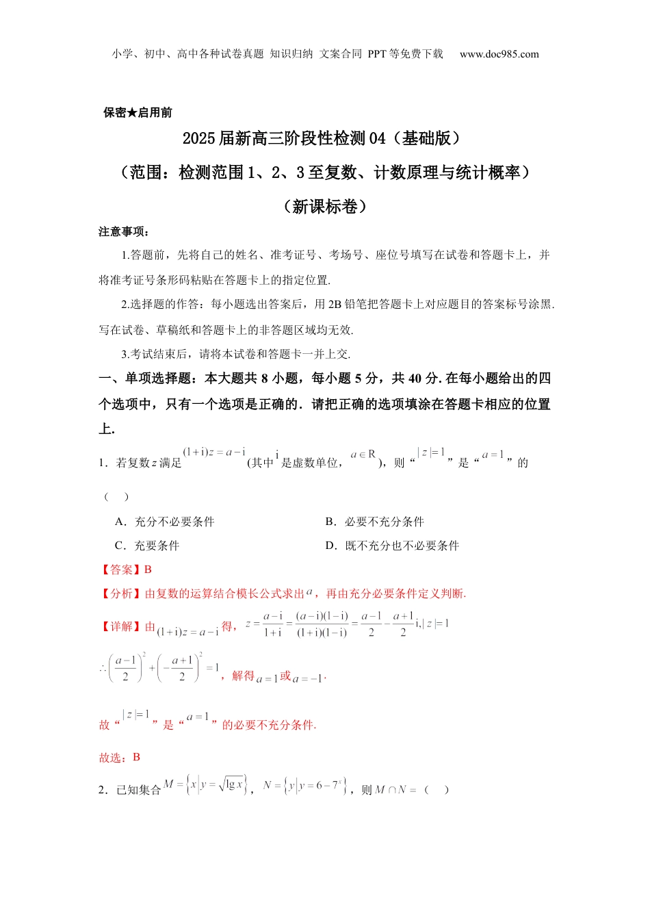 小学、初中、高中各种试卷真题知识归纳文案合同PPT等免费下载www.doc985.com保密★启用前2025届新高三阶段性检测04(基础版)(范围:检测范围1、2、3至复数、计数原理与统计概率)(新课标卷)注意事项:1.答题前,先将自己的姓名、准考证号、考场号、座位号填写在试卷和答题卡上,并将准考证号条形码粘贴在答题卡上的指定位置.2.选择题的作答:每小题选出答案后,用2B铅笔把答题卡上对应题目的答案标号涂黑.写在试卷、草稿纸和答题卡上的非答题区域均无效.3.考试结束后,请将本试卷和答题卡一并上交.一、单项选择题:本大题共8小题,每小题5分,共40分.在每小题给出的四个选项中,只有一个选项是正确的.请把正确的选项填涂在答题卡相应的位置上.1.若复数z满足(其中是虚数单位,),则“”是“”的()A.充分不必要条件B.必要不充分条件C.充要条件D.既不充分也不必要条件【答案】B【分析】由复数的运算结合模长公式求出,再由充分必要条件定义判断.【详解】由得,,解得或.故“”是“”的必要不充分条件.故选:B2.已知集合,,则()小学、初中、高中各种试卷真题知识归纳文案合同PPT等免费下载www.doc985.comA.B.C.D.【答案】B【分析】先分别根据对数不等式及指数函数值域求集合,再结合交集计算即可.【详解】因为,所以,因为,所以,则,所以.故选:B.3.已知向量,,若,则的值为()A.B.C.D.【答案】C【分析】由题意得,即,代入即可求解.【详解】已知向量,,若,则,即,所以的值为.故选:C4.已知数列通项公式为,将数列的公共项从小到大排列得到数列,设数列的前项和为,则()A.B.C.D.【答案】D小学、初中、高中各种试卷真题知识归纳文案合同PPT等免费下载www.doc985.com【分析】首先判断出数列项的特征,从而判断出两个数列公共项所构成新数列的首项以及公差,利用等差数列的求和公式求得结果.【详解】因为数列是以1为首项,以2为公差的等差数列,数列是以1首项,以3为公差的等差数列,所以这两个数列的公共项所构成的新数列是以1为首项,以6为公差的等差数列,即所以的前项和.故选:D.5.甲、乙二人下围棋,若甲先着子,则甲胜的概率为0.6,若乙先着子,则乙胜的概率为0.5,若采取三局两胜制(无平局情况),第一局通过掷一枚质地均匀的硬币确定谁先着子,以后每局由上一局负者先着子,则最终甲胜的概率为()A.0.5B.0.6C.0.57D.0.575【答案】D【分析】最终甲胜分三种情况,一二局甲胜,一三局甲胜,二三局甲胜,而每种情况又分甲先着子和乙先着子,结合独立事件的概率公式和互斥事件的概率加法公式,即可求解.【详解】由题意知,一二局甲胜的概率为:,一三局甲胜的概率为:,二三局甲胜的概率为:,因此最终甲胜的概率为,故选:D.6.已知圆,点在线段()上,过点作圆的两条切线,切点分别为,,以为直径作圆,则圆的面积的最大值为().小学、初中、高中各种试卷真题知识归纳文案合同PPT等免费下载www.doc985.comA.B.C.D.【答案】D【分析】由题意得,进而分析得当最大时,圆的面积的最大,求出最大值,即可求解.【详解】由题可知,,,,,为锐角,当圆的面积取最大值时最大,而,所以,因为点在线段()上,所以,故,即圆半径的最大值为,所以圆的面积的最大值为,故选:D.7.如图,在等腰梯形中,,,,,点是线段上小学、初中、高中各种试卷真题知识归纳文案合同PPT等免费下载www.doc985.com一点,且满足,动点在以为圆心的半径为的圆上运动,则的最大值为()A.B.C.D.【答案】A【分析】利用题设条件,建系,求得相关点的坐标,因点在圆上,设点,计算得三角函数形式,运用辅助角公式将其化成正弦型函数,即可求其最值.【详解】如图,以为原点,建立直角坐标系.由题意,梯形的高长为,则.因为以为圆心的半径为的圆的方程为:,可设点,.则其中,,故当时,.故选:A.小学、初中、高中各种试卷真题知识归纳文案合同PPT等免费下载www.doc985.com8.已知函数,若不等式的解集中佮有两个不同的正整数解,则实数的取值范围是()A.B.C.D.【答案】C【分析】不等式可化为,利用导数分析函数的单调性,作函数,的图象,由条件结合图...