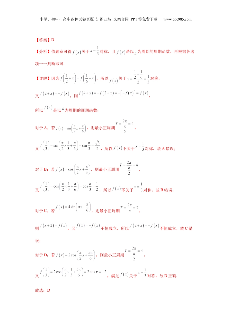 小学、初中、高中各种试卷真题知识归纳文案合同PPT等免费下载www.doc985.com保密★启用前2025届新高三阶段性检测03(能力版)(范围:检测范围1、2至等式与不等式、空间向量与立体几何、解析几何)(新课标卷)注意事项:1.答题前,先将自己的姓名、准考证号、考场号、座位号填写在试卷和答题卡上,并将准考证号条形码粘贴在答题卡上的指定位置.2.选择题的作答:每小题选出答案后,用2B铅笔把答题卡上对应题目的答案标号涂黑.写在试卷、草稿纸和答题卡上的非答题区域均无效.3.考试结束后,请将本试卷和答题卡一并上交.一、单项选择题:本大题共8小题,每小题5分,共40分.在每小题给出的四个选项中,只有一个选项是正确的.请把正确的选项填涂在答题卡相应的位置上.1.已知集合,则()A.B.C.D.【答案】B【分析】根据一元二次不等式求集合A,在根据交集运算求解.【详解】由题意可知:,所以.故选:B.2.已知,分别是等差数列和等比数列,其前项和分别是和,且,,,则()小学、初中、高中各种试卷真题知识归纳文案合同PPT等免费下载www.doc985.comA.9B.9或18C.13D.13或37【答案】B【分析】设等比数列的公比为,当时求出,即可求出,再由等差数列求和公式及下标和性质计算可得,当时根据等比数列求和公式求出,从而求出,即可求出,再由等差数列求和公式及下标和性质计算可得.【详解】设等比数列的公比为,由且,当时,则,符合题意,则,又,所以,所以;当时,则,即,解得(舍去)或,所以,则,又,所以,所以;综上可得或.故选:B3.若函数满足对于,,,则的解析式可能为()A.B.C.D.小学、初中、高中各种试卷真题知识归纳文案合同PPT等免费下载www.doc985.com【答案】D【分析】依题意可得关于对称,且是以为周期的周期函数,再根据各选项一一判断即可.【详解】因为,所以关于对称,又,则,所以是以为周期的周期函数;对于A:若,则最小正周期,又,所以不关于对称,故A错误;对于B:若,则最小正周期,又,所以不关于对称,故B错误;对于C:若,则最小正周期,则,又不恒成立,所以不恒成立,故C错误;对于D:若,则最小正周期,又,满足关于对称,故D正确.故选:D小学、初中、高中各种试卷真题知识归纳文案合同PPT等免费下载www.doc985.com4.冰箱空调等家用电器使用了氟化物,氟化物的释放破坏了大气上层的臭氧层,使臭氧量Q呈指数函数型变化.当氟化物排放量维持在某种水平时,臭氧量满足关系式,其中是臭氧的初始量,e是自然对数的底数,t是时间,以年为单位.若按照关系式推算,经过年臭氧量还保留初始量的四分之一,则的值约为()()A.584年B.574年C.564年D.554年【答案】D【分析】根据题意列出方程,指对数互化求解即可.【详解】由题意知,,则,解得年.故选:D.5.在中,,若,,,则()A.B.C.D.【答案】A【分析】由得出,再借助平行四边形定则画图可解.【详解】如图,设的中点为,则,所以,,则.设,由于,则,则.假如的起点均为,运用加法的平行四边形法作图求和,对角线对应的终点小学、初中、高中各种试卷真题知识归纳文案合同PPT等免费下载www.doc985.com如图所示,所以.故选:A.6.已知某正六棱柱的体积为,其外接球体积为,若该六棱柱的高为整数,则其表面积为()A.B.C.D.【答案】D【分析】根据正六棱柱的体积及外接球的体积列方程求解得出边长及高最后求出表面积即可.【详解】设该正六棱柱的底面边长为,高为,其外接球的半径为,易知,则①,且②,联立①②,因为,解得,所以正六棱柱的表面积.故选:D.7.已知函数的定义域为,若存在零点,则的取值范围为()小学、初中、高中各种试卷真题知识归纳文案合同PPT等免费下载www.doc985.comA.B.C.D.【答案】C【分析】利用指数与对数的运算性质将变形为,构造函数得,由的单调性即可求解.【详解】由题意得,令,则.令,因为函数在上单调递增,单调递增,所以,可化为,即.令,则,当x∈(0,1)时,ℎ′(x)>0,ℎ(x)在(0,1)单调递增,当x∈(1,+∞)时,在(1,+∞)单调递减,又,当时,,所以,解得.故选:C8.已知抛物线C:和圆,点是抛物线的焦点,圆上的两点满足,其中是...