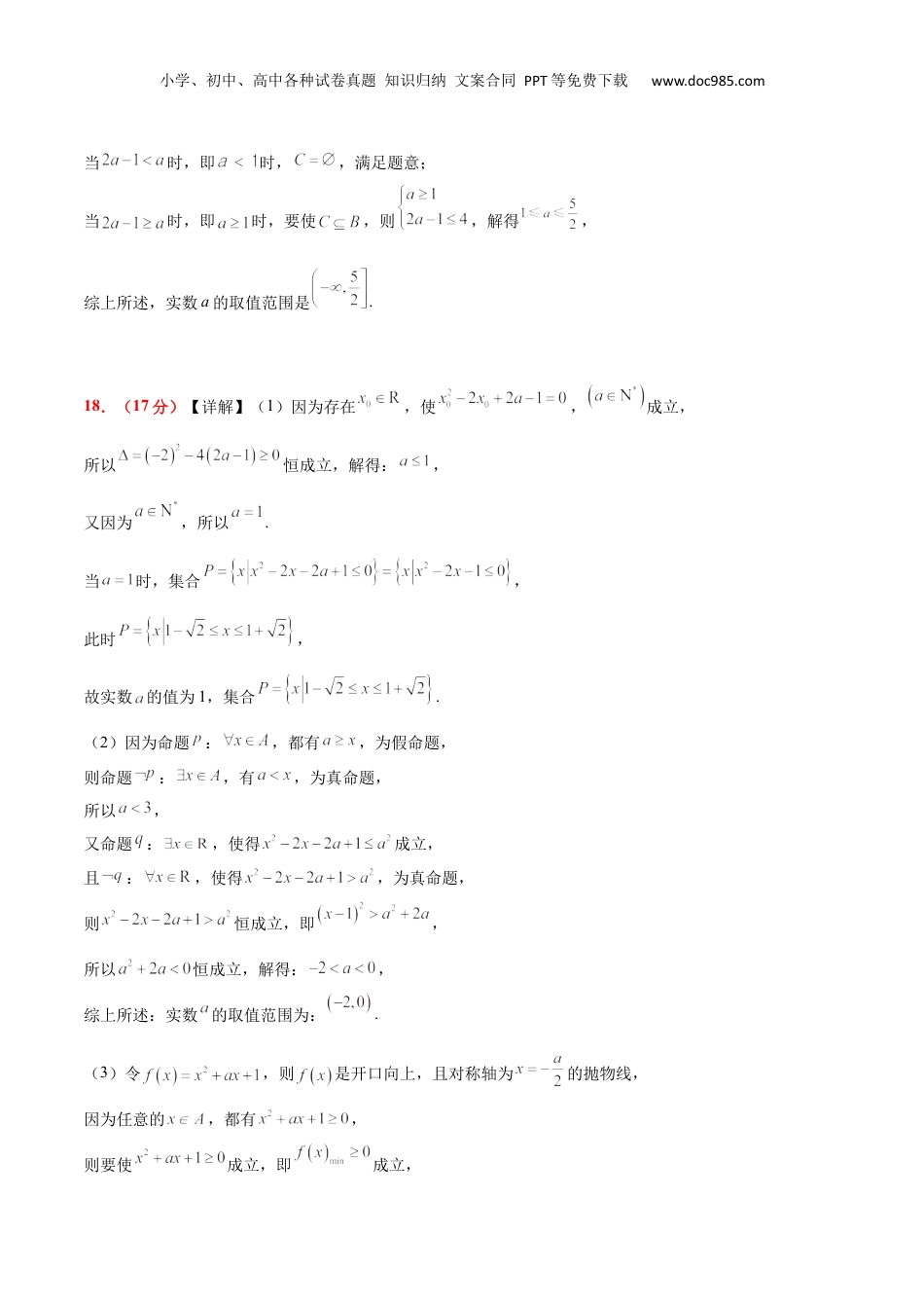 小学、初中、高中各种试卷真题知识归纳文案合同PPT等免费下载www.doc985.com第一章集合与常用逻辑用语综合检测参考答案第一部分(选择题共58分)一、选择题:本题共8小题,每小题5分,共40分。在每小题给出的四个选项中,只有一项是符合题目要求的。12345678AADDABCC二、选择题:本题共3小题,每小题6分,共18分.在每小题给出的选项中,有多项符合题目要求.全部选对的得6分,部分选对的得部分分,有选错的得0分.91011BCDCDBD第二部分(非选择题共92分)三、填空题:本题共3小题,每小题5分,共15分。12.或13.14.四、解答题:本题共5小题,共77分。解答应写出文字说明、证明过程或演算步棸。15.(13分)【详解】(1)当时,,所以或,因为,所以,小学、初中、高中各种试卷真题知识归纳文案合同PPT等免费下载www.doc985.com所以,所以.(2)由(1)知,又,所以,解得:.所以实数的取值范围为.16.(15分)【详解】(1)依题意,关于的不等式恒成立,于是得,解得,所以实数的取值的集合.(2)因为是的必要不充分条件,所以为的真子集.又为非空集合,所以,得,所以实数的取值范围为.17.(15分)【详解】(1)要使函数有意义,则解得,所以,对于函数,,所以,所以.(2)因为,,小学、初中、高中各种试卷真题知识归纳文案合同PPT等免费下载www.doc985.com当时,即时,,满足题意;当时,即时,要使,则,解得,综上所述,实数a的取值范围是.18.(17分)【详解】(1)因为存在,使,成立,所以恒成立,解得:,又因为,所以.当时,集合,此时,故实数的值为1,集合.(2)因为命题:,都有,为假命题,则命题:,有,为真命题,所以,又命题:,使得成立,且:,使得,为真命题,则恒成立,即,所以恒成立,解得:,综上所述:实数的取值范围为:.(3)令,则是开口向上,且对称轴为的抛物线,因为任意的,都有,则要使成立,即成立,小学、初中、高中各种试卷真题知识归纳文案合同PPT等免费下载www.doc985.com当,即时,在上是单调递增函数,所以有,解得:;当,即时,在上的最小值为,所以有,解得:;当,即时,在上是单调递减函数,所以有,此时没有实数解;综上所述:实数的取值范围为:.19.(17分)【详解】(1)解:由题意,数列,可得,所以集合,所以.(2)证明:充分性:若为等差数列,且是递减数列,则的公差为,当时,,所以,则,故充分性成立.必要性:若是递减数列,,则为等差数列,因为是递减数列,所以,所以,且互不相等,所以,小学、初中、高中各种试卷真题知识归纳文案合同PPT等免费下载www.doc985.com又因为,所以且互不相等,所以,所以,所以为等差数列,必要性成立.所以若是递减数列,“”的充要条件是“为等差数列”.(3)证明:由题意集合中的元素个数最多为个,即,对于数列,此时,若存在,则,其中,故,若,不妨设,则,而,故为偶数,为奇数,矛盾,故,故,故由得到的彼此相异,所以.