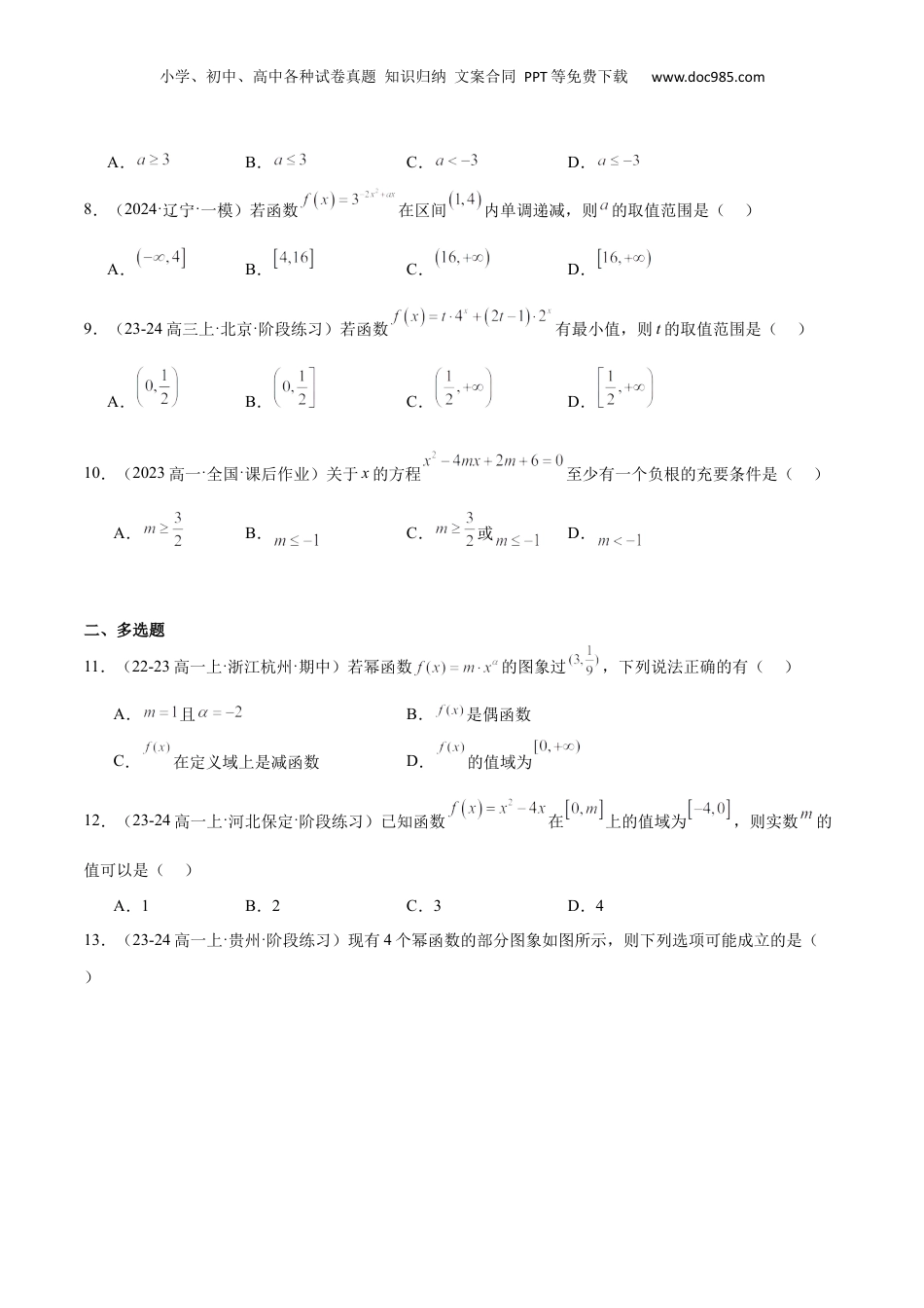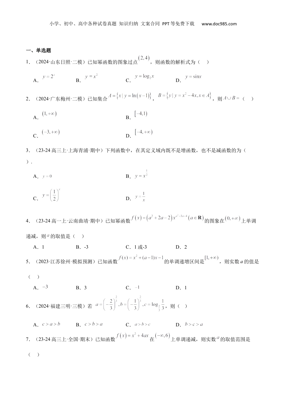 小学、初中、高中各种试卷真题知识归纳文案合同PPT等免费下载www.doc985.com2025年高考数学一轮复习讲义及高频考点归纳与方法总结(新高考通用)第09练二次函数与幂函数(精练)1.通过具体实例,结合y=x,y=,y=x2,y=,y=x3的图象,理解它们的变化规律,了解幂函数.2.掌握二次函数的图象和性质.能利用二次函数、方程、不等式之间的关系解决简单问题.一、单选题1.(2023·天津·高考真题)设,则的大小关系为()A.B.C.D.2.(2023·全国·高考真题)设函数在区间上单调递减,则的取值范围是()A.B.C.D.3.(2022·天津·高考真题)已知,,,则()A.B.C.D.【A级基础巩固练】小学、初中、高中各种试卷真题知识归纳文案合同PPT等免费下载www.doc985.com一、单选题1.(2024·山东日照·二模)已知幂函数的图象过点,则函数的解析式为()A.B.C.D.2.(2024·广东梅州·二模)已知集合,,则()A.B.C.D.3.(23-24高三上·上海青浦·期中)下列函数中,在其定义域内既不是增函数,也不是减函数的为().A.B.C.D.4.(23-24高一上·云南曲靖·期中)已知幂函数的图象在上单调递减,则的取值是()A.1B.-3C.1或-3D.25.(2023·江苏徐州·模拟预测)已知函数的单调递增区间是,则实数a的值是()A.B.3C.D.16.(2024·福建三明·三模)若,则()A.B.C.D.7.(23-24高三上·全国·期末)已知函数在上单调递减,则实数的取值范围是()小学、初中、高中各种试卷真题知识归纳文案合同PPT等免费下载www.doc985.comA.B.C.D.8.(2024·辽宁·一模)若函数在区间内单调递减,则的取值范围是()A.B.C.D.9.(23-24高三上·北京·阶段练习)若函数有最小值,则t的取值范围是()A.B.C.D.10.(2023高一·全国·课后作业)关于x的方程至少有一个负根的充要条件是()A.B.C.或D.二、多选题11.(22-23高一上·浙江杭州·期中)若幂函数的图象过,下列说法正确的有()A.且B.是偶函数C.在定义域上是减函数D.的值域为12.(23-24高一上·河北保定·阶段练习)已知函数在上的值域为,则实数的值可以是()A.1B.2C.3D.413.(23-24高一上·贵州·阶段练习)现有4个幂函数的部分图象如图所示,则下列选项可能成立的是()小学、初中、高中各种试卷真题知识归纳文案合同PPT等免费下载www.doc985.comA.,,,B.,,,C.,,,D.,,,14.(23-24高三上·新疆乌鲁木齐·阶段练习)若函数的最小值为,则的值为()A.B.C.D.三、填空题15.(2023·广东珠海·模拟预测)已知函数在区间上是增函数,则实数的取值范围是.16.(23-24高三上·天津河东·阶段练习)设函数,若函数与在上均为单调递增函数,则实数的取值范围为.小学、初中、高中各种试卷真题知识归纳文案合同PPT等免费下载www.doc985.com17.(23-24高三上·广东湛江·阶段练习)设函数在单调递增,则的取值范围为.18.(23-24高一上·浙江·阶段练习)若关于x的一元二次方程有两个不相等的实根,且.则实数a的取值范围为.19.(23-24高三上·上海浦东新·期中)已知,若幂函数为奇函数,且在上严格单调递减,则.20.(23-24高三上·上海嘉定·期中)已知幂函数的图象过点,且,则实数的取值范围是.21.(23-24高三上·四川眉山·期中)已知幂函数的图象与坐标轴没有公共点,则四、解答题22.(2024·山东·二模)已知是二次函数,且.(1)求的解析式;(2)若,求函数的最小值和最大值.23.(22-23高三上·陕西·阶段练习)已知幂函数在上是减函数.(1)求的解析式;小学、初中、高中各种试卷真题知识归纳文案合同PPT等免费下载www.doc985.com(2)若,求的取值范围.24.(23-24高三上·贵州黔东南·阶段练习)已知函数.(1)求的解析式;(2)若为任意实数,试讨论在上的单调性和最小值.25.(22-23高二上·河南·开学考试)已知幂函数为奇函数.(1)求函数的解析式;(2)若,求的取值范围.26.(22-23高三上·河南·阶段练习)已知幂函数是偶函数.(1)求函数的解析式;(2)函数,,若的最大值为15,求实数a的值.27.(23-24高三上·全国·期末)已知函数为二次函数,的...