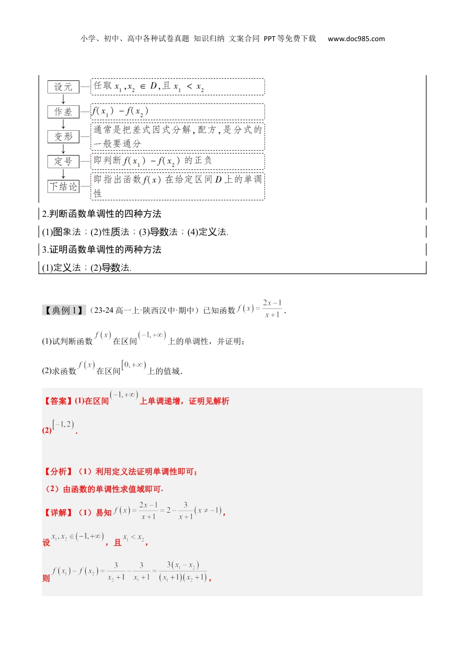 小学、初中、高中各种试卷真题知识归纳文案合同PPT等免费下载www.doc985.com2025年高考数学一轮复习讲义及高频考点归纳与方法总结(新高考通用)第06讲函数的单调性与最值(精讲)①函数单调性的判断与证明②求函数的单调区间③复合函数的单调性④函数单调性的应用(求参数、解不等式、比较大小)⑤求函数的最值(值域)1.函数的单调性(1)增函数:若对于定义域I内的某个区间DDI上的任意两个自变量1x、2x,当12xx时,都有12fxfx,那么就说函数fx在区间D上是增函数;(2)减函数:若对于定义域I内的某个区间DDI上的任意两个自变量1x、2x,当12xx时,都有12fxfx,那么就说函数fx在区间D上是减函数.(3)【特别提醒】①单调区间只能用区间表示,不能用不等式或集合表示.②有多个单调区间应分别写,不能用符号“∪”连接,也不能用“或”连接,只能用“逗号”或“和”连接.2.函数的最值(1)最大值:一般地,设函数yfx的定义域为I,如果存在实数M满足:①对于任意的xI,都有fxM;②存在0xI,使得0fxM.那么,我们称M是函数yfx的最大值.一、必备知识整合小学、初中、高中各种试卷真题知识归纳文案合同PPT等免费下载www.doc985.com(2)最小值:一般地,设函数yfx的定义域为I,如果存在实数m满足:①对于任意的xI,都有fxm;②存在0xI,使得0fxm.那么,我们称m是函数yfx的最小值.(3)函数最值存在的两个结论①闭区间上的连续函数一定存在最大值和最小值.②开区间上的“单峰”函数一定存在最大(小)值.1.∀x1,x2∈D(x1≠x2),⇔f(x)在D上是增函数;⇔f(x)在D上是减函数.2.对勾函数y=(a>0)的增区间为(-∞,-]和[,+∞),减区间为[-,0)和(0,].3.当f(x),g(x)都是增(减)函数时,f(x)+g(x)是增(减)函数.4.若k>0,则kf(x)与f(x)单调性相同;若k<0,则kf(x)与f(x)的单调性相反.5.函数y=f(x)在公共定义域内与y=的单调性相反.6.复合函数y=f[g(x)]的单调性与函数y=f(u)和u=g(x)的单调性关系是“同增异减”.【题型一函数单调性的判断与证明】1.定义法证明函数单调性的步骤二、考点分类精讲小学、初中、高中各种试卷真题知识归纳文案合同PPT等免费下载www.doc985.com2.判断函数单调性的四种方法(1)象法;图(2)性法;质(3)法;导数(4)定法.义3.证明函数单调性的两种方法(1)定法;义(2)法.导数【典例1】(23-24高一上·陕西汉中·期中)已知函数.(1)试判断函数在区间上的单调性,并证明;(2)求函数在区间上的值城.【答案】(1)在区间上单调递增,证明见解析(2).【分析】(1)利用定义法证明单调性即可;(2)由函数的单调性求值域即可.【详解】(1)易知,设,且,则,小学、初中、高中各种试卷真题知识归纳文案合同PPT等免费下载www.doc985.com又由,则,,,所以,即在区间上单调递增;(2)由上可知函数在区间上单调递增,则,又,故的值域为.一、单选题1.(23-24高三上·上海杨浦·期中)已知函数,.若成立,则下列论断中正确的是()A.函数在上一定是增函数;B.函数在上一定不是增函数;C.函数在上可能是减函数;D.函数在上不可能是减函数.【答案】D【分析】根据函数单调性的定义判断即可.【详解】因为函数,且成立,则函数在上不可能是减函数,可能是增函数,也可能不是增函数,如,满足,但是在上不具有单调性,故D正确,A、B、C错误.小学、初中、高中各种试卷真题知识归纳文案合同PPT等免费下载www.doc985.com故选:D2.(2024·陕西榆林·一模)已知函数在上单调递增,则对实数,“”是“”的()A.充分不必要条件B.必要不充分条件C.充要条件D.既不充分也不必要条件【答案】C【分析】由函数的单调性以及充分条件和必要条件的定义即可判定出结果【详解】因为函数在上单调递增,且,由增函数的定义可知,当时,有,充分性成立;当时,若,由函数定义可知矛盾,若,由函数单调性的定义可知矛盾,则,必要性成立.即对实数,“”是“”的充要条件.故选:C二、解答题3.(23-24高三上·新疆阿克苏·阶段练习)已知函数,(1)求该函数的定义域;(2)证...