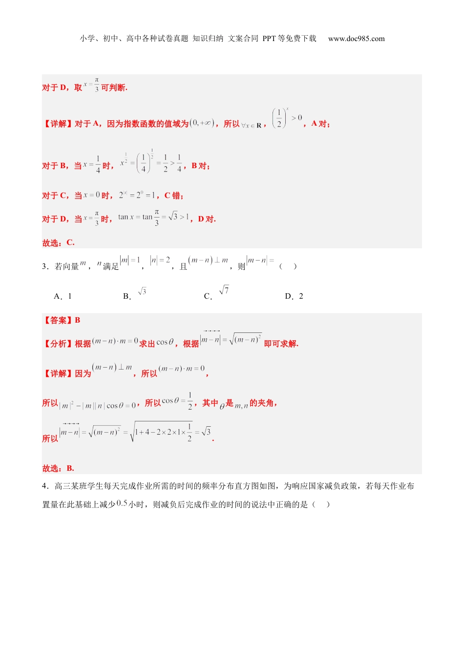 小学、初中、高中各种试卷真题知识归纳文案合同PPT等免费下载www.doc985.com2024年新高考Ⅱ卷真题知识点平行模拟卷(考试时间:120分钟试卷满分:150分)注意事项:1.答卷前,考生务必将自己的姓名、准考证号填写在答题卡上。2.回答选择题时,选出每小题答案后,用铅笔把答题卡上对应题目的答案标号涂黑。如需改动,用橡皮擦干净后,再选涂其他答案标号。回答非选择题时,将答案写在答题卡上。写在本试卷上无效。3.考试结束后,将本试卷和答题卡一并交回。4.测试范围:新高考全部内容。第一部分(选择题共58分)一、选择题:本题共8小题,每小题5分,共40分。在每小题给出的四个选项中,只有一项是符合题目要求的。1.若复数满足,则()A.B.C.5D.10【答案】B【分析】利用复数除法化简,然后由复数模公式可得.【详解】因为,所以,所以.故选:B2.下列命题中的假命题是()A.,B.,C.,D.,【答案】C【分析】对于A,根据指数的值域为可判断;对于B,取可判断;对于C,取可判断;小学、初中、高中各种试卷真题知识归纳文案合同PPT等免费下载www.doc985.com对于D,取可判断.【详解】对于A,因为指数函数的值域为,所以,,A对;对于B,当时,,B对;对于C,当时,,C错;对于D,当时,,D对.故选:C.3.若向量,满足,,且,则()A.1B.C.D.2【答案】B【分析】根据求出,根据即可求解.【详解】因为,所以,所以,所以,其中是的夹角,所以.故选:B.4.高三某班学生每天完成作业所需的时间的频率分布直方图如图,为响应国家减负政策,若每天作业布置量在此基础上减少小时,则减负后完成作业的时间的说法中正确的是()小学、初中、高中各种试卷真题知识归纳文案合同PPT等免费下载www.doc985.comA.减负后完成作业的时间的标准差减少B.减负后完成作业的时间的方差减少C.减负后完成作业的时间在小时以上的概率大于D.减负后完成作业的时间的中位数在至之间【答案】D【分析】根据方差、标准差的性质判断A、B,由频率分布直方图分析减负前完成作业的时间在小时以上的概率,即可判断C,分析减负前完成作业的时间的中位数位于之间,即可判断D.【详解】依题意若每天作业布置量在此基础上减少小时,则平均数减小小时,方差和标准差均不变,故A、B错误;减负前完成作业的时间在小时以上的概率为,所以减负后完成作业的时间在小时以上的概率为,故C错误;由频率分布直方图可得,,所以减负前完成作业的时间的中位数位于之间,所以减负后完成作业的时间的中位数在至之间,故D正确.故选:D5.一动圆与圆外切,与圆内切,则动圆圆心点的轨迹方程为()A.B.C.D.小学、初中、高中各种试卷真题知识归纳文案合同PPT等免费下载www.doc985.com【答案】D【分析】根据两圆位置关系分析可得,结合椭圆的定义分析求解.【详解】由题意可知:圆的圆心,半径;圆的圆心,半径;因为,可知圆与圆内切于点,显然圆心不能与点重合,设圆的半径为,由题意可知:,则,可知点M的轨迹是以为焦点的椭圆(点除外),且,可得,所以点的轨迹方程为.故选:D.6.若函数与的图象有且仅有一个交点,则关于的不等式的解集为()A.B.C.D.【答案】D小学、初中、高中各种试卷真题知识归纳文案合同PPT等免费下载www.doc985.com【分析】将条件与只有1个交点转换为函数只有1个零点,参数分离求出a,再构造函数,利用其单调性求解即可.【详解】函数与的图象有且仅有一个交点,即只有一个零点,即只有一个零点.令,则,.当时,,所以在上单调递增;当时,,所以在上单调递减,并且.所以,,.函数的大致图象如图因为,所以.原不等式,即.令,显然时,该函数为增函数,且,所以,的解集为.故选:D.7.已知正四棱台上底面边长为,下底面边长为,体积为,则正四棱台的侧棱与底面所成角的正切值小学、初中、高中各种试卷真题知识归纳文案合同PPT等免费下载www.doc985.com为()A.B.C.D.【答案】D【分析】画出相应图形,借助正四棱台的性质及体积公式可得其高,结合线面角定义计算即可得解.【详解】如图所示,作于点,则,即,,则,由正四棱台的侧棱与底面所成角即为与底面所成角,设其为,则,即.故答案为:....