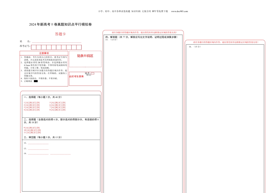 小学、初中、高中各种试卷真题知识归纳文案合同PPT等免费下载www.doc985.com2024年新高考Ⅱ卷真题知识点平行模拟卷答题卡1.答题前,考生先将自己的姓名,准考证号填写清楚,并认真检查监考员所粘贴的条形码。2.选择题必须用2B铅笔填涂;非选择题必须用0.5mm黑色签字笔答题,不得用铅笔或圆珠笔答题;字体工整、笔迹清晰。3.请按题号顺序在各题目的答题区域内作答,超出区域书写的答案无效;在草稿纸、试题卷上答题无效。4.保持卡面清洁,不要折叠、不要弄破。5.正确填涂此栏考生禁填缺考标记请在各题目的答题区域内作答,超出黑色矩形边框限定区域的答案无效!请在各题目的答题区域内作答,超出黑色矩形边框限定区域的答案无效!一、选择题(每小题5分,共40分)1[A][B][C][D]2[A][B][C][D]3[A][B][C][D]4[A][B][C][D]5[A][B][C][D]6[A][B][C][D]7[A][B][C][D]8[A][B][C][D]二、选择题(全部选对的得6分,部分选对的得部分分,有选错的得0分,共18分)9[A][B][C][D]10[A][B][C][D]11[A][B][C][D]三、填空题(每小题5分,共15分)12.____________________13.____________________14.________________________________________四、解答题(共77分,解答应写出文字说明、证明过程或演算步骤)15.(13分)注意事项形贴条码区姓名:_________________________________________准考证号:16.(15分)小学、初中、高中各种试卷真题知识归纳文案合同PPT等免费下载www.doc985.com请在各题目的答题区域内作答,超出黑色矩形边框限定区域的答案无效!17.(15分)请在各题目的答题区域内作答,超出黑色矩形边框限定区域的答案无效!请在各题目的答题区域内作答,超出黑色矩形边框限定区域的答案无效!18.(17分)19.(17分)请在各题目