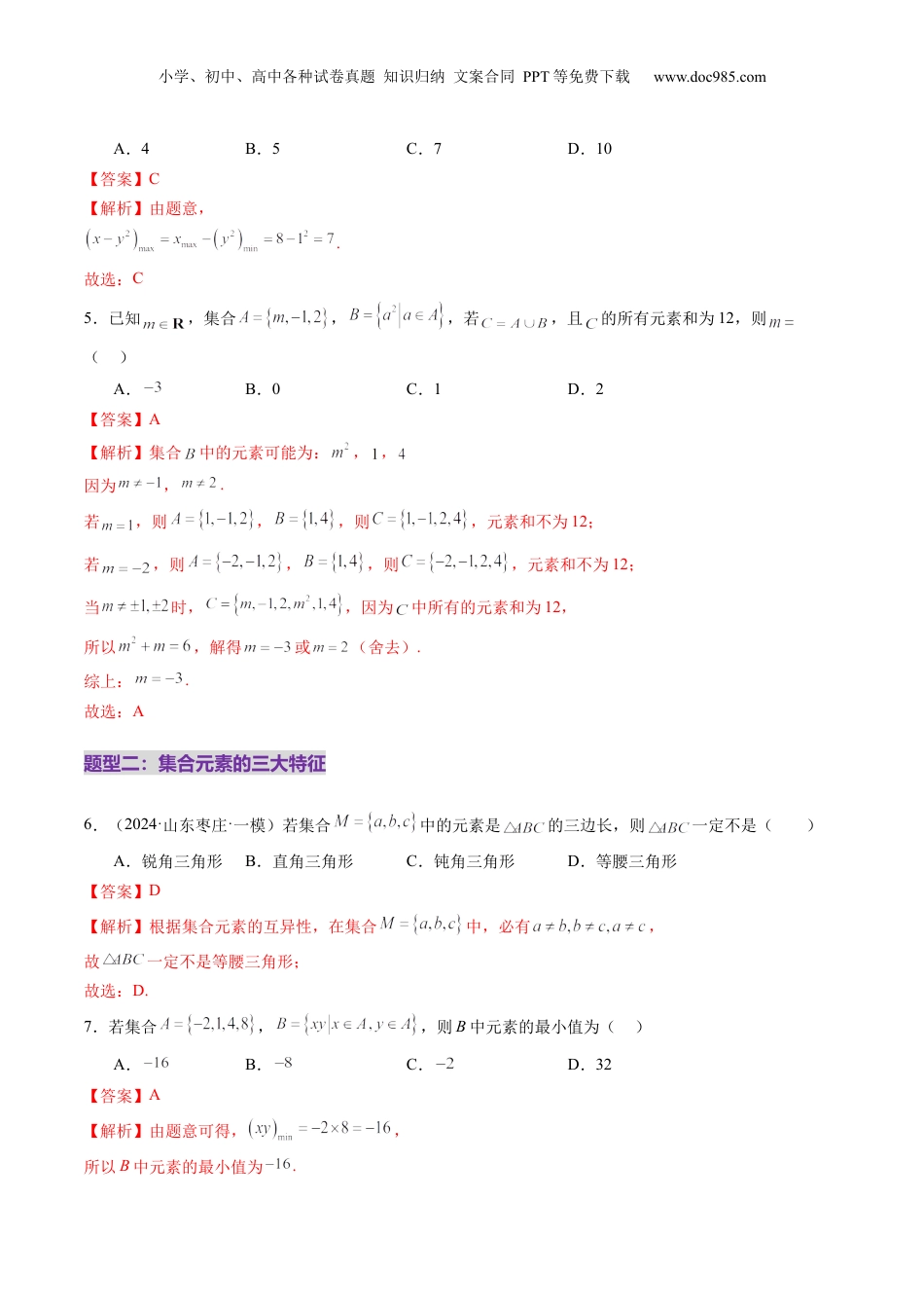 小学、初中、高中各种试卷真题知识归纳文案合同PPT等免费下载www.doc985.com第01讲集合目录01模拟基础练...................................................................................................................................2题型一:集合的表示:列举法、描述法........................................................................................2题型二:集合元素的三大特征........................................................................................................3题型三:元素与集合间的关系........................................................................................................4题型四:集合与集合之间的关系....................................................................................................5题型五:集合的交、并、补运算....................................................................................................7题型六:集合与排列组合的密切结合............................................................................................9题型七:容斥原理..........................................................................................................................10题型八:集合的创新定义运算.......................................................................................................1102重难创新练..................................................................................................................................1303真题实战练..................................................................................................................................19小学、初中、高中各种试卷真题知识归纳文案合同PPT等免费下载www.doc985.com题型一:集合的表示:列举法、描述法1.已知集合,则集合B中所含元素个数为()A.20B.21C.22D.23【答案】B【解析】当时,有,6个元素;当时,有,5个元素;当时,有,4个元素;当时,有,3个元素;当时,有,2个元素;当时,有,1个元素,综上,一共有21个元素.故选:B.2.集合的元素个数为()A.B.C.D.【答案】B【解析】集合,所以集合的元素个数为9个.故选:B.3.(2024·陕西西安·一模)定义集合且.已知集合,,则中元素的个数为()A.6B.5C.4D.7【答案】C【解析】根据题意,因为,,所以.故选:C.4.若集合,,则中元素的最大值为()小学、初中、高中各种试卷真题知识归纳文案合同PPT等免费下载www.doc985.comA.4B.5C.7D.10【答案】C【解析】由题意,.故选:C5.已知,集合,,若,且的所有元素和为12,则()A.B.0C.1D.2【答案】A【解析】集合中的元素可能为:,,因为,.若,则,,则,元素和不为12;若,则,,则,元素和不为12;当时,,因为中所有的元素和为12,所以,解得或(舍去).综上:.故选:A题型二:集合元素的三大特征6.(2024·山东枣庄·一模)若集合中的元素是的三边长,则一定不是()A.锐角三角形B.直角三角形C.钝角三角形D.等腰三角形【答案】D【解析】根据集合元素的互异性,在集合中,必有,故一定不是等腰三角形;故选:D.7.若集合,,则B中元素的最小值为()A.B.C.D.32【答案】A【解析】由题意可得,,所以B中元素的最小值为.小学、初中、高中各种试卷真题知识归纳文案合同PPT等免费下载www.doc985.com故选:A题型三:元素与集合间的关系8.已知集合,且,则实数为()A.2B.3C.0或3D.【答案】B【解析】因为且,所以或,①若,此时,不满足元素的互异性;②若,解得或3,当时不满足元素的互异性,当时,符合题意.综上所述,.故选:B9.已知集合,,则()A.B.或1C.1D.5【答案】C【解析】当,解得或1,当时,,与元素互异性矛盾,舍去;当时,,满足要求,当时,解得,显然与元素互异性矛盾,舍去,综上,.故选:C10.(2024·河南驻马店·一模)已知集合...