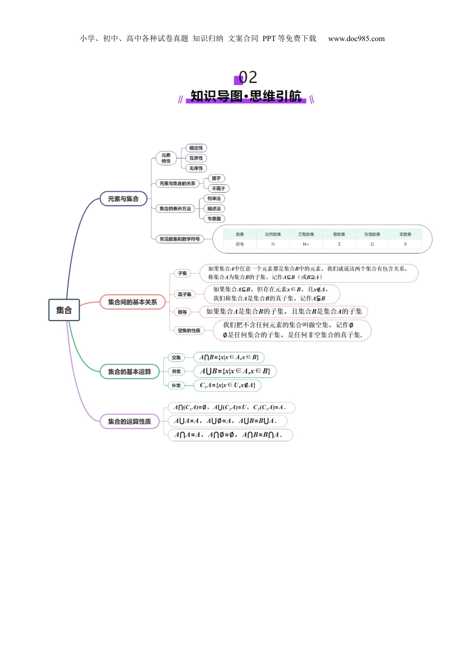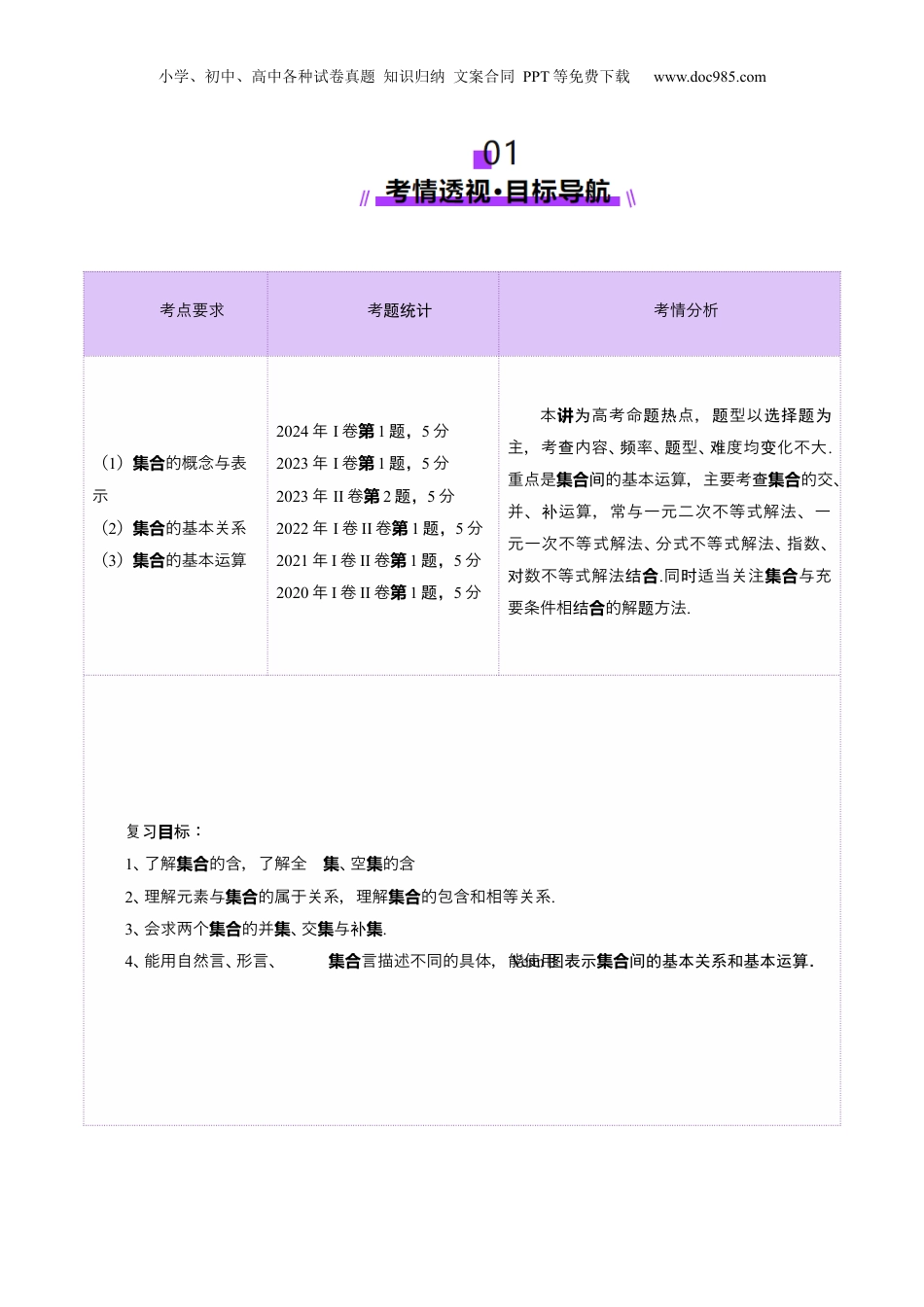 小学、初中、高中各种试卷真题知识归纳文案合同PPT等免费下载www.doc985.com第01讲集合目录01考情透视·目航标导..........................................................................................................................202知识导图·思引航维..........................................................................................................................303考点突破·型探究题..........................................................................................................................4知点1集合:元素与.............................................................................................................................4知点2集合:的基本关系.....................................................................................................................5知点3集合:的基本运算.....................................................................................................................5知点4集合:的运算性.........................................................................................................................5解题方法总结........................................................................................................................................6集合题型一:的表示:列举法、描述法............................................................................................6集合型二:元素的三大特征................................................................................................................7集合型三:元素与的关系题间............................................................................................................7集合集合型四:与之的关系题间........................................................................................................8集合型五:的交、并、运算...................................................................................................................9集合合合型六:与排列的密切............................................................................................................9型七:容斥原理..................................................................................................................................10集合型八:的新定运算......................................................................................................................1104真题练习·命题洞见........................................................................................................................1205本典例课·高考素材........................................................................................................................1306易分析错·答模板题........................................................................................................................15集合集易点:在解含参数忽空错问题时视......................................................................................15答模板题..............................................................................................................................................15小学、初中、高中各种试卷真题知识归纳文案合同PPT等免费下载www.doc985.com考点要求考题统计考情分析(1集合)的概念与表示(2集合)的基本关系(3集合)的基本运算2024年I第卷1题,5分2023年I第卷1题,5分2023年II第卷2题,5分2022年I卷II第卷1题,5分2021年I卷II第卷1题,5分2020年I卷II第卷1题,5分讲本高考命点,型以为题热题选...