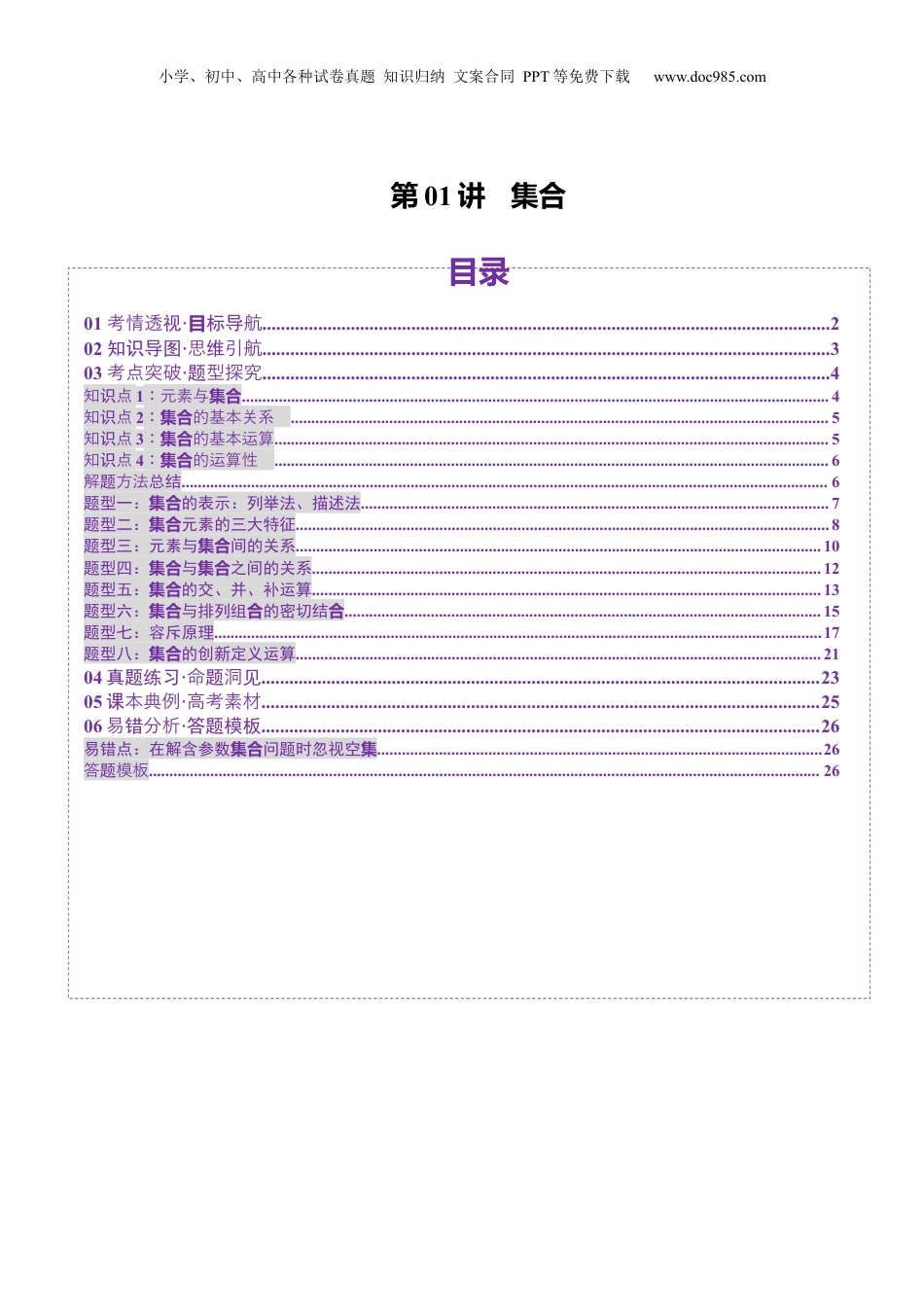 小学、初中、高中各种试卷真题知识归纳文案合同PPT等免费下载www.doc985.com第01讲集合目录01考情透视·目航标导..........................................................................................................................202知识导图·思引航维..........................................................................................................................303考点突破·型探究题..........................................................................................................................4知点识1集合:元素与...............................................................................................................................................4知点识2集合:的基本关系...................................................................................................................................5知点识3集合:的基本运算.......................................................................................................................................5知点识4集合:的运算性.......................................................................................................................................6解方法题总结..............................................................................................................................................................6集合题型一:的表示:列举法、描述法..................................................................................................................7集合题型二:元素的三大特征..................................................................................................................................8集合题型三:元素与间的关系................................................................................................................................10集合集合题型四:与之间的关系............................................................................................................................12集合题型五:的交、并、补运算............................................................................................................................13集合合合题型六:与排列组的密切结....................................................................................................................15题型七:容斥原理....................................................................................................................................................17集合题型八:的创新定义运算................................................................................................................................2104真题练习·命洞题见........................................................................................................................2305本典例课·高考素材........................................................................................................................2506易分析错·答题模板........................................................................................................................26集合集易错点:在解含参数问题时忽视空............................................................................................................26答模板题....................................................................................................................................................................26小学、初中、高中各种试...