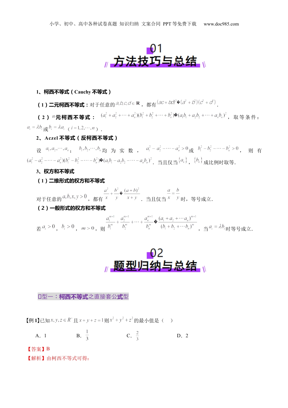 小学、初中、高中各种试卷真题知识归纳文案合同PPT等免费下载www.doc985.com拔高点突破02柯西不等式、反柯西不等式与权方和不等式目录01方与法技巧总结...............................................................................................................................202与题型归纳总结...............................................................................................................................2柯西不等式式型一:之直接套公型题......................................................................................................................2柯西不等式式题型二:之根下有正负型..................................................................................................................4柯西不等式高题型三:之次定求低次型..................................................................................................................5柯西不等式高题型四:之低次定求次型..................................................................................................................7柯西不等式式与式题型五:之整分型......................................................................................................................8柯西不等式题型六:之多变量型..............................................................................................................................9柯西不等式题型七:之三角函数型........................................................................................................................11题型八:Aczel不等式..............................................................................................................................................12权方和不等式式与式题型九:之整分综合型........................................................................................................13权方和不等式题型十:之三角函数型....................................................................................................................14权方和不等式题型十一:之杂合型........................................................................................................................1503关过测试.........................................................................................................................................16小学、初中、高中各种试卷真题知识归纳文案合同PPT等免费下载www.doc985.com1、柯西不等式(Cauchy不等式)(1)二元柯西不等式:对于任意的,都有.(2)元柯西不等式:,取等条件:或().2、Aczel不等式(反柯西不等式)设;均为实数,或,则有.当且仅当,成比例时取等.3、权方和不等式(1)二维形式的权方和不等式对于任意的,都有.当且仅当时,等号成立.(2)一般形式的权方和不等式若,,,则,当时等号成立.题型一:柯西不等式式之直接套公型【例1】已知且则的最小值是()A.1B.C.D.2【答案】B【解析】由柯西不等式可得:小学、初中、高中各种试卷真题知识归纳文案合同PPT等免费下载www.doc985.com,即所以,当且仅当即时取等号,故的最小值为,故选:B.式【变1-1】若,则的最小值为()A.25B.8C.D.【答案】C【解析】由柯西不等式,得,∴,∴,当且时,即,且与异号时,,则的最小值为.选:C.式【变1-2】已知a,b,,满足,则的最大值为()A.2B.3C.4D.6【答案】B【解析】设,,,可得,所以.因为,所以,当且仅当,取得最大值6,此时,所以的最大值为.小学、初中、高中各种试卷真题知识归纳文案合同PPT等免费下载www.doc985.com故选:B.柯西不等式式型二:之根下有正型【例2】(2024·高三·山东青岛·期中)柯西不等式(Caulhy-SchwarzLnequality)是法...
