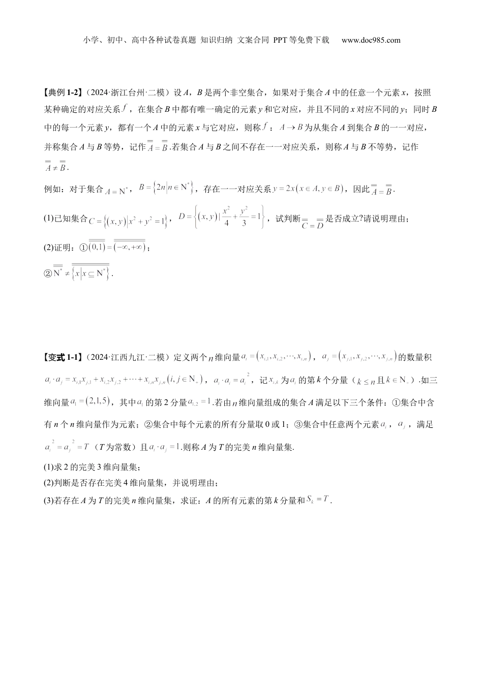 小学、初中、高中各种试卷真题知识归纳文案合同PPT等免费下载www.doc985.com拔高点突破01集合背景下的新定义压轴解答题目录01方法技巧与总结...............................................................................................................................202题型归纳与总结...............................................................................................................................2题定义新型一:概念..................................................................................................................................................2题定义新型二:运算..................................................................................................................................................4题定义新型三:性......................................................................................................................................................5题定义新背景型四:..................................................................................................................................................603关过测试...........................................................................................................................................9小学、初中、高中各种试卷真题知识归纳文案合同PPT等免费下载www.doc985.com1、解新定义新题的基是:型答本思路创(1)正确理解新定义;(2)据新定义立关系式;根建(3)结合所学的知识、将问题转为的问题;化熟悉经验(4)运用所学的公式、定理、性质等合理理、运算,求得结果.行推进2、集合中的新问题,是通过重新定义相应的集合或重新定义集合中的某个要素,结合集合概念往往的知识以新,我们可以用原有集合的相关知识来解题.加创还利3、集合中的新运算问题是通过新给出有关集合的一个全新的运算规则.按照新的运算规则,结合创数学中原有的运算和运算规则,通过相关的集合或其知识计算或逻辑理等,从而达到解的的他行推答目进.4、集合中的新性质问题是通过新集合中给定的定义与性质而来的.我们通过可以结合相往往衍生创应的集合、关系、运算等相关知识,用相应的数学想方来解有关的集合的新性质问题.概念法利思答题型一:定义新概念【典例1-1】(2024·北京顺义·二模)已知点集满足,,.对于任意点集,若其非空子集A,B满足,,则称集合对为的一个优划分.对任意点集及其优划分,记A中所有点的横坐标之和为,B中所有点的纵坐标之和为.(1)写出的一个优划分,使其满足;(2)对于任意点集,求证:存在的一个优划分,满足;(3)对于任意点集,求证:存在的一个优划分,满足且.小学、初中、高中各种试卷真题知识归纳文案合同PPT等免费下载www.doc985.com【典例1-2】(2024·浙江台州·二模)设A,B是两个非空集合,如果对于集合A中的任意一个元素x,按照某种确定的对应关系,在集合B中都有唯一确定的元素y和它对应,并且不同的x对应不同的y;同时B中的每一个元素y,都有一个A中的元素x与它对应,则称:为从集合A到集合B的一一对应,并称集合A与B等势,记作.若集合A与B之间不存在一一对应关系,则称A与B不等势,记作.例如:对于集合,,存在一一对应关系,因此.(1)已知集合,,试判断是否成立?请说明理由;(2)证明:①;②.式【变1-1】(2024·江西九江·二模)定义两个维向量,的数量积,,记为的第k个分量(且).如三维向量,其中的第2分量.若由维向量组成的集合A满足以下三个条件:①集合中含有n个n维向量作为元素;②集合中每个元素的所有分量取0或1;③集合中任意两个元素,,满足(T为常数)且.则称A为T的完美n维向量集.(1)求2的完美3维向量集;(2)判断是否存在完美4维向量集,并说明理由;(3)若存在A为T的完美n维向量集,求证:A的所有元素的第k分量和.小学、初中、高中各种试卷真题知识归纳文案合同PPT等免费下载www.doc985.com题定义新型二:运算【典例2-1】(202...
