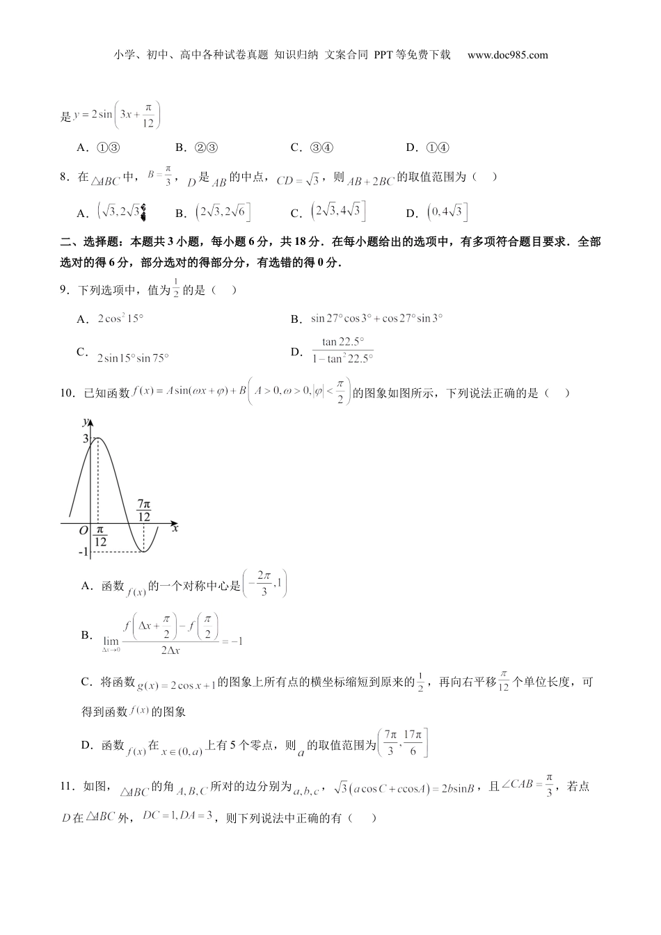 小学、初中、高中各种试卷真题知识归纳文案合同PPT等免费下载www.doc985.com第四章三角函数与解三角形(测试)(考试时间:120分钟试卷满分:150分)注意事项:1.答卷前,考生务必将自己的姓名、准考证号填写在答题卡上。2.回答选择题时,选出每小题答案后,用铅笔把答题卡对应题目的答案标号涂黑。如需改动,用橡皮擦干净后,再选涂其他答案标号。回答非选择题时,将答案写在答题卡上。写在本试卷上无效。3.考试结束后,将本试卷和答题卡一并交回。第一部分(选择题共58分)一、选择题:本题共8小题,每小题5分,共40分。在每小题给出的四个选项中,只有一项是符合题目要求的。1.已知,则“”是“”的()A.充分不必要条件B.必要不充分条件C.充要条件D.既不充分也不必要条件2.在△ABC中,角A,B,C的对边分别为a,b,c,若,则△ABC一定是()A.等腰三角形B.直角三角形C.等腰或直角三角形D.等边三角形3.如图,是九个相同的正方形拼接而成的九宫格中的两个角,则()A.B.C.D.14.如图,曲线段是一段半径为的圆弧,若圆弧的长度为,则A,B两点间的距离为()小学、初中、高中各种试卷真题知识归纳文案合同PPT等免费下载www.doc985.comA.RB.RC.RD.2R5.冬奥会会徽以汉字“冬”为灵感来源,结合中国书法的艺术形态,将悠久的中国传统文化底蕴与国际化风格融为一体,呈现出中国在新时代的新形象、新梦想.某同学查阅资料得知,书法中的一些特殊画笔都有固定的角度,比如在弯折位置通常采用等特殊角度下.为了判断“冬”的弯折角度是否符合书法中的美学要求.该同学取端点绘制了,如图,测得,若点恰好在边上,则的值为()A.B.C.D.6.在平面直角坐标系中,角的顶点与原点重合,始边与轴的非负半轴重合,终边经过点,则()A.B.C.-2D.27.在物理学中,把物体受到的力(总是指向平衡位置)正比于它离开平衡位置的距离的运动称为“简谐运动”.在平面直角坐标系下,某个简谐运动可以用函数(,,)来表示,其部分图象如图所示,则下列结论正确的编号是()①函数的图象关于点成中心对称;②函数的解析式可以为;③函数在上的值域为;④若把图象上所有点的横坐标缩短为原来的倍,纵坐标不变,再向右平移个单位,则所得函数小学、初中、高中各种试卷真题知识归纳文案合同PPT等免费下载www.doc985.com是A.①③B.②③C.③④D.①④8.在中,,是的中点,,则的取值范围为()A.B.C.D.二、选择题:本题共3小题,每小题6分,共18分.在每小题给出的选项中,有多项符合题目要求.全部选对的得6分,部分选对的得部分分,有选错的得0分.9.下列选项中,值为的是()A.B.C.D.10.已知函数的图象如图所示,下列说法正确的是()A.函数的一个对称中心是B.C.将函数的图象上所有点的横坐标缩短到原来的,再向右平移个单位长度,可得到函数的图象D.函数在上有5个零点,则的取值范围为11.如图,的角所对的边分别为,,且,若点在外,,则下列说法中正确的有()小学、初中、高中各种试卷真题知识归纳文案合同PPT等免费下载www.doc985.comA.B.C.四边形面积的最大值为D.四边形面积的最大值为第二部分(非选择题共92分)三、填空题:本题共3小题,每小题5分,共15分。12.13.在中,角A,B,C所对的边分别为a,b,c,且,则角B=.14.已知函数在区间上的值域均为,则实数的取值范围是.四、解答题:本题共5小题,共77分。解答应写出文字说明、证明过程或演算步棸。15.(13分)如图,在平面坐标系中,第二象限角的终边与单位圆交于点,且点的纵坐标为.(1)求的值;(2)求的值.小学、初中、高中各种试卷真题知识归纳文案合同PPT等免费下载www.doc985.com16.(15分)在中,角所对的边分别为,已知.(1)若,求角的大小;(2)若,求边上的高.17.(15分)在中,角,,的对边分别为,,,已知.(1)若,求的值和的面积;(2)在(1)的条件下,求的值;(3)若,求的值.18.(17分)在中,角A,B,C的对边分别为a,b,c,已知.(1)求角B的大小;(2)若,且为锐角三角形,求的周长的取值范围;(3)若,且外接圆的半径为2,圆心为O,P为圆O上的一动点,试求的取值范围.19.(1...