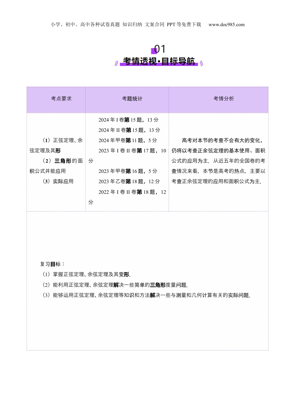 小学、初中、高中各种试卷真题知识归纳文案合同PPT等免费下载www.doc985.com第04讲解三角形目录01考情透视·目航标导..........................................................................................................................202知识导图·思引航维..........................................................................................................................303考点突破·型探究题..............................................................................................................................4知点1:基本定理公式.........................................................................................................................4知点2:相关用.................................................................................................................................5知点3:用实际应.................................................................................................................................6解题方法总结........................................................................................................................................7题型一:正弦定理的应用....................................................................................................................8题型二:余弦定理的应用..................................................................................................................11三三角形形题型:判断的状..................................................................................................................14题型四:正、余弦定理的综合运用...................................................................................................17三角题型五:正、余弦定理与函数性质的结合应用.......................................................................20解三角形题型六:的实际应用..........................................................................................................27角题型七:倍关系..................................................................................................................................32三角形解题型八:的个数......................................................................................................................36三角形题型九:中的面积与周长问题..............................................................................................3804真题练习·命洞题见........................................................................................................................4305本典例课·高考素材........................................................................................................................4606易分析错·答题模板........................................................................................................................49三角形三角易点:忽的系与范限制错视间联围..............................................................................49角解三角形答模板:利用关系题边..................................................................................................50小学、初中、高中各种试卷真题知识归纳文案合同PPT等免费下载www.doc985.com考点要求考题统计考情分析(1)正弦定理、余形弦定理及其(2三角形)的面公式并能用积应(3)用实际应2024年I第卷15题,13分2024年II第卷15题,13分2024第年甲卷11题,5分2023年I卷II第卷17题,10分2023第年甲卷16题,5分2023第年乙卷18题,12分2022年I卷II第卷18题,12分高考对本节的考...