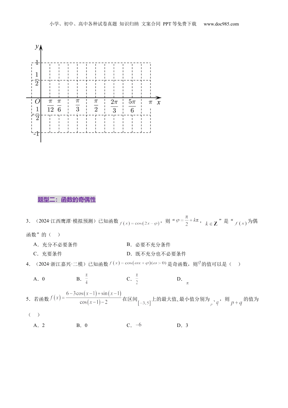 小学、初中、高中各种试卷真题知识归纳文案合同PPT等免费下载www.doc985.com第03讲三角函数的图象与性质目录01模拟基础练.......................................................................................................................................2题型一:五点作图法............................................................................................................................2题型二:函数的奇偶性........................................................................................................................3题型三:函数的周期性........................................................................................................................3题型四:函数的单调性........................................................................................................................4题型五:函数的对称性(对称轴、对称中心)................................................................................5题型六:函数的定义域、值域(最值)............................................................................................5题型七:三角函数性质的综合应用....................................................................................................6题型八:根据条件确定解析式............................................................................................................8题型九:三角函数图像变换................................................................................................................9题型十:三角函数实际应用问题......................................................................................................1002重难创新练.....................................................................................................................................1103真题实战练.....................................................................................................................................17小学、初中、高中各种试卷真题知识归纳文案合同PPT等免费下载www.doc985.com题型一:五点作图法1.设,函数的最小正周期为,且.(1)求和的值;(2)在给定坐标系中作出函数在上的图像;(3)若,求的取值范围.2.设函数()的最小正周期为,且(1)求和的值;(2)填下表并在给定坐标系中作出函数在上的图象;x小学、初中、高中各种试卷真题知识归纳文案合同PPT等免费下载www.doc985.com题型二:函数的奇偶性3.(2024·江西鹰潭·模拟预测)已知函数,则“,”是“为偶函数”的()A.充分不必要条件B.必要不充分条件C.充要条件D.既不充分也不必要条件4.(2024·浙江嘉兴·二模)已知函数是奇函数,则的值可以是()A.0B.C.D.5.若函数在区间上的最大值、最小值分别为、,则的值为()A.2B.0C.D.3小学、初中、高中各种试卷真题知识归纳文案合同PPT等免费下载www.doc985.com题型三:函数的周期性6.(2024·青海海西·模拟预测)已知函数(其中)的图象与直线的两个相邻交点的距离等于,则的值为()A.B.2C.1D.37.(2024·江苏南通·模拟预测)已知函数,若存在非零实数a,b,使恒成立,则满足条件的一组值可以是,.8.(2024·江西·模拟预测)函数的最小正周期为.9.已知函数图象的两个相邻对称中心之间的距离为,则.题型四:函数的单调性10.(2024·青海海南·二模)已知函数,且.若的最小值为,则的单调递增区间为()A.B.C.D.11.(2024·全国·模拟预测)函数的单调递增区间为()A.B.C.D.12.(2024·甘肃张掖·模拟预测)将函数的图象向左平移个单位长度后,再把图象上所有点的横坐标伸长为原来的2倍,得到函数的图象,若与的图象关于轴对称,则的一个单调递增区间为()A.B.C.D.小学、初中、高中各种试卷真题知...