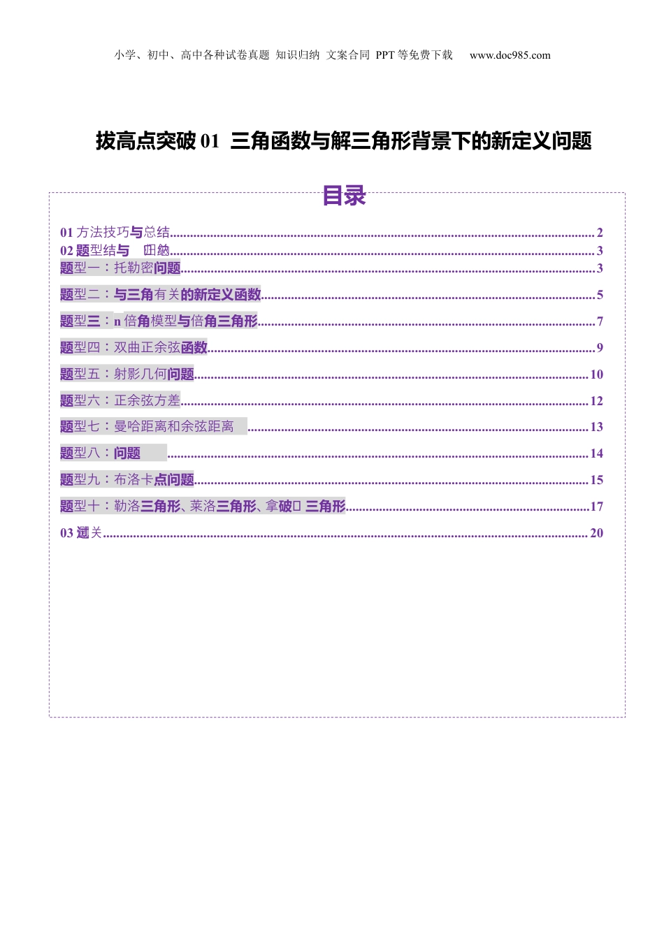 小学、初中、高中各种试卷真题知识归纳文案合同PPT等免费下载www.doc985.com拔高点突破01三角函数与解三角形背景下的新定义问题目录01与方法技巧结总...............................................................................................................................202题与结结型归纳总...............................................................................................................................3题问题型一:托勒密............................................................................................................................3题与三角的新定义函数型二:有关....................................................................................................5题三型:n角与角三角形倍模型倍.....................................................................................................7题函数型四:双曲正余弦....................................................................................................................9题问题型五:射影几何......................................................................................................................10题型六:正余弦方差..........................................................................................................................12题型七:曼哈距离和余弦距离......................................................................................................13题问题型八:..............................................................................................................................14题点问题型九:布洛卡......................................................................................................................15题三角形三角形破结三角形型十:勒洛、莱洛、拿.........................................................................1703关过测试.................................................................................................................................................20小学、初中、高中各种试卷真题知识归纳文案合同PPT等免费下载www.doc985.com在三角函数与解三角形背景下的新定义问题中,解题方法通常涉及对三角函数性质、解三角形方法的深入理解以及灵活应用。以下是一些常用的解题方法:1、理解新定义:首先,需要仔细阅读题目中的新定义,理解其含义和所涉及的数学概念。将新定义与已知的三角函数或解三角形的方法联系起来,找出其中的关联点。2、利用三角函数性质:应用三角函数的定义、诱导公式、同角关系式、和差化积公式等,将问题转化为已知的三角函数问题。利用三角函数的图像和性质,如周期性、奇偶性、单调性等,来分析和解决问题。3、应用解三角形的方法:使用正弦定理、余弦定理等解三角形的基本方法,将三角形的边和角联系起来。通过作辅助线、构造特殊三角形等方式,将复杂问题转化为简单问题。4、结合图形分析:在解题过程中,结合图形进行分析,可以更直观地理解问题。利用图形的对称性、相似性等性质,简化计算过程。5、注意特殊值和极端情况:在解题时,要注意考虑特殊值和极端情况,如角度为0°、90°、180°等。这些特殊值往往能提供更简单的解题路径或用于验证答案的正确性。6、综合应用多种方法:在解题过程中,可能需要综合运用多种方法,如代数法、几何法、三角法等。灵活转换不同的解题方法,以适应不同的问题情境。可以使用不同的方法或代入特殊值进行验证,以确保答案的正确性。解决三角函数与解三角形背景下的新定义问题,需要深入理解相关概念和方法,并灵活应用多种解题策略。通过不断的练习和反思,可以提高解决这类问题的能力。题型一:问题托勒密【典例1-1】古希腊数学家托勒密对凸四边形(凸四边形是指没有角度大于180°的四边形)进行研究...