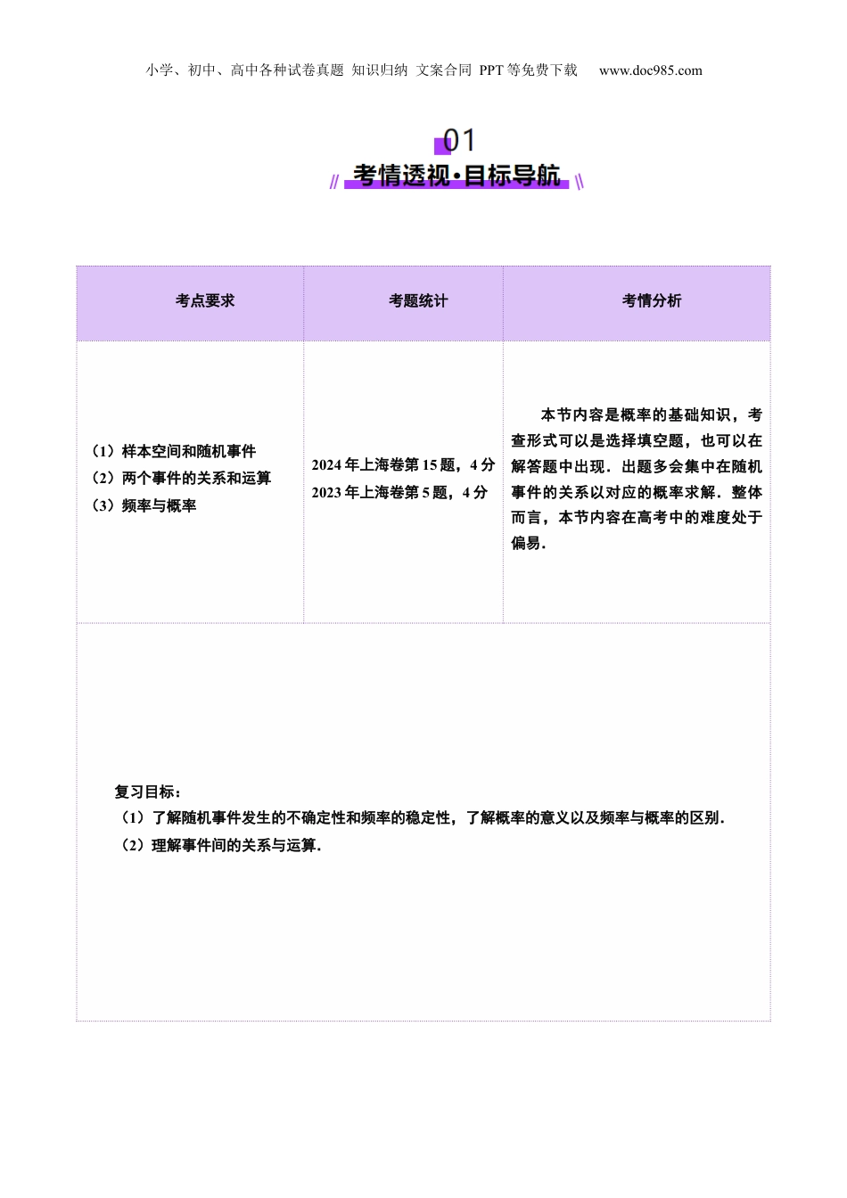 小学、初中、高中各种试卷真题知识归纳文案合同PPT等免费下载www.doc985.com第04讲随机事件、频率与概率目录01考情透视·目标导航..........................................................................................................................202知识导图·思维引航..........................................................................................................................303考点突破·题型探究..........................................................................................................................4知识点1:样本空间和随机事件.........................................................................................................4知识点2:两个事件的关系和运算.....................................................................................................5知识点3:概率与频率.........................................................................................................................6题型一:随机事件与样本空间............................................................................................................7题型二:随机事件的关系与运算........................................................................................................8题型三:频率与概率............................................................................................................................9题型四:生活中的概率......................................................................................................................10题型五:互斥事件与对立事件..........................................................................................................11题型六:利用互斥事件与对立事件计算概率..................................................................................1204真题练习·命题洞见........................................................................................................................1305课本典例·高考素材........................................................................................................................1406易错分析·答题模板........................................................................................................................15易错点:混淆频率和概率..................................................................................................................15答题模板:互斥、对立事件的辨析..................................................................................................16小学、初中、高中各种试卷真题知识归纳文案合同PPT等免费下载www.doc985.com考点要求考题统计考情分析(1)样本空间和随机事件(2)两个事件的关系和运算(3)频率与概率2024年上海卷第15题,4分2023年上海卷第5题,4分本节内容是概率的基础知识,考查形式可以是选择填空题,也可以在解答题中出现.出题多会集中在随机事件的关系以对应的概率求解.整体而言,本节内容在高考中的难度处于偏易.复习目标:(1)了解随机事件发生的不确定性和频率的稳定性,了解概率的意义以及频率与概率的区别.(2)理解事件间的关系与运算.小学、初中、高中各种试卷真题知识归纳文案合同PPT等免费下载www.doc985.com小学、初中、高中各种试卷真题知识归纳文案合同PPT等免费下载www.doc985.com知点识1随机事件:本空和样间1、随机试验我们把对随机现象的实现和对它的观察称为随机试验,简称试验,常用字母表示.我们感兴趣的是具有以下特点的随机试验:(1)试验可以在相同条件下重复进行;(2)试验的所有可能结果是明确可知的,并且不止一个;(3)每次试验总是恰好出现这些可...