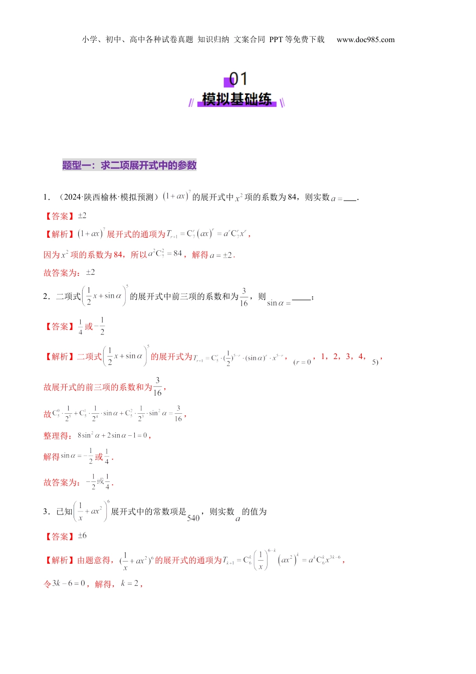 小学、初中、高中各种试卷真题知识归纳文案合同PPT等免费下载www.doc985.com第03讲二项式定理目录01模拟基础练.......................................................................................................................................2题型一:求二项展开式中的参数........................................................................................................2题型二:求二项展开式中的常数项....................................................................................................3题型三:求二项展开式中的有理项....................................................................................................4题型四:求二项展开式中的特定项系数............................................................................................5题型五:求三项展开式中的指定项....................................................................................................6题型六:求几个二(多)项式的和(积)的展开式中条件项系数................................................7题型七:求二项式系数最值................................................................................................................9题型八:求项的系数最值..................................................................................................................10题型九:求二项展开式中的二项式系数和、各项系数和..............................................................12题型十:求奇数项或偶数项系数和..................................................................................................13题型十一:整数和余数问题..............................................................................................................14题型十二:近似计算问题..................................................................................................................16题型十三:证明组合恒等式..............................................................................................................17题型十四:二项式定理与数列求和..................................................................................................21题型十五:杨辉三角..........................................................................................................................2302重难创新练.....................................................................................................................................2903真题实战练.....................................................................................................................................37小学、初中、高中各种试卷真题知识归纳文案合同PPT等免费下载www.doc985.com题型一:求二项展开式中的参数1.(2024·陕西榆林·模拟预测)的展开式中项的系数为84,则实数.【答案】【解析】展开式的通项为,因为项的系数为84,所以,解得.故答案为:2.二项式的展开式中前三项的系数和为,则;【答案】或【解析】二项式的展开式为,,1,2,3,4,,故展开式的前三项的系数和为,故,整理得:,解得或.故答案为:.3.已知展开式中的常数项是,则实数的值为【答案】【解析】由题意得,的展开式的通项为,令,解得,,小学、初中、高中各种试卷真题知识归纳文案合同PPT等免费下载www.doc985.com所以的展开式中的常数项为,解得.故答案为:.4.(2024·河北沧州·三模)已知的二项展开式中常数项为60,则.【答案】【解析】展开式的通项为,令,得,则的常数项为,当常数项为60时,.故答案为:.题型二:求二项展开式中的常数项5.(2024·新疆·三模)已知的展开式的各二项式系数的和为64,则其展开式的...