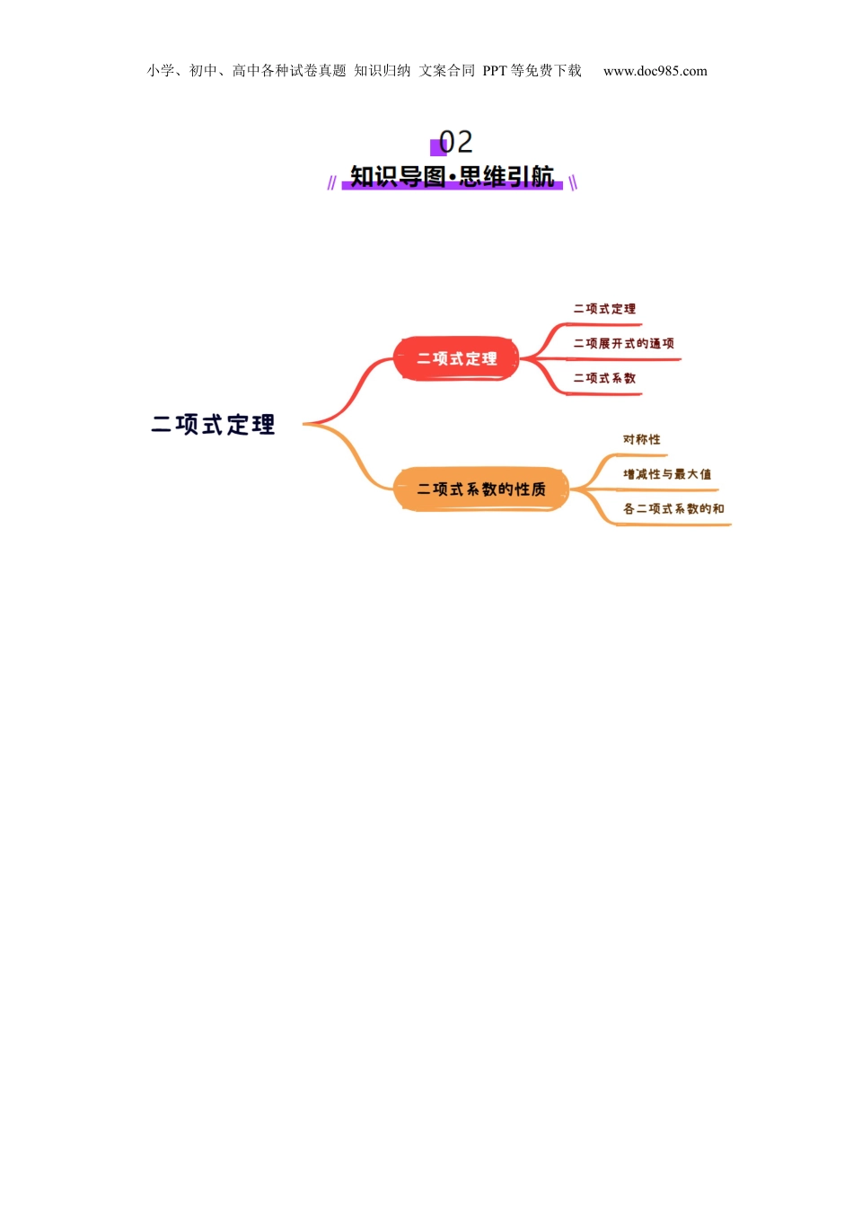 小学、初中、高中各种试卷真题知识归纳文案合同PPT等免费下载www.doc985.com第03讲二项式定理目录01考情透视·目航标导..........................................................................................................................202知识导图·思引航维..........................................................................................................................303考点突破·型探究题..........................................................................................................................4知点1二项式式定项定项:展开的的系数问题特、特......................................................................4知点2二项式式:展开中的最.................................................................................................5知点3二项式式:展开中系数和有关问题.........................................................................................6二项式型一:求展开中的参数题........................................................................................................7二二项式项题:求展开中的数型常....................................................................................................9二项式理项题:求展开中的有型三..................................................................................................11二项式定项题:求展开中的系数型四特..........................................................................................13项式定项题:求展开中的型五三指..................................................................................................15二项式式项题:求(多)的和()的展开中系数型六几个条件..............................................17二项式题:求系数型七最值..............................................................................................................19项值题:求的系数型八最..................................................................................................................21二项式二项式项题:求展开中的系数和系数和型九、各...............................................................24项项题:求数或数系数和型十奇偶..................................................................................................27题:数和数问题型十一整余..............................................................................................................30二题:计算问题型十近似..................................................................................................................32式题:证明等型十三合恒..............................................................................................................34二项式定理题:与数求和型十四列..................................................................................................39题:型十五三角..........................................................................................................................4304题习·题........................................................................................................................4605本典例课·高考素材........................................................................................................................4806易分析错·题........................................................................................................................51项二项式易点:混淆的系数与系数错..............................................................