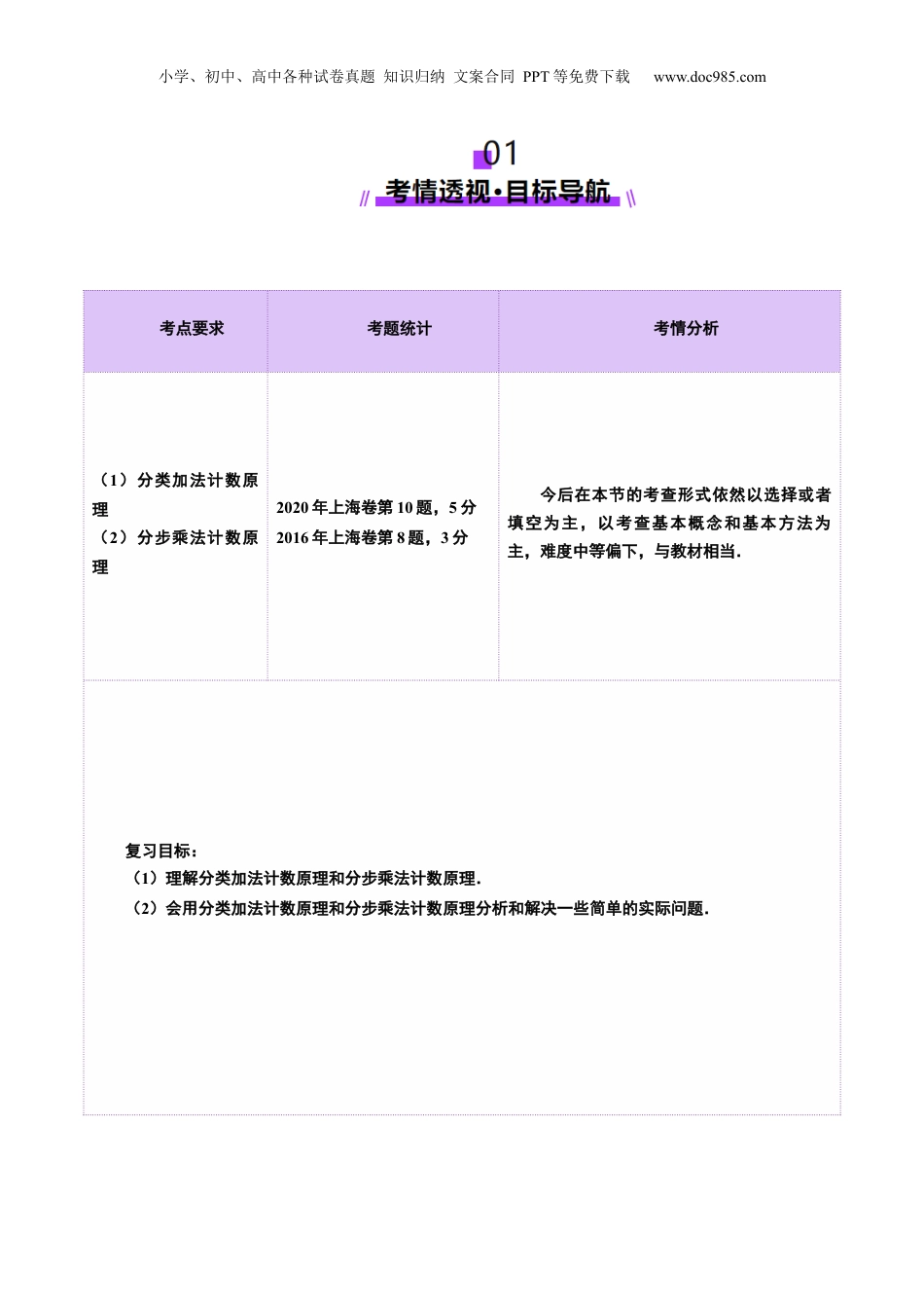 小学、初中、高中各种试卷真题知识归纳文案合同PPT等免费下载www.doc985.com第01讲计数原理目录01考情透视·目标导航..........................................................................................................................202知识导图·思维引航..........................................................................................................................303考点突破·题型探究..........................................................................................................................4知识点1:分类加法计数原理.............................................................................................................4知识点2:分步乘法计数原理.............................................................................................................4知识点3:两个计数原理的综合应用.................................................................................................5题型一:分类加法计数原理的应用....................................................................................................5题型二:分步乘法计数原理的应用....................................................................................................6题型三:两个计数原理的综合应用....................................................................................................704真题练习·命题洞见..........................................................................................................................805课本典例·高考素材..........................................................................................................................906易错分析·答题模板........................................................................................................................11易错点:对两种计数原理的概念理解不够深刻..............................................................................11答题模板:计数原理的应用..............................................................................................................12小学、初中、高中各种试卷真题知识归纳文案合同PPT等免费下载www.doc985.com考点要求考题统计考情分析(1)分类加法计数原理(2)分步乘法计数原理2020年上海卷第10题,5分2016年上海卷第8题,3分今后在本节的考查形式依然以选择或者填空为主,以考查基本概念和基本方法为主,难度中等偏下,与教材相当.复习目标:(1)理解分类加法计数原理和分步乘法计数原理.(2)会用分类加法计数原理和分步乘法计数原理分析和解决一些简单的实际问题.小学、初中、高中各种试卷真题知识归纳文案合同PPT等免费下载www.doc985.com小学、初中、高中各种试卷真题知识归纳文案合同PPT等免费下载www.doc985.com知点识1计数原理:分类加法完成一件事,有类办法,在第1类办法中有种不同的办法,在第2类办法中有种不同的方法,,在第…类办法中有种不同的方法,那么完成这件事共有:种不同的方法.【诊断自测】4.已知A,B两个公司承包6项工程,每个公司至少承包2项,则承包方式共有()A.24种B.70种C.48种D.50种知点识2计数原理:分步乘法完成一件事,需要分成个步骤,做第1步有种不同的方法,做第2步有种不同的方法,,做…第步有种不同的方法,那么完成这件事共有:种不同的方法.注意:两个原理及其区别分类加法计数原理和分类有关,如果完成某件事情有“”类办法,这类办法之间是互斥的,那么求完成这件事情的方法总数时,就用分类加法计数原理.分步乘法计数原理和分步有关,是针对分步完成的问题.如果完成某件事情有“”“”个步骤,而且这小学、初中、高中各种试卷真题知识归纳文案合同PPT等免费下载www.doc985.com几个步骤缺一不可,且互不影...