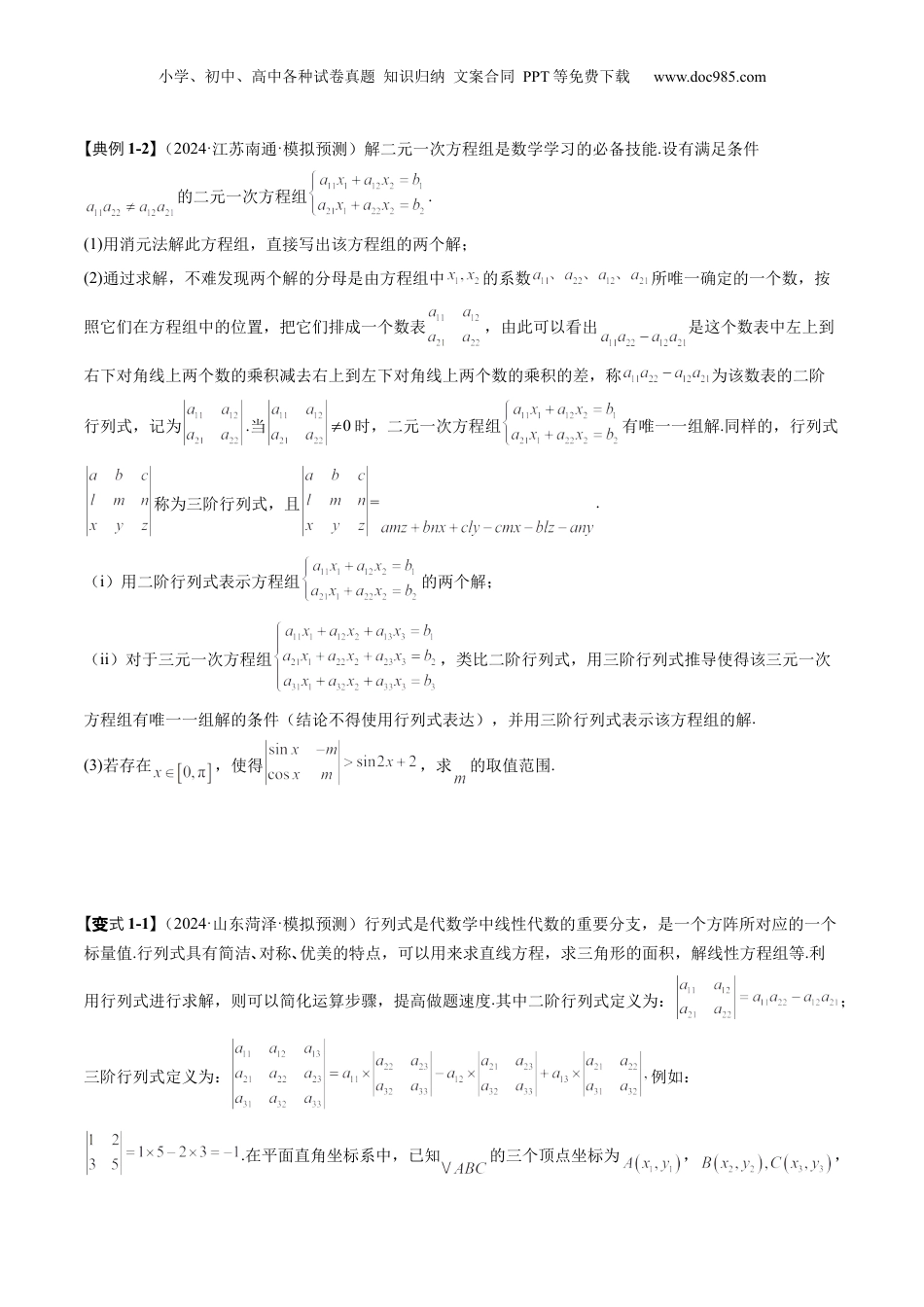小学、初中、高中各种试卷真题知识归纳文案合同PPT等免费下载www.doc985.com重难点突破02线性代数背景下新定义目录01方法技巧与总结...............................................................................................................................202题型归纳与总结...............................................................................................................................2题型一:行列式背景............................................................................................................................2题型二:矩阵背景................................................................................................................................4题型三:向量组背景............................................................................................................................7题型四:特征向量背景........................................................................................................................903过关测试.........................................................................................................................................11小学、初中、高中各种试卷真题知识归纳文案合同PPT等免费下载www.doc985.com线性代数中处理新定义问题时,首要任务是准确理解新定义的本质。方法技巧上,可以采取以下步骤:一、深入剖析新定义,明确其内涵与外延,把握关键要素。二、尝试将新定义与已知概念、定理或性质建立联系,利用已有知识体系进行推理。三、在解题过程中,灵活运用矩阵运算、线性变换、特征值与特征向量等工具,以及适当的代数或几何方法。四、注重验证结果的正确性,确保解题步骤和答案无误。总结时,应强调新定义在解题中的关键作用,回顾解题过程中用到的关键知识点和技巧。同时,总结新定义问题的常见类型和解题思路,以便在遇到类似问题时能迅速找到解决方法。通过不断练习和总结,可以逐渐提高解决线性代数新定义问题的能力,加深对线性代数学科的理解和掌握。背景型一:行列式题【典例1-1】(2024·河北保定·三模)对于任意给定的四个实数,,,,我们定义方阵,方阵对应的行列式记为,且,方阵与任意方阵的乘法运算定义如下:,其中方阵,且.设,,.(1)证明:.(2)若方阵,满足,且,证明:.小学、初中、高中各种试卷真题知识归纳文案合同PPT等免费下载www.doc985.com【典例1-2】(2024·江苏南通·模拟预测)解二元一次方程组是数学学习的必备技能.设有满足条件的二元一次方程组.(1)用消元法解此方程组,直接写出该方程组的两个解;(2)通过求解,不难发现两个解的分母是由方程组中的系数所唯一确定的一个数,按照它们在方程组中的位置,把它们排成一个数表,由此可以看出是这个数表中左上到右下对角线上两个数的乘积减去右上到左下对角线上两个数的乘积的差,称为该数表的二阶行列式,记为.当≠0时,二元一次方程组有唯一一组解.同样的,行列式称为三阶行列式,且=.(i)用二阶行列式表示方程组的两个解;(ii)对于三元一次方程组,类比二阶行列式,用三阶行列式推导使得该三元一次方程组有唯一一组解的条件(结论不得使用行列式表达),并用三阶行列式表示该方程组的解.(3)若存在,使得,求的取值范围.变【式1-1】(2024·山东菏泽·模拟预测)行列式是代数学中线性代数的重要分支,是一个方阵所对应的一个标量值.行列式具有简洁、对称、优美的特点,可以用来求直线方程,求三角形的面积,解线性方程组等.利用行列式进行求解,则可以简化运算步骤,提高做题速度.其中二阶行列式定义为:;三阶行列式定义为:例如:.在平面直角坐标系中,已知的三个顶点坐标为,,小学、初中、高中各种试卷真题知识归纳文案合同PPT等免费下载www.doc985.com则的面积公式可表示为:(1)已知,求的面积.(2)已知点,若点是圆上的动点,求面积的最小值.(3)已知椭圆,它的左焦点坐标为,右顶点坐标为,设点的坐标为,过原...