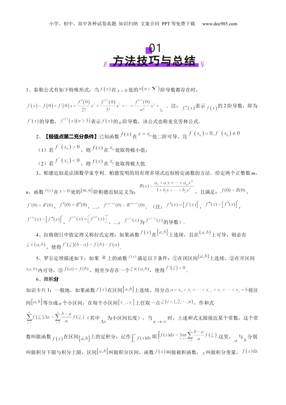 小学、初中、高中各种试卷真题知识归纳文案合同PPT等免费下载www.doc985.com重难点突破01高等数学定理背景下新定义目录01方法技巧与总结...............................................................................................................................202题型归纳与总结...............................................................................................................................4题型一:泰勒公式................................................................................................................................4题型二:极大值点的第二充分条件定理............................................................................................6题型三:帕德逼近................................................................................................................................8题型四:罗尔中值定理、拉格朗日中值定理、柯西中值定理........................................................9题型五:伯努利、琴生不等式..........................................................................................................11题型六:微积分、洛必达..................................................................................................................1403过关测试.........................................................................................................................................17小学、初中、高中各种试卷真题知识归纳文案合同PPT等免费下载www.doc985.com1、泰勒公式有如下特殊形式:当在处的阶导数都存在时,.注:表示的2阶导数,即为的导数,表示的阶导数,该公式也称麦克劳林公式.2、【极值点第二充分条件】已知函数在处二阶可导,且(1)若,则在处取得极小值;(2)若,则在处取得极大值.3、帕德近似是法国数学家亨利.帕德发明的用有理多项式近似特定函数的方法.给定两个正整数m,n,函数在处的阶帕德近似定义为:,且满足:,,,,….(注:,,,,;…为的导数).4、拉格朗日中值定理又称拉氏定理:如果函数在上连续,且在上可导,则必有,使得.5、罗尔定理描述如下:如果上的函数满足以下条件:①在闭区间上连续,②在开区间内可导,③,则至少存在一个,使得.6、分微积知识卡片1:一般地,如果函数在区间上连续,用分点将区间等分成个小区间,在每个小区间上任取一点,作和式(其中为小区间长度),当时,上述和式无限接近某个常数,这个常数叫做函数在区间上的定积分,记作即.这里,与分别叫做积分下限与积分上限,区间叫做积分区间,函数叫做被积函数,叫做积分变量,小学、初中、高中各种试卷真题知识归纳文案合同PPT等免费下载www.doc985.com叫做被积式.从几何上看,如果在区间上函数连续且恒有,那么定积分表示由直线和曲线所围成的曲边梯形的面积.知识卡片2:一般地;如果是区间上的连续函数,并且,那么.这个结论叫做微积分基本定理,又叫做牛顿-莱布尼茨公式.知识卡片3:在微积分中,求极限有一种重要的数学工具洛必达法则,法则中有结论:若函数——,的导函数分别为,,且,则.7、伯努利不等式(Bernoulli’sInequality),又称贝努利不等式,是高等数学的分析不等式中最常见的一种不等式,由瑞士数学家雅各布·伯努利提出:对实数,在时,有不等式成立;在时,有不等式成立.8、设连续函数的定义域为,如果对于内任意两数,都有,则称为上的凹函数;若,则称为凸函数.若是区间上的凹函数,则对任意的,有琴生不等式恒成立(当且仅当时等号成立).小学、初中、高中各种试卷真题知识归纳文案合同PPT等免费下载www.doc985.com型一:泰勒公式题【典例1-1】英国数学家泰勒发现了如下公式:,其中,此公式有广泛的用途,例如利用公式得到一些不等式:当时,,,(解答本题时,这些不等式根据需要可以直接使用).(1)证明:当时,;(2)设,若区间满足:当定义域为时,值域也为,则称区间为...