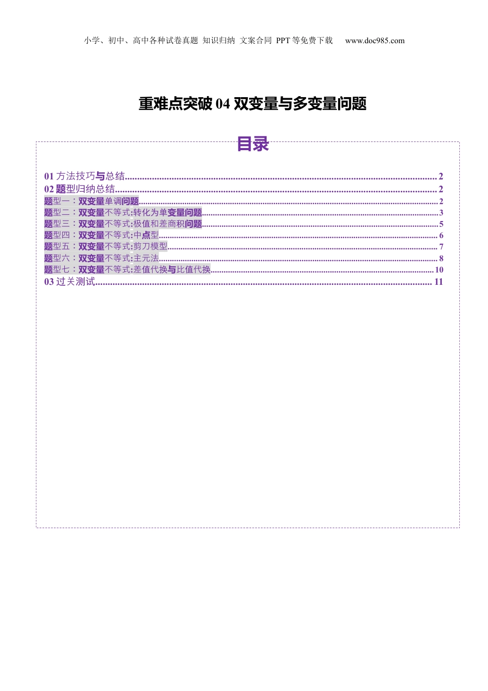 小学、初中、高中各种试卷真题知识归纳文案合同PPT等免费下载www.doc985.com重难点突破04双变量与多变量问题目录01与方法技巧总结...............................................................................................................................202题型归纳总结...................................................................................................................................2题双变量问题型一:单调..........................................................................................................................................2题双变量型二:不等式:变量问题转化为单.............................................................................................................3题双变量型三:不等式:问题极和差商值积.............................................................................................................5题双变量型四:不等式:点中型.................................................................................................................................6题双变量型五:不等式:剪刀模型.............................................................................................................................7题双变量型六:不等式:主元法.................................................................................................................................8题双变量型七:不等式:与差代比代值换值换.......................................................................................................1003关过测试.........................................................................................................................................11小学、初中、高中各种试卷真题知识归纳文案合同PPT等免费下载www.doc985.com破解双参数不等式的方法:一是转化,即由已知条件入手,寻找双参数满足的关系式,并把含双参数的不等式转化为含单参数的不等式;二是巧构函数,再借用导数,判断函数的单调性,从而求其最值;三是回归双参的不等式的证明,把所求的最值应用到双参不等式,即可证得结果.题双变量单单问题型一:【典例1-1】(2024·河北石家庄·模拟预测)已知函数,.(1)讨论函数的单调性;(2)若,对任意,当时,不等式恒成立,求实数m的取值范围.【典例1-2】已知函数.(1)当时,求曲线在处的切线方程;(2)设,证明:对任意,,.式【变1-1】已知函数.(1)讨论函数的单调性;(2)设,如果对任意,,求证:.小学、初中、高中各种试卷真题知识归纳文案合同PPT等免费下载www.doc985.com式【变1-2】(2024·安徽·三模)设,函数.()讨论函数Ⅰ在定义域上的单调性;()若函数Ⅱ的图象在点处的切线与直线平行,且对任意,,不等式恒成立,求实数的取值范围.式【变1-3】已知函数.(1)若函数在点处的切线与直线平行,求的方程;(2)判断命题“对任意恒成立的真假,并说明理由;”(3)若对任意都有恒成立,求实数m的取值范围.式【变1-4】(2024·全国·模拟预测)已知函数,,且.(1)当时,讨论的单调性;(2)当时,若对任意的,不等式恒成立,求实数的取值范围.小学、初中、高中各种试卷真题知识归纳文案合同PPT等免费下载www.doc985.com题双变量型二:不等式:变量问题转化为单【典例2-1】设函数.(1)当时,求函数的单调区间;(2)若函数有两个极值点,且,求的最小值.【典例2-2】(2024·高三·天津宁河·期末)已知函数,.(1)当时,求曲线在处的切线方程;(2)求的单调区间;(3)设是函数的两个极值点,证明:.式【变2-1】已知函数,其中自然常数.(1)若是函数的极值点,求实数的值;(2)当时,设函数的两个极值点为,且,求证:.式【变2-2】(2024·河南商丘·模拟预测)已知函数的定义域为,其导函数.(1)求曲线在点处的切线的方程,并判断是否经过一个定点;(2)若,满足,且,求的取值范围.小...