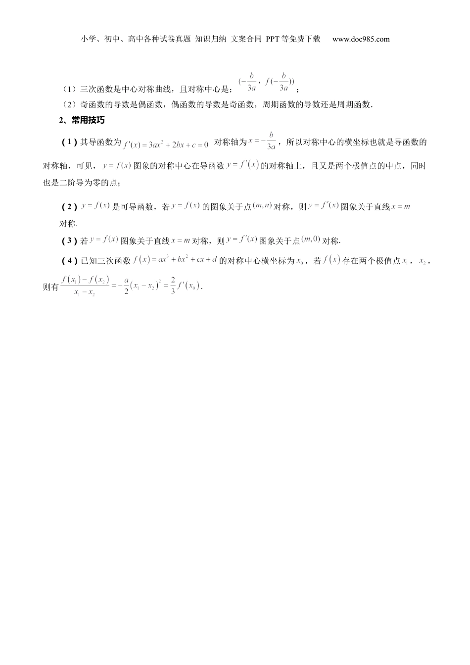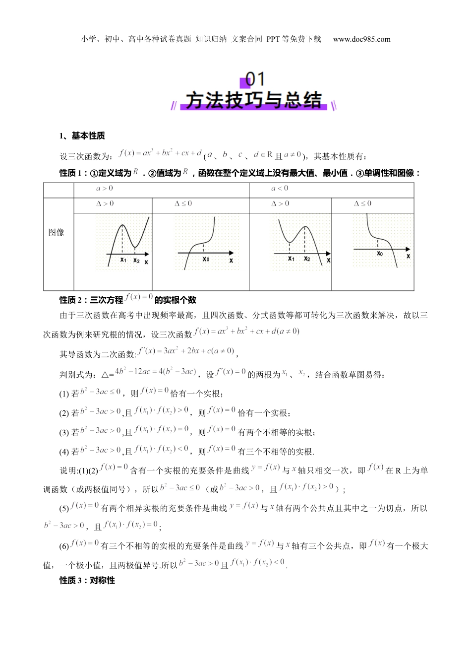 小学、初中、高中各种试卷真题知识归纳文案合同PPT等免费下载www.doc985.com重难点突破03三次函数的图象和性质目录01方法技巧与总结...............................................................................................................................202题型归纳总结...................................................................................................................................4三次函数的点型一:零题问题..................................................................................................................................4三次函数的题型二:最值、极值问题......................................................................................................................5三三次函数的性题型:单调问题..............................................................................................................................6三次函数的题型四:切线问题..................................................................................................................................6三次函数的题型五:对称问题..................................................................................................................................7三次函数的题型六:综合问题..................................................................................................................................7三次函数题型七:恒成立问题..................................................................................................................................9题型八:等极值线问题............................................................................................................................................1003关过测试.........................................................................................................................................11小学、初中、高中各种试卷真题知识归纳文案合同PPT等免费下载www.doc985.com1、基本性质设三次函数为:(、、、且),其基本性质有:性质1:①定义域为.②值域为,函数在整个定义域上没有最大值、最小值.③单调性和图像:图像性质2:三次方程的实根个数由于三次函数在高考中出现频率最高,且四次函数、分式函数等都可转化为三次函数来解决,故以三次函数为例来研究根的情况,设三次函数其导函数为二次函数:,判别式为:△=,设的两根为、,结合函数草图易得:(1)若,则恰有一个实根;(2)若,且,则恰有一个实根;(3)若,且,则有两个不相等的实根;(4)若,且,则有三个不相等的实根.说明:(1)(2)含有一个实根的充要条件是曲线与轴只相交一次,即在R上为单调函数(或两极值同号),所以(或,且);(5)有两个相异实根的充要条件是曲线与轴有两个公共点且其中之一为切点,所以,且;(6)有三个不相等的实根的充要条件是曲线与轴有三个公共点,即有一个极大值,一个极小值,且两极值异号.所以且.性质3:对称性小学、初中、高中各种试卷真题知识归纳文案合同PPT等免费下载www.doc985.com(1)三次函数是中心对称曲线,且对称中心是;;(2)奇函数的导数是偶函数,偶函数的导数是奇函数,周期函数的导数还是周期函数.2、常用技巧(1)其导函数为对称轴为,所以对称中心的横坐标也就是导函数的对称轴,可见,图象的对称中心在导函数的对称轴上,且又是两个极值点的中点,同时也是二阶导为零的点;(2)是可导函数,若的图象关于点对称,则图象关于直线对称.(3)若图象关于直线对称,则图象关于点对称.(4)已知三次函数的对称中心横坐标为,若存在两个极值点,,则有.小学、初中、高中各种试卷真题知识归纳文案合同PPT等免费下载www.doc985.com三次函数的点问问型一:零【典例1-1】一般地,对于一元三次函数,若,则为三次函数的对称中心,已知函数图象的对...