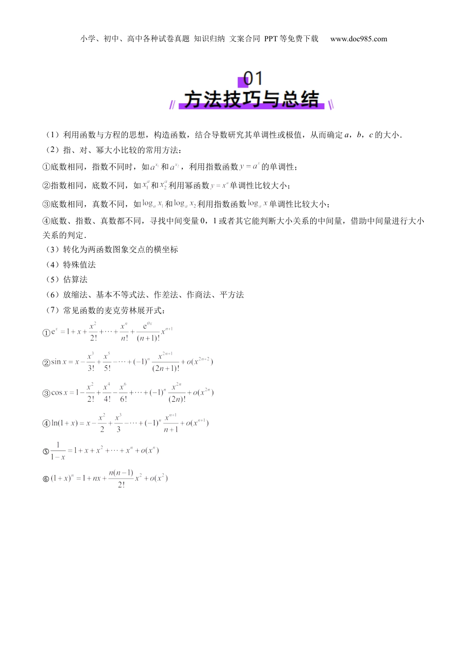 小学、初中、高中各种试卷真题知识归纳文案合同PPT等免费下载www.doc985.com重难点突破01玩转指对幂比较大小目录01方法技巧与总结...............................................................................................................................202题型归纳总结...................................................................................................................................3型一:直接利用性题单调..........................................................................................................................................3题型二:引入媒介值..................................................................................................................................................3题型三:含变量问题..................................................................................................................................................4题型四:构造函数......................................................................................................................................................4题型五:数形结合......................................................................................................................................................5题型六:特殊值法、估算法......................................................................................................................................6题型七:放缩法..........................................................................................................................................................6题型八:不定方程......................................................................................................................................................7题型九:泰勒展开......................................................................................................................................................7题型十:同构法..........................................................................................................................................................8题型十一:帕德逼近估算法......................................................................................................................................903关过测试...........................................................................................................................................9小学、初中、高中各种试卷真题知识归纳文案合同PPT等免费下载www.doc985.com(1)利用函数与方程的思想,构造函数,结合导数研究其单调性或极值,从而确定a,b,c的大小.(2)指、对、幂大小比较的常用方法:①底数相同,指数不同时,如和,利用指数函数的单调性;②指数相同,底数不同,如和利用幂函数单调性比较大小;③底数相同,真数不同,如和利用指数函数单调性比较大小;④底数、指数、真数都不同,寻找中间变量0,1或者其它能判断大小关系的中间量,借助中间量进行大小关系的判定.(3)转化为两函数图象交点的横坐标(4)特殊值法(5)估算法(6)放缩法、基本不等式法、作差法、作商法、平方法(7)常见函数的麦克劳林展开式:①②③④⑤⑥小学、初中、高中各种试卷真题知识归纳文案合同PPT等免费下载www.doc985.com型一:直接利用性【典例1-1】记,则()A.B.C.D.【典例1-2】(2024·全国·模拟预测)已知,,,则实数a,b,c的大小关系是()A.B.C.D.【变式1-1】设,,,则()A.B.C.D.【变式1-2】(2024·宁夏银川·三模)已知,,,则()A.B.C.D.型二:引入媒介【典例2-1】(2024·甘肃兰州·二模)故,,,则...