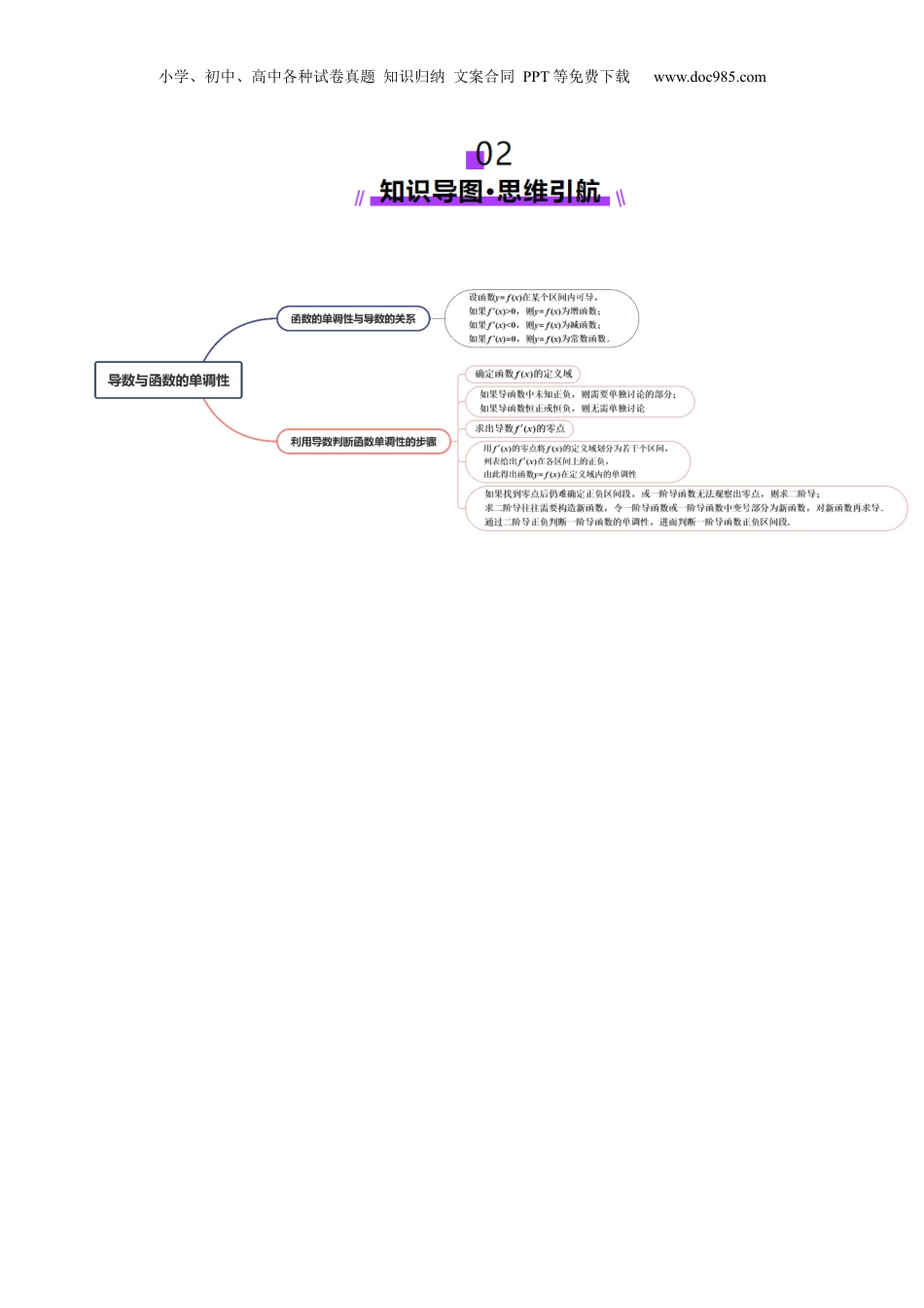 小学、初中、高中各种试卷真题知识归纳文案合同PPT等免费下载www.doc985.com第02讲导数与函数的单调性目录01考情透视·目导航标...............................................................................................................................................202导知识图·思引航维...............................................................................................................................................303考点突破·型探究题...............................................................................................................................................4知点识1函数的单调性与导数的:关系...................................................................................................................4知点识2导数函数单调性的:利用判断步...............................................................................................................4解题方法总结..............................................................................................................................................................5导函数与函数的函数题型一:利用原关系确定原图像..........................................................................................5单调型二:求区..........................................................................................................................................................7函数的数型三:已知含参在区上增或减,求参范..................................................................................................8函数单调数型四:已知含参在区上不,求参范题间围..........................................................................................8函数数型五:已知含参在区上存在增区或减区,求参范间间间..........................................................................9数单调性讨讨型六:不含参......................................................................................................................................10导函数函数的单调性型七:含参一次分析............................................................................................................11导函数函数的单调性型八:含参准一次分析题为................................................................................................12导函数的函数单调性型九:含参可因式分解二次分析........................................................................................13导函数的函数单调性型十:含参不可因式分解二次分析....................................................................................14导函数函数的单调性型十一:含参准二次型分析题为........................................................................................15函数的单调性型十二:分段分析法题讨论............................................................................................................1604真题练习·命题洞见..............................................................................................................................................1705本典例课·高考素材..............................................................................................................................................1706易分析错·答模板题..............................................................................................................................................19导数与函数单调性易点:“符号”“”关系理解不透错对值彻..................