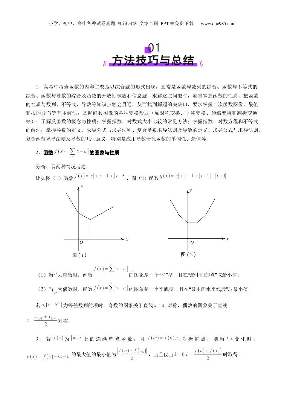 小学、初中、高中各种试卷真题知识归纳文案合同PPT等免费下载www.doc985.com拔高点突破01函数的综合应用目录01方法技巧与总结...............................................................................................................................202题型归纳总结...................................................................................................................................3函数数的综合型一:与列题......................................................................................................................................3函数的综合题型二:与不等式..................................................................................................................................6函数的题型三:中创新题..........................................................................................................................................9的函数题型四:最大值最小值问题(平口单峰、铅锤距离)............................................................................12函数题型五:倍值....................................................................................................................................................16函数点题型六:不动问题........................................................................................................................................20函数的题型七:旋转问题........................................................................................................................................23函数的题型八:伸缩变换问题................................................................................................................................26题型九:V函数函数型和平底................................................................................................................................2903关过测试.........................................................................................................................................35小学、初中、高中各种试卷真题知识归纳文案合同PPT等免费下载www.doc985.com1、高考中考查函数的内容主要是以综合题的形式出现,通常是函数与数列的综合、函数与不等式的综合、函数与导数的综合及函数的开放性试题和信息题,求解这些问题时,着重掌握函数的性质,把函数的性质与数列、不等式、导数等知识点融会贯通,从而找到解题的突破口,要求掌握二次函数图像、最值和根的分布等基本解法;掌握函数图像的各种变换形式(如对称变换、平移变换、伸缩变换和翻折变换等);了解反函数的概念与性质;掌握指数、对数式大小比较的常见方法;掌握指数、对数方程和不等式的解法;掌握导数的定义、求导公式与求导法则、复合函数求导法则及导数的定义、求导公式与求导法则、复合函数求导法则及导数的几何意义,特别是应用导数研究函数的单调性、最值等.2、函数的图象与性质分奇、偶两种情况考虑:比如图(1)函数,图(2)函数图(1)yxO图(2)Oyx(1)当为奇数时,函数的图象是一个“型,且在最中间的点取最小值;”“”(2)当为偶数时,函数的图象是一个平底型,且在最中间水平线段取最小值;“”若为等差数列的项时,奇数的图象关于直线对称,偶数的图象关于直线对称.3、若为上的连续单峰函数,且为极值点,则当变化时,的最大值的最小值为,当且仅当时取得.小学、初中、高中各种试卷真题知识归纳文案合同PPT等免费下载www.doc985.com函数数的综合型一:与列【典例1-1】(2024·四川资阳·模拟预测)将函数在上的所有极值点按照由小到大的顺序排列,得到数列(其中),则()A.B.C.D.为递减数列【答案】D【解析】因为所以,令,故函数在上的所有极值点为函数在上的零点,即方程的正根,...