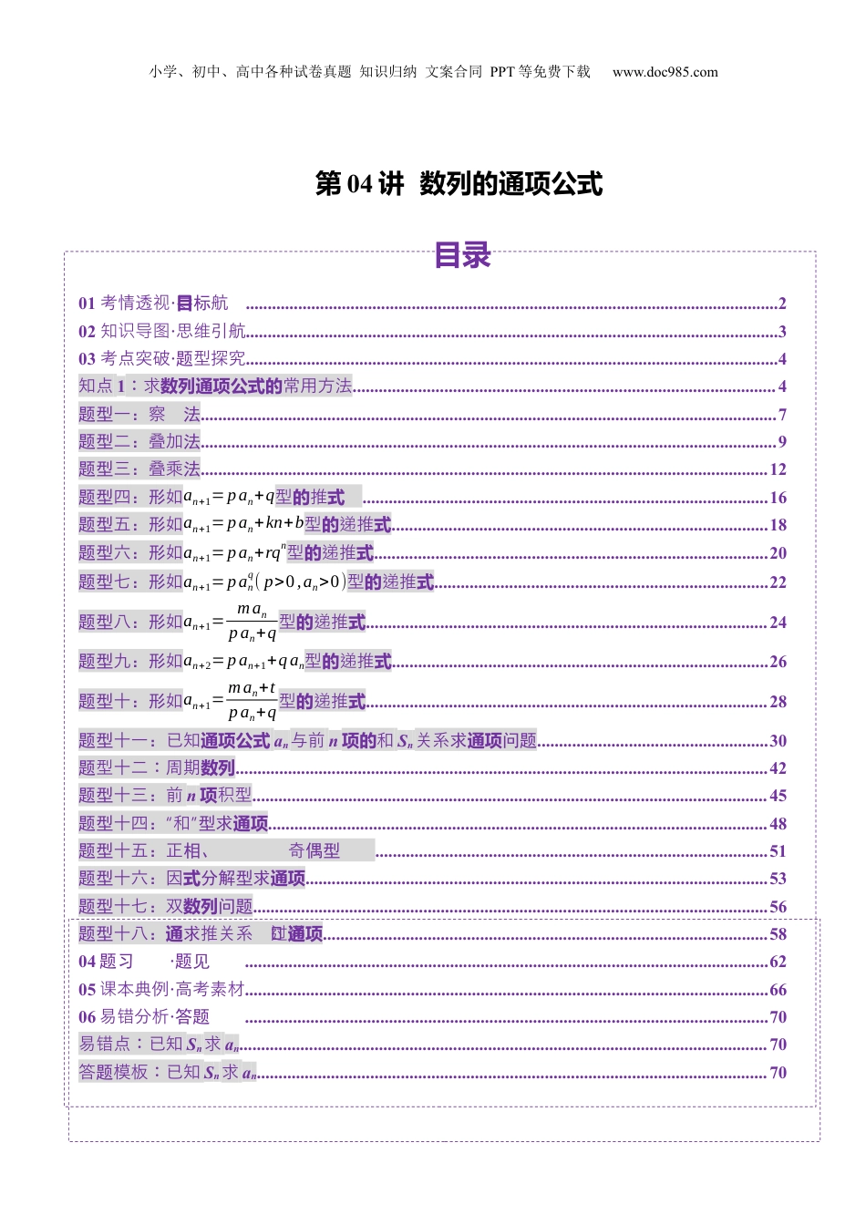 小学、初中、高中各种试卷真题知识归纳文案合同PPT等免费下载www.doc985.com第04讲数列的通项公式目录01考情透视·目航标导..........................................................................................................................202知识导图·思引航维..........................................................................................................................303考点突破·型探究题..........................................................................................................................4知点1数列通项公式的:求常用方法.................................................................................................4题型:法一察....................................................................................................................................7题型:法二叠加....................................................................................................................................9题型:法三叠乘..................................................................................................................................12题型:形四如an+1=pan+q的式型推.............................................................................................16题型:形五如an+1=pan+kn+b的式型推递......................................................................................18题型:形六如an+1=pan+rqn的式型推递..........................................................................................20题型:形七如an+1=panq(p>0,an>0)的式型推递............................................................................22题型:形八如an+1=manpan+q的式型推递............................................................................................24题型:形九如an+2=pan+1+qan的式型推递......................................................................................26题型:形十如an+1=man+tpan+q的式型推递............................................................................................28通项公式题型:十一已知an与前n项的和Sn通项求问题关系.....................................................30数列型十二:周期题..........................................................................................................................42题型:十三前n项型积......................................................................................................................45通项题型:型求十四“和”..................................................................................................................48题型:相、偶型十五正奇..........................................................................................51式通项题型:分解型求十六因..........................................................................................................53数列题型:问题十七双......................................................................................................................56通求通项题型:求十八推关系过递......................................................................................................5804题习·题见........................................................................................................................6205本典例课·高考素材........................................................................................................................6606易分析错·答题........................