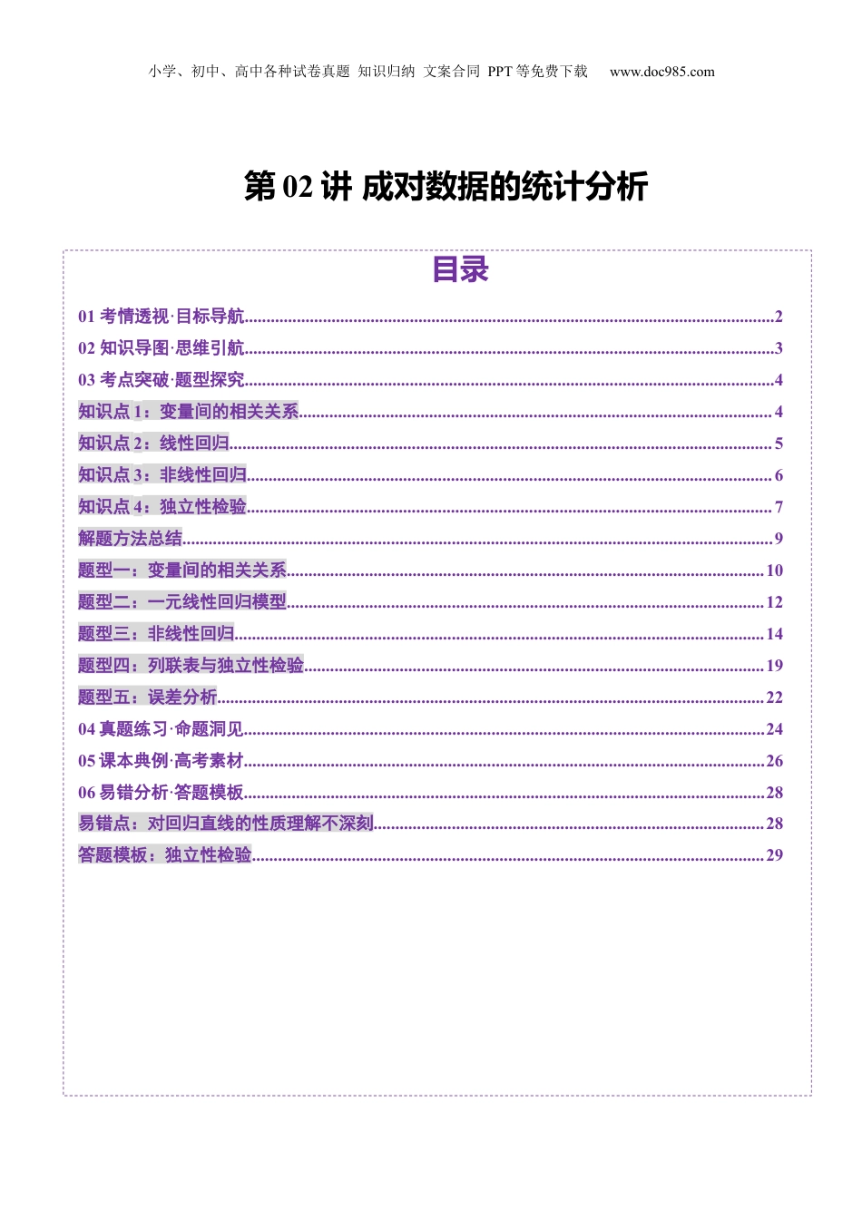 小学、初中、高中各种试卷真题知识归纳文案合同PPT等免费下载www.doc985.com第02讲成对数据的统计分析目录01考情透视·目标导航..........................................................................................................................202知识导图·思维引航..........................................................................................................................303考点突破·题型探究..........................................................................................................................4知识点1:变量间的相关关系.............................................................................................................4知识点2:线性回归.............................................................................................................................5知识点3:非线性回归.........................................................................................................................6知识点4:独立性检验.........................................................................................................................7解题方法总结........................................................................................................................................9题型一:变量间的相关关系..............................................................................................................10题型二:一元线性回归模型..............................................................................................................12题型三:非线性回归..........................................................................................................................14题型四:列联表与独立性检验..........................................................................................................19题型五:误差分析..............................................................................................................................2204真题练习·命题洞见........................................................................................................................2405课本典例·高考素材........................................................................................................................2606易错分析·答题模板........................................................................................................................28易错点:对回归直线的性质理解不深刻..........................................................................................28答题模板:独立性检验......................................................................................................................29小学、初中、高中各种试卷真题知识归纳文案合同PPT等免费下载www.doc985.com考点要求考题统计考情分析(1)变量的相关关系(2)样本相关系数(3)一元线性回归模型(4)列联表与独立性检验2024年甲卷(理)第17题,12分2023年上海卷第14题,4分2023年天津卷第7题,5分2023年甲卷(文)第19题,12分2022年I卷第20题,12分从近五年的全国卷的考查情况来看,本节是高考的热点,主要以解答题形式出现,经常与概率综合出题,一般难度为中等.也可能以选择题、填空题形式出现,难度不大.主要以应用题的方式出现,多与经济、生活实际相联系,需要在复杂的题目描述中找出数量关系,建立数学模型,并且运用数学模型解决实际问题.复习目标:(1)了解样本相关系数的统计含义.(2)理解一元线性回归模型和2×2列联表,会运用这些方法解决简单的实际问题.(3)会利用统计软...