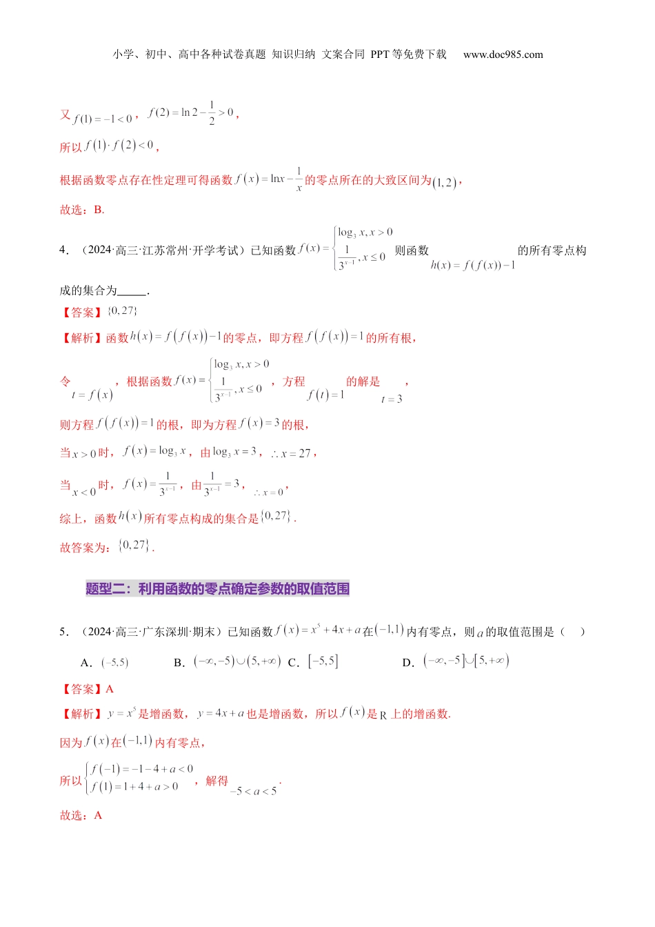 小学、初中、高中各种试卷真题知识归纳文案合同PPT等免费下载www.doc985.com第07讲函数与方程目录模拟基础练............................................................................................................................................2题型一:求函数的零点或零点所在区间..................................................................................................................2题型二:利用函数的零点确定参数的取值范围......................................................................................................3题型三:方程根的个数与函数零点的存在性问题..................................................................................................5题型四:嵌套函数的零点问题..................................................................................................................................7题型五:函数的对称问题........................................................................................................................................10题型六:函数的零点问题之分段分析法模型........................................................................................................14题型七:唯一零点求值问题....................................................................................................................................16题型八:分段函数的零点问题................................................................................................................................18题型九:零点嵌套问题............................................................................................................................................21题型十:等高线问题................................................................................................................................................24题型十一:二分法....................................................................................................................................................28重难创新练..........................................................................................................................................31真题实战练..........................................................................................................................................45小学、初中、高中各种试卷真题知识归纳文案合同PPT等免费下载www.doc985.com题型一:求函数的零点或零点所在区间1.(2024·高三·北京东城·开学考试)已知函数则函数的零点为【答案】【解析】当时,由,即,解得或(舍),当时,由,解得,综上可得,函数的零点为.故答案为:.2.(2024·高三·浙江宁波·期末)函数的零点所在区间为()A.B.C.D.【答案】B【解析】由已知,可知为增函数,且,,根据零点存在定理,函数在有零点,且零点是唯一的.故选:B3.函数的零点所在的大致区间是()A.B.C.D.【答案】B【解析】的定义域为,又与在上单调递增,所以在上单调递增,小学、初中、高中各种试卷真题知识归纳文案合同PPT等免费下载www.doc985.com又,,所以,根据函数零点存在性定理可得函数的零点所在的大致区间为,故选:B.4.(2024·高三·江苏常州·开学考试)已知函数则函数的所有零点构成的集合为.【答案】【解析】函数的零点,即方程的所有根,令,根据函数,方程的解是,则方程的根,即为方程的根,当时,,由,,当时,,由,,综上,函数所有零点构成的集合是.故答案为:.题型二:利用函数的零点确定参数的取值范围5.(2024·高三·广东深圳·期末)已知函数在内有零点,则的取值范围是()A.B.C.D.【答案】A【解析】是增函数,也是增函数,所...