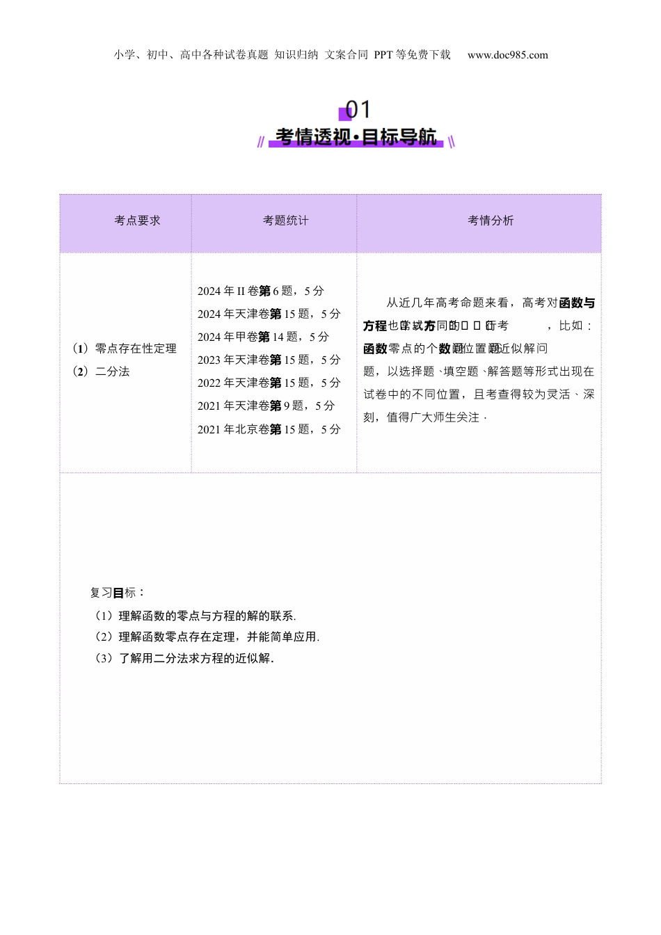 小学、初中、高中各种试卷真题知识归纳文案合同PPT等免费下载www.doc985.com第07讲函数与方程目录01考情透视·目航标导..........................................................................................................................202知识导图·思引航维..........................................................................................................................303考点突破·型探究题..............................................................................................................................4知点识1函数与方程:的零点的解...........................................................................................................................4知点识2:二分法.......................................................................................................................................................4方解法..............................................................................................................................................................5函数题型一:求的零点或零点所在区间..........................................................................................................................5函数数题型二:利用的零点确定参的取值范围..................................................................................................................6方程数与函数题型三:根的个零点的存在性问题..............................................................................................................7函数题型四:嵌套的零点问题..............................................................................................................................................7函数题型五:的对称问题..........................................................................................................................................9函数题型六:的零点问题之分段分析法模型........................................................................................................10题型七:唯一零点求值问题....................................................................................................................................10函数题型八:分段的零点问题............................................................................................................................................11题型九:零点嵌套问题........................................................................................................................................................12题型十:等高线问题................................................................................................................................................13题型十一:二分法........................................................................................................................................................1404真题练习·命洞题见........................................................................................................................1505本典例课·高考素材........................................................................................................................1606易分析错·答题模板........................................................................................................................17函数与方程易点:不理解象根的系联错图.........................................................................................