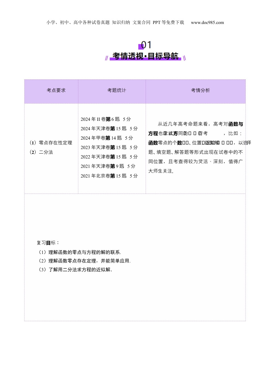 小学、初中、高中各种试卷真题知识归纳文案合同PPT等免费下载www.doc985.com第07讲函数与方程目录01考情透视·目航标导..........................................................................................................................202知识导图·思引航维..........................................................................................................................303考点突破·型探究题..............................................................................................................................4知点识1函数与方程:的零点的解...........................................................................................................................4知点识2:二分法.......................................................................................................................................................5方解法..............................................................................................................................................................6函数题型一:求的零点或零点所在区间..........................................................................................................................6函数数题型二:利用的零点确定参的取值范围..................................................................................................................9方程数与函数题型三:根的个零点的存在性问题............................................................................................................12函数题型四:嵌套的零点问题............................................................................................................................................17函数题型五:的对称问题........................................................................................................................................21函数题型六:的零点问题之分段分析法模型........................................................................................................24题型七:唯一零点求值问题....................................................................................................................................27函数题型八:分段的零点问题............................................................................................................................................30题型九:零点嵌套问题........................................................................................................................................................34题型十:等高线问题................................................................................................................................................38题型十一:二分法........................................................................................................................................................4304真题练习·命洞题见........................................................................................................................4505本典例课·高考素材........................................................................................................................5206易分析错·答题模板........................................................................................................................54函数与方程易点:不理解象根的系联错图............................................................................................