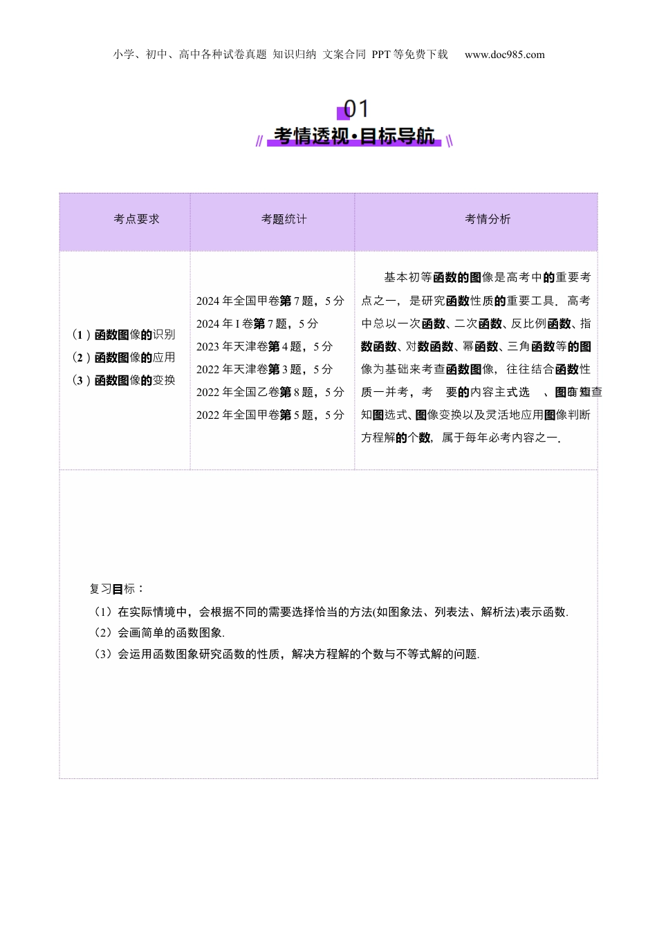 小学、初中、高中各种试卷真题知识归纳文案合同PPT等免费下载www.doc985.com第06讲函数的图象目录01考情透视·目航标导..........................................................................................................................202图知识导·思引航维..........................................................................................................................303考点突破·型探究题..........................................................................................................................4知点识1函数的图:掌握基本初等像...........................................................................................................................4知点识2函数图:像作法...............................................................................................................................................4解方法题总结..............................................................................................................................................................6图图题解析式选()型一:由识..............................................................................................................................7图象题选表式型二:由达..........................................................................................................................................9数的图象题表式问题型三:达含参........................................................................................................................13函数图象题用题型四:........................................................................................................................................18函数图象的变变题型五:........................................................................................................................................21函数的图函数的变题用研究性质、型六:利像最................................................................................................24函数的图题用解不等式型七:利像........................................................................................................................27函数的图题用问题型八:利像求恒成立................................................................................................................30函数的图的数题用个型九:利像判断零点............................................................................................................3404题·题........................................................................................................................3905本典例课·高考素材........................................................................................................................4206易分析错·题........................................................................................................................45图的问题易点:像错变换........................................................................................................................................45图的答模板:像题问题变换....................................................................................................................................45小学、初中、高中各种试卷真题知识归纳文案合同PPT等免费下载www.doc985.com考点要求考题统计考情分析(1函数图的)像识别(2函数图的)像应用(3函数图的)像变换2024第年全国甲卷7题,5分2024年I第卷7题,5分2023第年天津卷4题,5分2022...