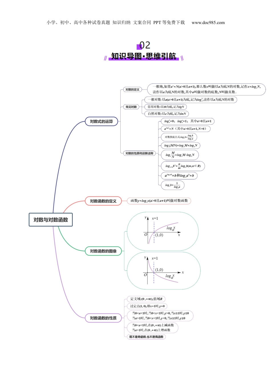 小学、初中、高中各种试卷真题知识归纳文案合同PPT等免费下载www.doc985.com第05讲对数与对数函数目录01考情透视·目航标导..........................................................................................................................202知识导图·思引航维..........................................................................................................................303考点突破·型探究题..........................................................................................................................4知点识1对数:式的运算...........................................................................................................................................4知点识2对数函数:的定及像...................................................................................................................................5解方法题总结..............................................................................................................................................................5对数题型一:式的运算..............................................................................................................................................6对数函数题型二:的图象及应用..............................................................................................................................6对数函数题型三:过定点问题..................................................................................................................................8对数题型四:比较式的大小......................................................................................................................................8对数题型五:解方程或不等式..................................................................................................................................9对数函数与题型六:的最值值域问题....................................................................................................................10对数函数题型七:中的恒成立问题........................................................................................................................11对数函数题型八:的综合问题................................................................................................................................1204真题练习·命洞题见........................................................................................................................1305本典例课·高考素材........................................................................................................................1406易分析错·答题模板........................................................................................................................15对数函数数数易点:无中底和真的范错视围........................................................................................................15对数函数答题模板:型复合的单调问题....................................................................................................................................16小学、初中、高中各种试卷真题知识归纳文案合同PPT等免费下载www.doc985.com考点要求考题统计考情分析(1对数)的概念及运算性质(2)对数函数的象图(3对数函数)的性质2024年II第卷8题,5分2024第年北京卷7题,4分2024第年天津卷5题,5分2023第年北京卷11题,5分2023年I第卷10题,5分2022第年天津卷6题,5分2022第年浙江卷7题,5分2022年I卷I第卷7题,5...