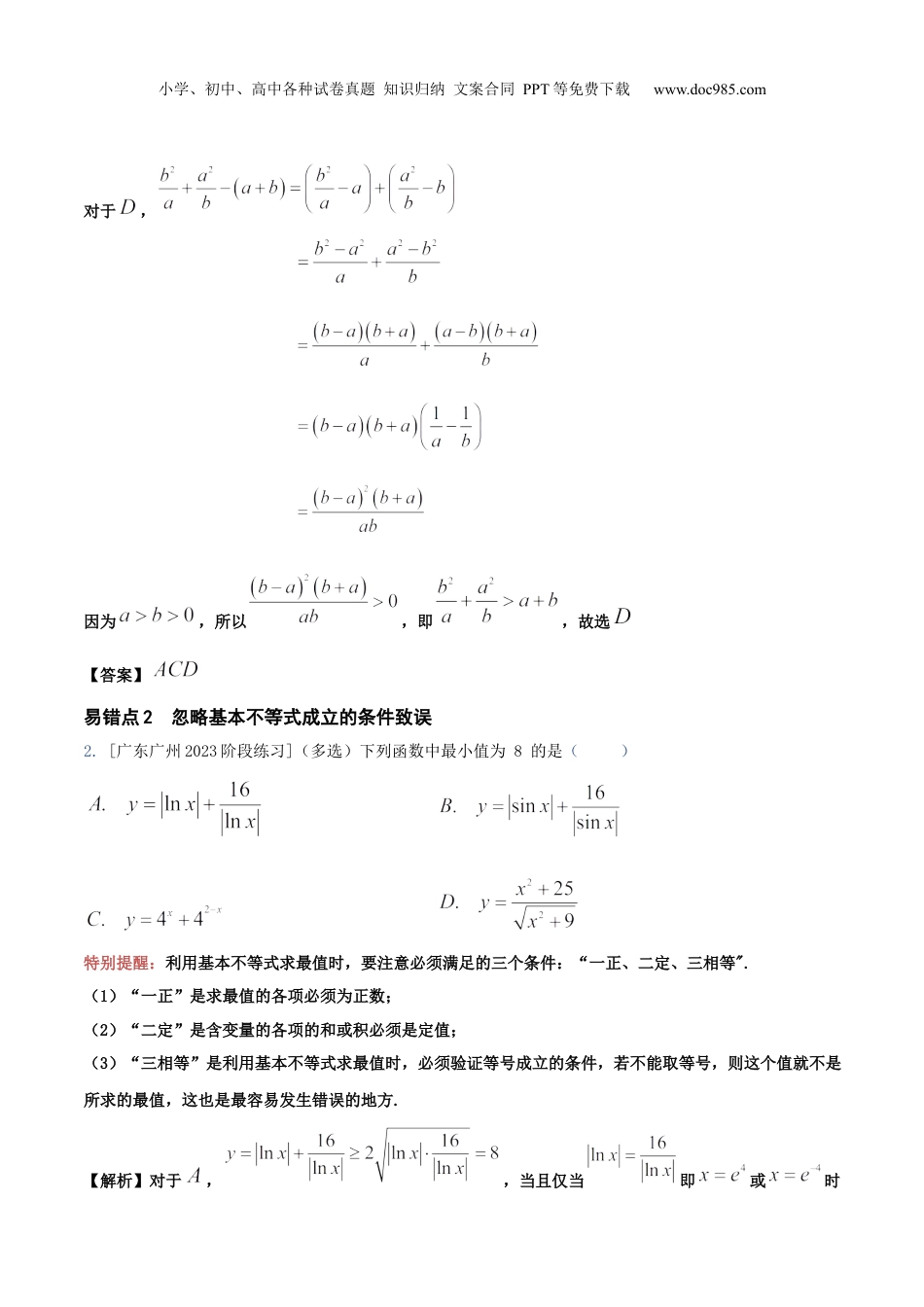 小学、初中、高中各种试卷真题知识归纳文案合同PPT等免费下载www.doc985.com易错02不等式(4个易错点错因分析与分类讲解+7个易错核心题型60题强化训练)易错点错因分析与分类讲解易错点1忽视不等式中的等号而致误1.[江苏镇江一中等三校2023质检](多选)下列命题是真命题的为()特别提醒:在判断不等式是否成立时,需要考虑等号是否成立,此题的选项易错之处在于忽略等号也能成立而致误.【解析】对于,若,则,且,两边同乘,可得,故正确;对于,若,,则,故错误;对于,根据函数在上为增函数可知,若,则,故正确;小学、初中、高中各种试卷真题知识归纳文案合同PPT等免费下载www.doc985.com对于,因为,所以,即,故选【答案】易错点2忽略基本不等式成立的条件致误2.[广东广州2023阶段练习](多选)下列函数中最小值为8的是()特别提醒:利用基本不等式求最值时,要注意必须满足的三个条件:“一正、二定、三相等".(1)“一正”是求最值的各项必须为正数;(2)“二定”是含变量的各项的和或积必须是定值;(3)“三相等”是利用基本不等式求最值时,必须验证等号成立的条件,若不能取等号,则这个值就不是所求的最值,这也是最容易发生错误的地方.【解析】对于,,当且仅当即或时小学、初中、高中各种试卷真题知识归纳文案合同PPT等免费下载www.doc985.com取等号,故正确;对于,,当且仅当,即时取等号,又无实根,故不能取等号,故错误;对于,当且仅当,即时取等号,故正确;对于,,当且仅当,即时取等号,故正确.【答案】3.[陕西咸阳2022二模]若且,则下列结论中正确的是()特别提醒:利用基本不等式求最值时,要注意必须满足的三个条件:“一正、二定、三相等”.(1)“一正”就是各项必须为正数(2)“二定”就是含变量的各项的和或积必须是定值;(3)“三相等”是利用基本不等式求最值时,必须验证等号成立的条件,若不能取等号,则这个定值就不是所求的最值,这也是最容易发生错误的地方.【解析】小学、初中、高中各种试卷真题知识归纳文案合同PPT等免费下载www.doc985.com对于,(当且仅当时取等号),,错误对于,(当且仅当取等号),,错误对于,(当且仅当,即取等号),,错误;对于,(当且仅当取等号),正确,故选.易错点3忽视对二次项系数的分类讨论致误4.[安徽六安2023第五次质检]“”是“关于的不等式恒成立”的()充分不必要条件必要不充分条件充要条件既不充分也不必要条件特别提醒:本题的易错点是在解决含参的一元二次不等式恒成立问题时,忽视对二次项系数等于0这种特殊情况的讨论,不能认为它就是一元二次不等式直接进行求解.【解析】当时,恒成立,当时,恒成立,得解得,所以当时,关于的不等式小学、初中、高中各种试卷真题知识归纳文案合同PPT等免费下载www.doc985.com恒成立,所以“”是"关于的不等式恒成立"的充分不必要条件.故选.【答案】5.[河南中原名校2022第二次联考]已知命题,若命题是假命题,则实数的取值范围为。特别提醒:本题的易错点是在解决一元二次不等式恒成立问题时,忽视二次项系数等于0这种特殊情况的讨论.不能默认为它就是一元二次不等式直接进行求解.【解析】当时,命题是假命题,符合题意;当时,若命题是假命题,则恒成立,则,解得.综上可得实数的取值范围为.易错点4要注意反比例函数的定义域6.[山东2022第二次联合检测]已知非零实数满足,则下列关系式一定成立的是()特别提醒:本题容易错解,得到,而选择选项.解答反比例函数的性质有关的问题时,首先应该注意函数的定义域,看两个变量是不是在一个区间内,再做判断.【解析】因为,所以.取,得,故选项不正确.取,得,所以,故选项不正确取,得,故选项不正确小学、初中、高中各种试卷真题知识归纳文案合同PPT等免费下载www.doc985.com当时,所以,所以;当时,所以;所以;当时,,所以,综上,选项正确.故选【易错核心题型强化训练】一.不等关系与不等式(共4小题)1.(2023秋•揭西县期末)克糖水中含克糖,若再加入克糖,则糖水变甜了.请根据此事实提炼一个不等式A.B.C.D.【分析】糖水中有糖,若再添糖,浓度发生了变化,只要分别计算出添糖前后...