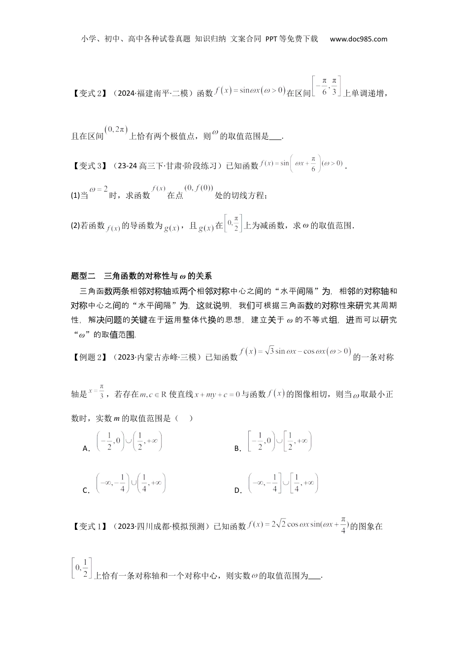 小学、初中、高中各种试卷真题知识归纳文案合同PPT等免费下载www.doc985.com培优点05三角函数中有关ω的范围问题(4种核心题型+基础保分练+综合提升练+拓展冲刺练)【考试提醒】在三角函数的图象与性质中,ω的求解是近几年高考的一个热点内容,但因其求法复杂,涉及的知识点多,历来是我们复习中的难点.【核心题型】题型一三角函数的单调性与ω的关系确定函的,根据之的包含系,建立不等式,即可求数单调区间区间间关ω的取范.值围【例题1】(2024·广东湛江·一模)已知函数在区间上单调递增,则的取值范围是()A.B.C.D.【变式1】(多选)(23-24高三上·辽宁葫芦岛·期末)已知函数在区间上单调,且满足,下列结论正确的有()A.B.若,则函数的最小正周期为C.关于方程在区间上最多有4个不相等的实数解D.若函数在区间上恰有5个零点,则的取值范围为小学、初中、高中各种试卷真题知识归纳文案合同PPT等免费下载www.doc985.com【变式2】(2024·福建南平·二模)函数在区间上单调递增,且在区间上恰有两个极值点,则的取值范围是.【变式3】(23-24高三下·甘肃·阶段练习)已知函数.(1)当时,求函数在点处的切线方程;(2)若函数的导函数为,且在上为减函数,求ω的取值范围.题型二三角函数的对称性与ω的关系三角函相或相中心之的数两条邻对称轴两个邻对称间“水平隔间”,相的和为邻对称轴中心之的对称间“水平隔间”,就明,我可根据三角函的性究其周期为这说们数对称来研性,解的在于用整体代的思想,建立于决问题关键运换关ω的不等式,而可以究组进研“ω”的取范.值围【例题2】(2023·内蒙古赤峰·三模)已知函数的一条对称轴是,若存在使直线与函数的图像相切,则当取最小正数时,实数m的取值范围是()A.B.C.D.【变式1】(2023·四川成都·模拟预测)已知函数的图象在上恰有一条对称轴和一个对称中心,则实数的取值范围为.小学、初中、高中各种试卷真题知识归纳文案合同PPT等免费下载www.doc985.com【变式2】(2024·全国·模拟预测)已知函数,若的图象在上有且仅有两条对称轴,则的取值范围是.【变式3】(2023·上海普陀·三模)设函数,其中.(1)若的最小正周期为,求的单调增区间;(2)若函数图象在上存在对称轴,求的取值范围.题型三三角函数的最值与ω的关系利用三角函的最或周期的系,可以列出于数值与对称轴关关ω的不等式(组),而求出进ω的或取范.值值围【例题3】(23-24高三上·广东·阶段练习)已知函数在区间内有最大值,但无最小值,则的取值范围是()A.B.C.D.【变式1】(2024·全国·模拟预测)已知函数满足,小学、初中、高中各种试卷真题知识归纳文案合同PPT等免费下载www.doc985.com且在区间上恰有两个最值,则实数的取值范围为.【变式2】(23-24高三下·广东·阶段练习)已知函数的图象关于原点对称,其中,,且在区间上有且只有一个最大值和一个最小值,则的取值范围为.【变式3】(23-24高三上·辽宁沈阳·阶段练习)已知函数的定义域为,若存在实数,使得对于任意都存在满足,则称函数为“自均值函数”.(1)判断函数是否为“自均值函数”,并说明理由;(2)若函数,为“自均值函数”,求的取值范围.题型四三角函数的零点与ω的关系三角函零点之的数两个间“水平隔间”,根据三角函的零点,可以究为数个数研“ω”的取.值【例题4】(2023·河南开封·模拟预测)将函数的图象向右平移个单位长度后,再将所得图象上所有点的横坐标缩短为原来的,得到函数的图象,若在区间内有5个零点,则的取值范围是()A.B.小学、初中、高中各种试卷真题知识归纳文案合同PPT等免费下载www.doc985.comC.D.【变式1】(2023·全国·三模)将函数的图像先向右平移个单位长度,再把所得函数图像的横坐标变为原来的倍,纵坐标不变,得到函数的图像,若函数在上没有零点,则的取值范围是.【变式2】(22-23高三上·宁夏银川·阶段练习)已知函数,将的图像上所有点的横坐标缩短为原来的,纵坐标不变,得到函数的图像.已知在上恰有5个零点,则的取值范围是.【变式3】(21-22高三上·福建龙岩·阶段练习)已知函数.(1)当时,函数的图象关于直线对称...