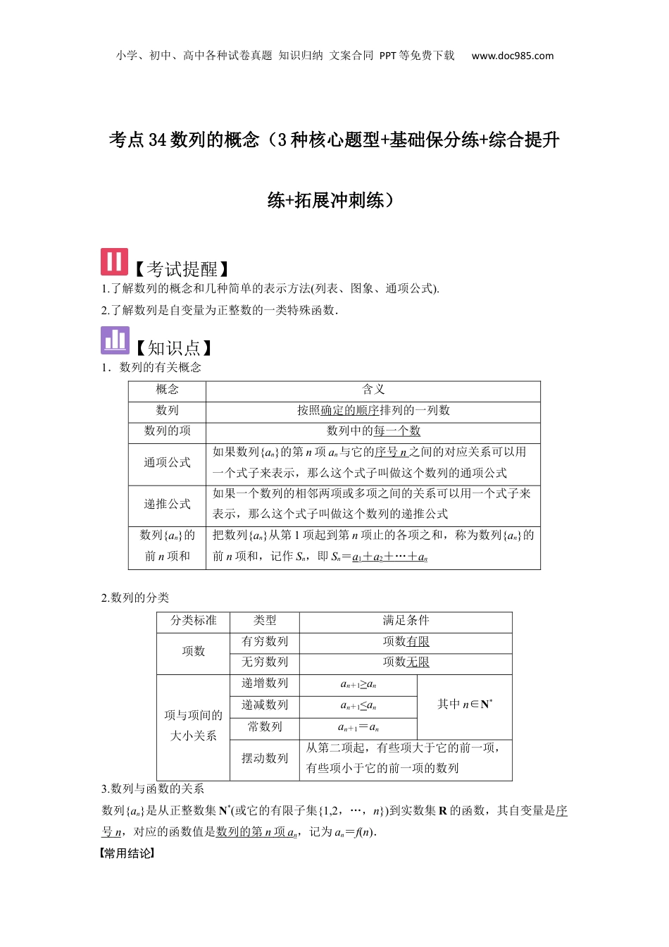 小学、初中、高中各种试卷真题知识归纳文案合同PPT等免费下载www.doc985.com考点34数列的概念(3种核心题型+基础保分练+综合提升练+拓展冲刺练)【考试提醒】1.了解数列的概念和几种简单的表示方法(列表、图象、通项公式).2.了解数列是自变量为正整数的一类特殊函数.【知识点】1.数列的有关概念概念含义数列按照确定的顺序排列的一列数数列的项数列中的每一个数通项公式如果数列{an}的第n项an与它的序号n之间的对应关系可以用一个式子来表示,那么这个式子叫做这个数列的通项公式递推公式如果一个数列的相邻两项或多项之间的关系可以用一个式子来表示,那么这个式子叫做这个数列的递推公式数列{an}的前n项和把数列{an}从第1项起到第n项止的各项之和,称为数列{an}的前n项和,记作Sn,即Sn=a1+a2+…+an2.数列的分类分类标准类型满足条件项数有穷数列项数有限无穷数列项数无限项与项间的大小关系递增数列an+1>an其中n∈N*递减数列an+1<an常数列an+1=an摆动数列从第二项起,有些项大于它的前一项,有些项小于它的前一项的数列3.数列与函数的关系数列{an}是从正整数集N*(或它的有限子集{1,2,…,n})到实数集R的函数,其自变量是序号n,对应的函数值是数列的第n项an,记为an=f(n).常用结论小学、初中、高中各种试卷真题知识归纳文案合同PPT等免费下载www.doc985.com1.已知数列{an}的前n项和Sn,则an=2.在数列{an}中,若an最大,则(n≥2,n∈N*);若an最小,则(n≥2,n∈N*).【核心题型】题型一由an与Sn的关系求通项公式Sn与an的系的求解思路关问题(1)利用an=Sn-Sn-1(n≥2)化只含转为Sn,Sn-1的系式,再求解.关(2)利用Sn-Sn-1=an(n≥2)化只含转为an,an-1的系式,再求解.关【例题1】(2023·四川·三模)已知数列满足,则的通项公式为()A.B.C.D.【答案】B【分析】由题中等式,可得,再结合时,可得.【详解】当时,有,所以,当时,由,,两式相减得,此时,,也满足,小学、初中、高中各种试卷真题知识归纳文案合同PPT等免费下载www.doc985.com所以的通项公式为.故选:B.【变式1】(2024·江苏南通·三模)设数列的前项和为,若,则()A.65B.127C.129D.255【答案】B【分析】降次作差得,再利用等比数列通项公式即可得到答案.【详解】时,,则.时,,,是2为首项,2为公比的等比数列,,故选:B.【变式2】(23-24高三上·上海徐汇·阶段练习)已知数列的前项和,.若是等差数列,则的通项公式为.【答案】【分析】利用等差数列的定义以及的关系即可得出结论.【详解】由知,当时,;当时,,小学、初中、高中各种试卷真题知识归纳文案合同PPT等免费下载www.doc985.com此时,当时,,当时,,而,若数列是等差数列,则,所以,则.故答案为:.【变式3】(2024·黑龙江哈尔滨·模拟预测)已知数列前n项的积为,数列满足,(,).(1)求数列,的通项公式;(2)将数列,中的公共项从小到大排列构成新数列,求数列的通项公式.【答案】(1),(2)【分析】(1)对,两边同时取对数,分是否等于讨论即可求出,由等差数列定义即可求出;(2)令,解出即可得解.【详解】(1),,当时,,小学、初中、高中各种试卷真题知识归纳文案合同PPT等免费下载www.doc985.com当时,,即,而,从而数列的通项公式为;若数列满足,(,),则,从而数列的通项公式为;(2)令,解得,这表明,从而只能,所以数列的通项公式为题型二由数列的递推关系求通项公式(1)形如an+1-an=f(n)的列,利用累加法.数(2)形如=f(n)的列,利用数an=a1···…·(n≥2)即可求列数{an}的通公式.项命题点1累加法【例题2】(2024·河北保定·三模)设是公差为3的等差数列,且,若,则()A.21B.25C.27D.31【答案】D【分析】由,得,从而可得,进而可求解.【详解】由,得,则,从而.小学、初中、高中各种试卷真题知识归纳文案合同PPT等免费下载www.doc985.com故选:D【变式1】(2024·河南·三模)已知函数满足:,且,,则的最小值是()A.135B.395C.855D.990【答案】C【分析】构造函数,可得,令,由得,从而得到,即可求出的最小值.【详解】由,得,令,得,令,得,故,又,所以,...