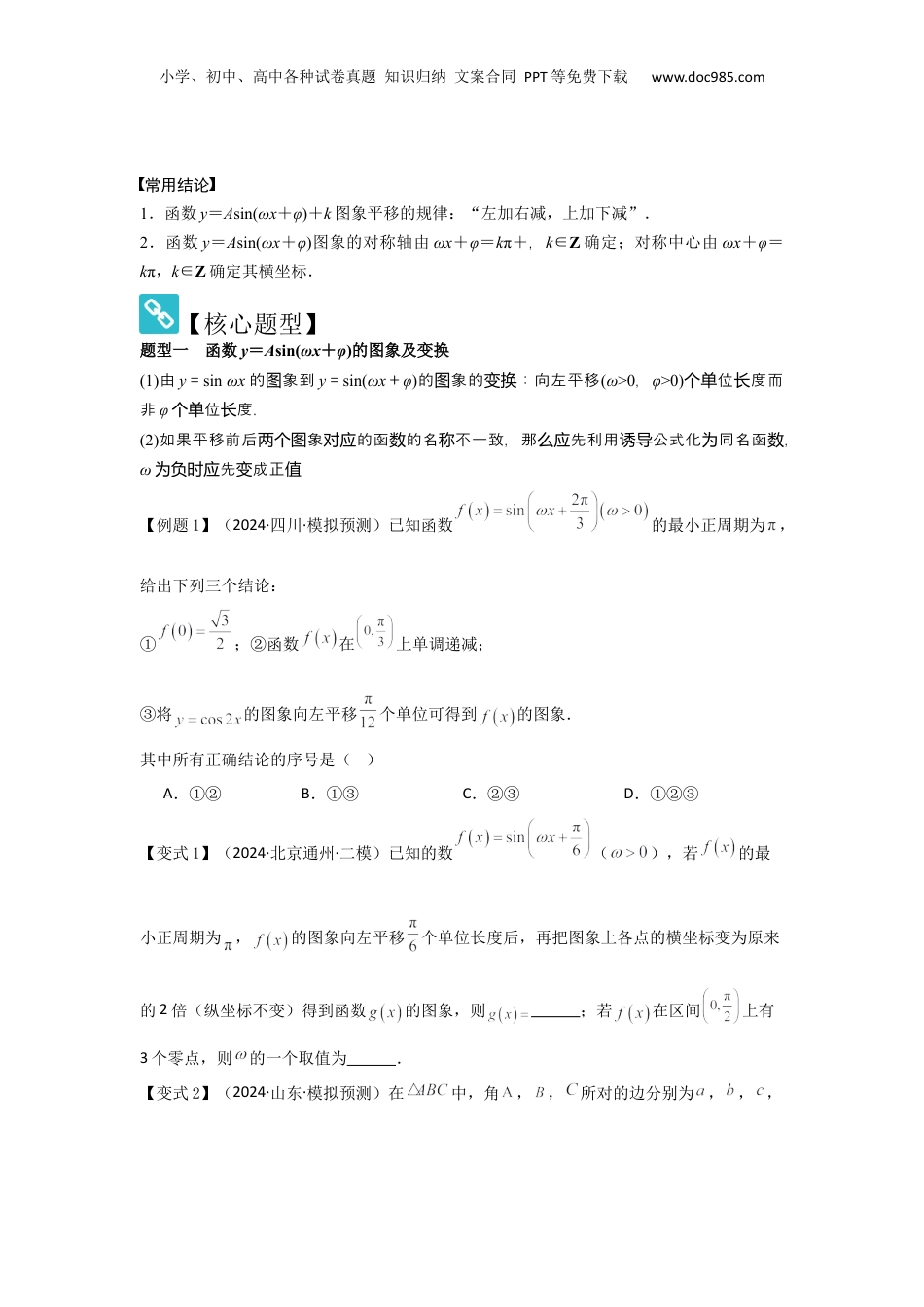 小学、初中、高中各种试卷真题知识归纳文案合同PPT等免费下载www.doc985.com考点27函数y=Asin(ωx+φ)(3种核心题型+基础保分练+综合提升练+拓展冲刺练)【考试提醒】1.结合具体实例,了解y=Asin(ωx+φ)的实际意义;能借助图象理解参数ω,φ,A的意义,了解参数的变化对函数图象的影响.2.会用三角函数解决简单的实际问题,体会可以利用三角函数构建刻画事物周期变化的数学模型.【知识点】1.简谐运动的有关概念已知函数y=Asin(ωx+φ)(A>0,ω>0),x≥0振幅周期频率相位初相AT=_____f==ωx+φφ2.用“五点法”画y=Asin(ωx+φ)(A>0,ω>0)一个周期内的简图时,要找五个特征点ωx+φ0π2πxy=Asin(ωx+φ)0A0-A03.函数y=sinx的图象经变换得到y=Asin(ωx+φ)(A>0,ω>0)的图象的两种途径小学、初中、高中各种试卷真题知识归纳文案合同PPT等免费下载www.doc985.com常用结论1.函数y=Asin(ωx+φ)+k图象平移的规律:“左加右减,上加下减”.2.函数y=Asin(ωx+φ)图象的对称轴由ωx+φ=kπ+,k∈Z确定;对称中心由ωx+φ=kπ,k∈Z确定其横坐标.【核心题型】题型一函数y=Asin(ωx+φ)的图象及变换(1)由y=sinωx的象到图y=sin(ωx+φ)的象的:向左平移图变换(ω>0,φ>0)位度而个单长非φ位度.个单长(2)如果平移前后象的函的名不一致,那先利用公式化同名函两个图对应数称么应诱导为数,ω先成正为负时应变值【例题1】(2024·四川·模拟预测)已知函数的最小正周期为,给出下列三个结论:①;②函数在上单调递减;③将的图象向左平移个单位可得到的图象.其中所有正确结论的序号是()A.①②B.①③C.②③D.①②③【变式1】(2024·北京通州·二模)已知的数(),若的最小正周期为,的图象向左平移个单位长度后,再把图象上各点的横坐标变为原来的2倍(纵坐标不变)得到函数的图象,则;若在区间上有3个零点,则的一个取值为.【变式2】(2024·山东·模拟预测)在中,角,,所对的边分别为,,,小学、初中、高中各种试卷真题知识归纳文案合同PPT等免费下载www.doc985.com函数,图象的相邻两对称轴间的距离为,且,将的图象向右平移个单位得到的图象且,的内切圆的周长为.则的面积的最小值为.【变式3】(2024·全国·模拟预测)将函数图象上所有点的横坐标伸长至原来的2倍(纵坐标不变),再向左平移个单位长度,得到函数的图象.(1)求函数在区间内的所有零点之和;(2)若,讨论函数的单调性.题型二由图象确定y=Asin(ωx+φ)的解析式确定y=Asin(ωx+φ)+b(A>0,ω>0)的步和方法骤(1)求A,b.确定函的最大数值M和最小值m,则A=,b=.(2)求ω.确定函的最小正周期数T,则ω=.(3)求φ.常用方法如下:把象上的一已知点代入图个(此要注意点在上升上是在下时该区间还降上区间)或把象的最高点或最低点代入.图小学、初中、高中各种试卷真题知识归纳文案合同PPT等免费下载www.doc985.com【例题2】(2024·陕西西安·模拟预测)已知函数的部分图象如图所示,将函数的图象向左平移个单位长度后得到函数的图象,则在下列区间上函数单调递增的是()A.B.C.D.【变式1】(2024·海南·模拟预测)如图是某质点做简谐运动的部分图像,该质点的振幅为2,位移与时间满足函数,点在该函数的图象上,且位置如图所示,则.【变式2】(2024·湖北武汉·二模)函数的部分图象如图所示,则.小学、初中、高中各种试卷真题知识归纳文案合同PPT等免费下载www.doc985.com【变式3】(2023·河北·模拟预测)已知函数的部分图象如图所示,其中,且.(1)求与的值;(2)若斜率为的直线与曲线相切,求切点坐标.题型三三角函数图象、性质的综合应用(1)究研y=Asin(ωx+φ)的性可质时将ωx+φ一整体,利用元法和形合思想视为个换数结进行解.题(2)方程根的可化函象的交点.个数转为两个数图个数(3)三角函模型的用体在方面:一是已知函模型求解;二是把数应现两数数学问题实际问题抽象化成,利用三角函的有知解.转数学问题数关识决问题命题点1图象与性质的综合应用【例题3】(2024·四川·模拟预测)已知函数的最小正周小学、初中、高中各种试卷真题知识归纳文案合...